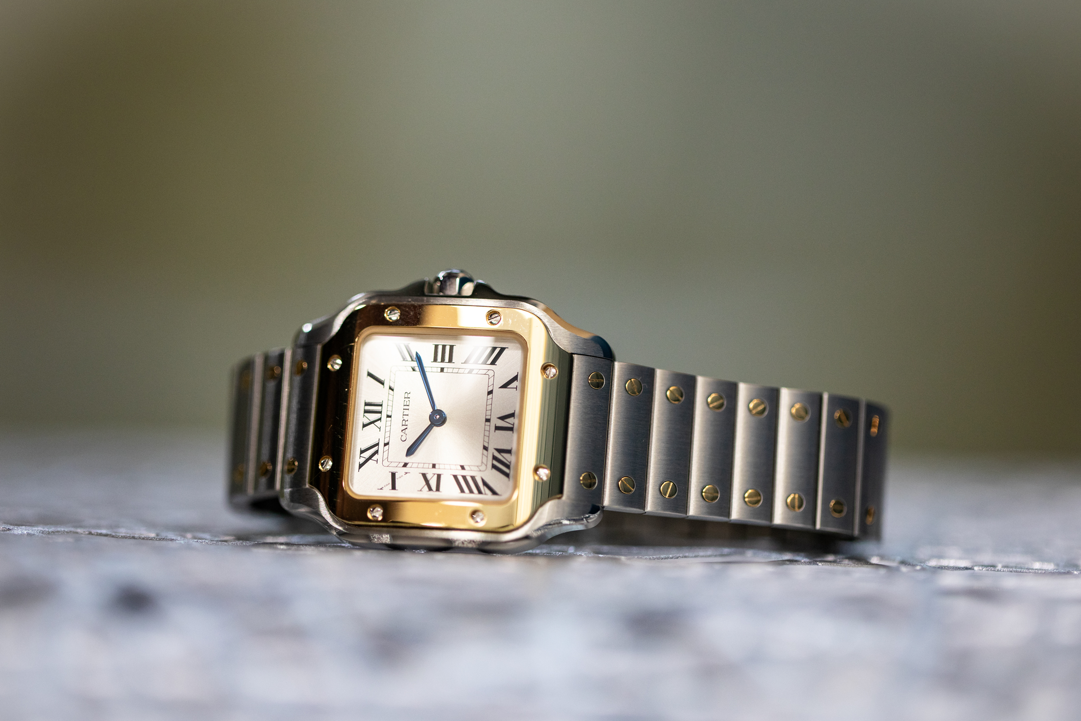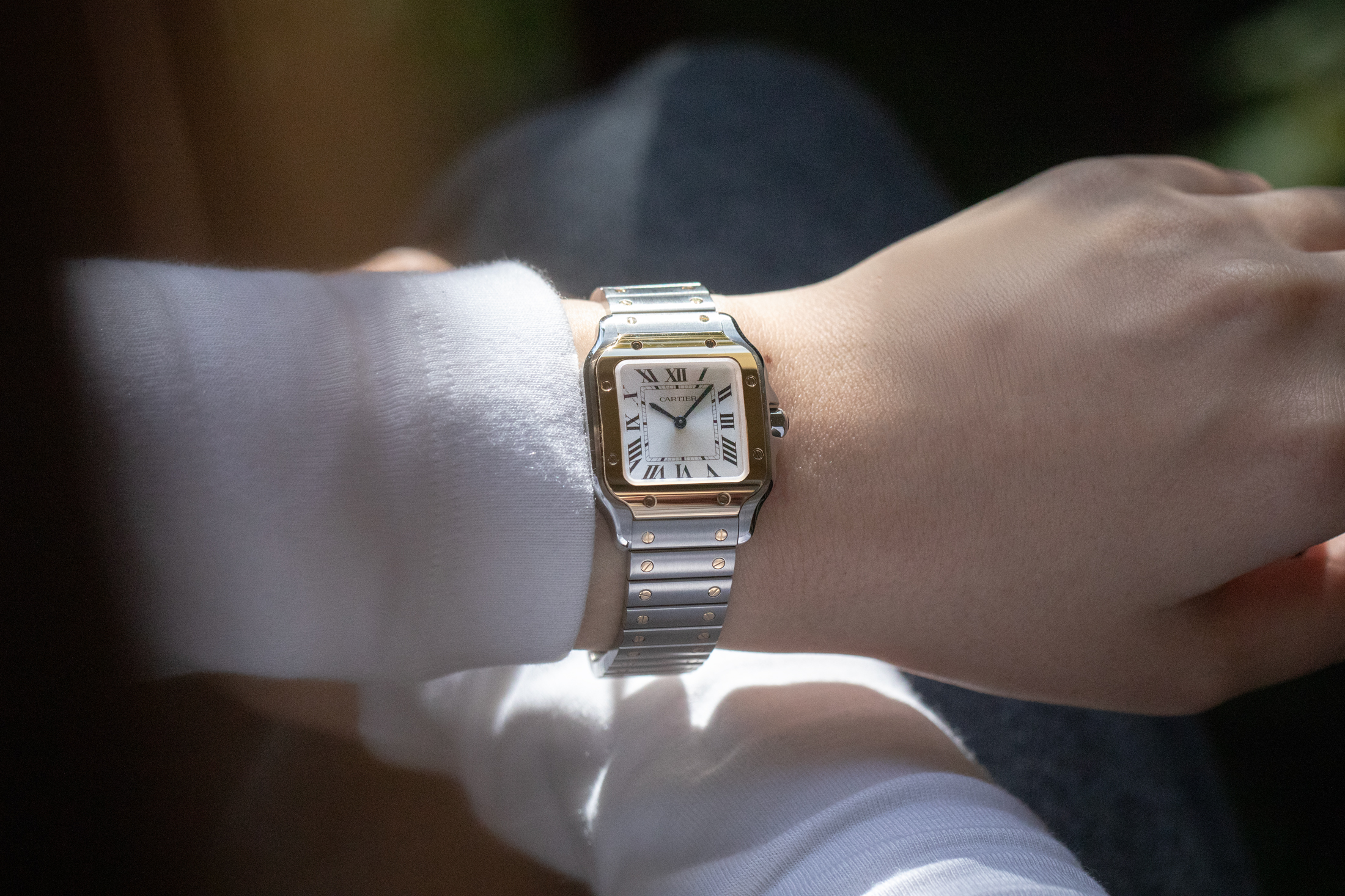 今回紹介するサントス ドゥ カルティエは、1978年のサントス ガルベをルーツに持つ現行サントスに加わったスモールサイズ。端正なスクエアケースとビス留めのベゼルは、サントスコレクションのアイコンそのものだ。着用すると、小ぶりながら手首に心地よい重みがある。特にステンレス×ゴールドのコンビモデルは、手持ちのジュエリーの色を選ばず毎日の服にも合わせやすい。さらにスモールモデルにもインターチェンジブルシステムが搭載されており、カルティエの豊富な交換ストラップを気軽に組み合わせられるのもうれしい。