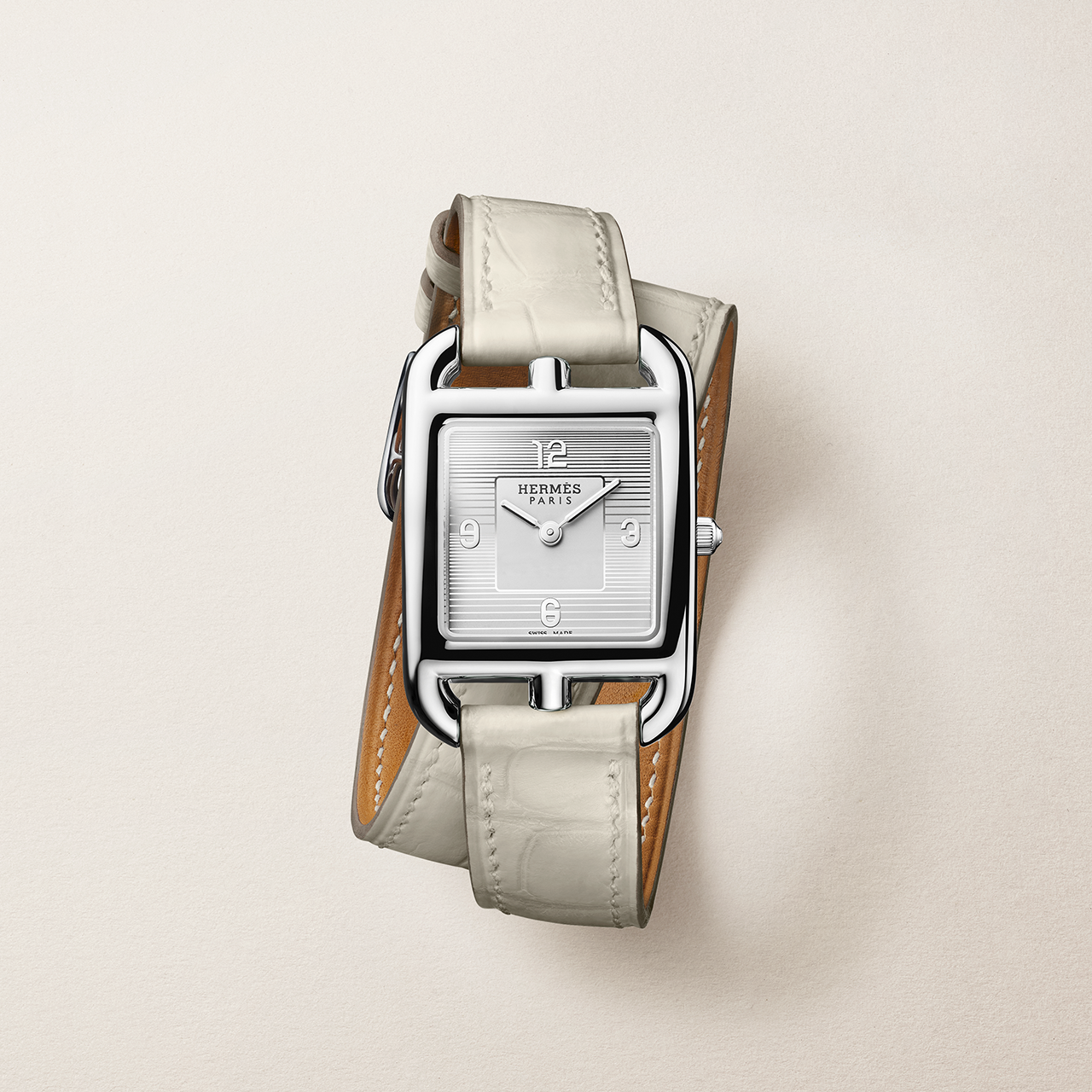 エルメスの時計のなかでも、レザーやジュエリーの気配がいちばん自然に表れるのがケープコッドだ。1991年にアンリ・ドリニー(Henri d’Origny)氏が、シェーヌ・ダンクル(船の錨の鎖をモチーフにしたメゾンのアイコニックなジュエリーコレクション)から着想を得て生み出したこのモデルは、端正なスクエアにやわらかな丸みを重ねたケース形状が特徴で、堅すぎないのにきちんと見える。この絶妙なバランスこそエルメスらしく、普段の服でも自然に上品に見せてくれる。
