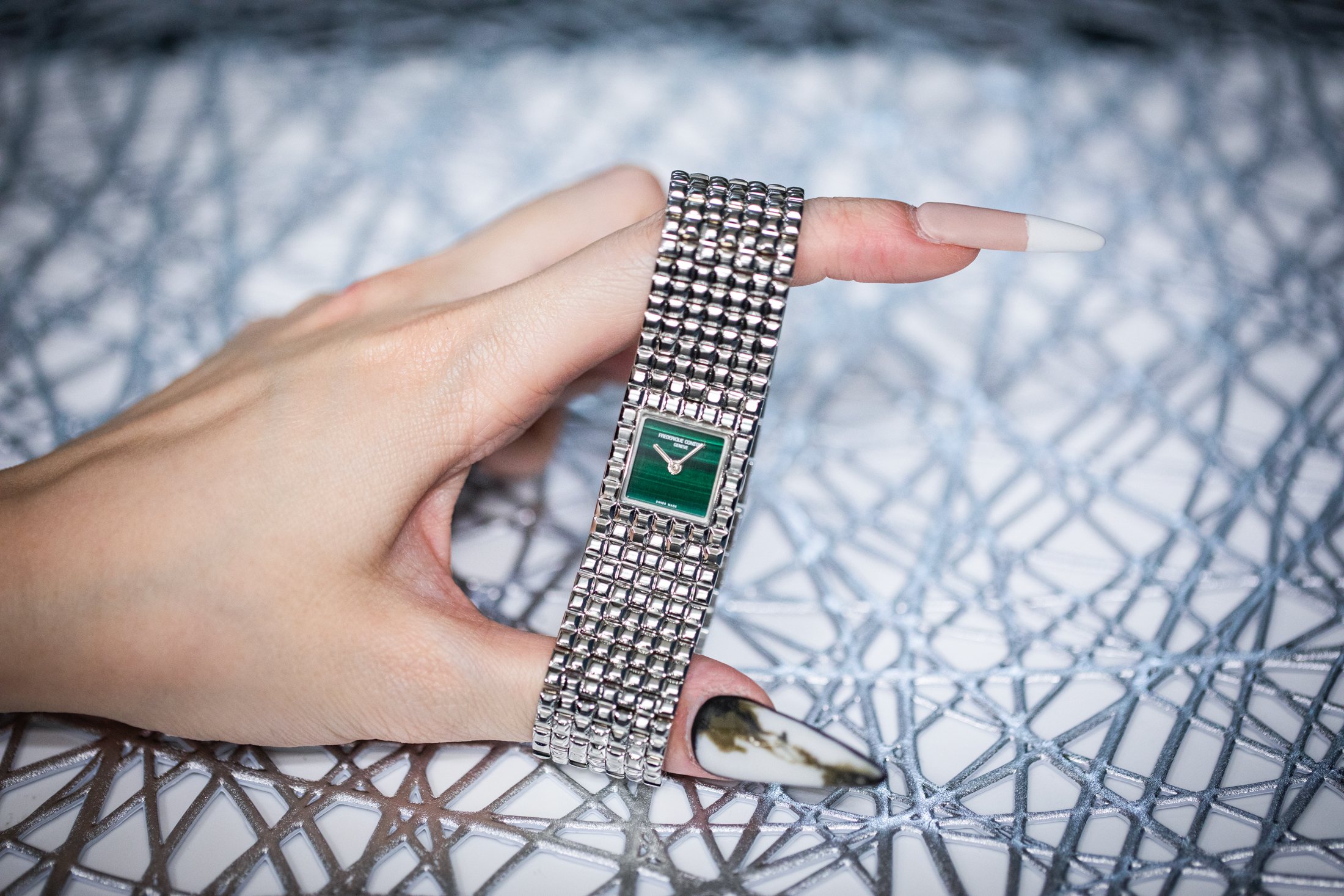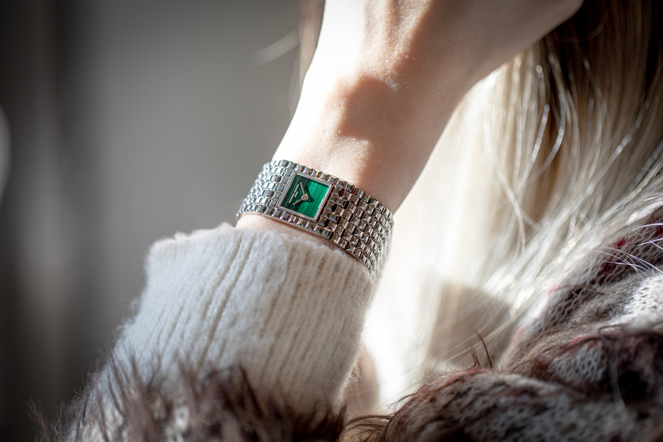 さらにマラカイトの天然石ダイヤルがいい。ストーンの表情に個体差があるので選ぶ行為そのものが楽しく、手に入れた瞬間から自分の1本になっていく感覚がある。25.7×20mmの小ぶりなサイズにクォーツを搭載するのも、時計をジュエリー感覚で楽しむうえで理にかなっている。その日の服や気分に合わせて手元を仕上げるアクセサリーのように使えて、装いの一部としてすっとなじむのだ。