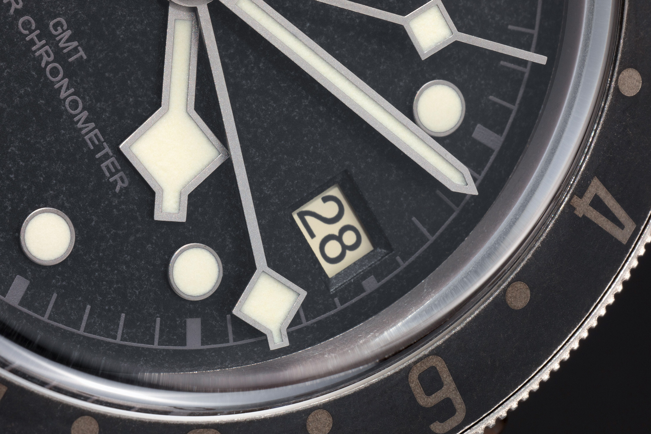 スタンダードなブラックベイ GMTをベースに、"秘伝のステンレススティールエイジング技術 "を駆使して、色褪せたような使い込まれた風合いを表現したユニークなモデルが、ブラックベイ GMT ワン for Only Watch 2021だ。この質感の高い仕上げは、マッチしたダークグレーのベゼル、グレーのハンドセット、そしてダイヤルの夜光プロットと暖かい色でマッチした日付ディスクによって完成されている。ブラックベイはモノトーンの外観を見事に纏い、独自の仕上げも十分にクールだと思うが、マットなダークグレーの文字盤にマッチした落ち着いたマットなルチニウムのハンドセットが僕の心を捉えた。あえてモノトーンで仕上げられたGMT針はオリジナルとの違いを感じさせ、とても気に入った。