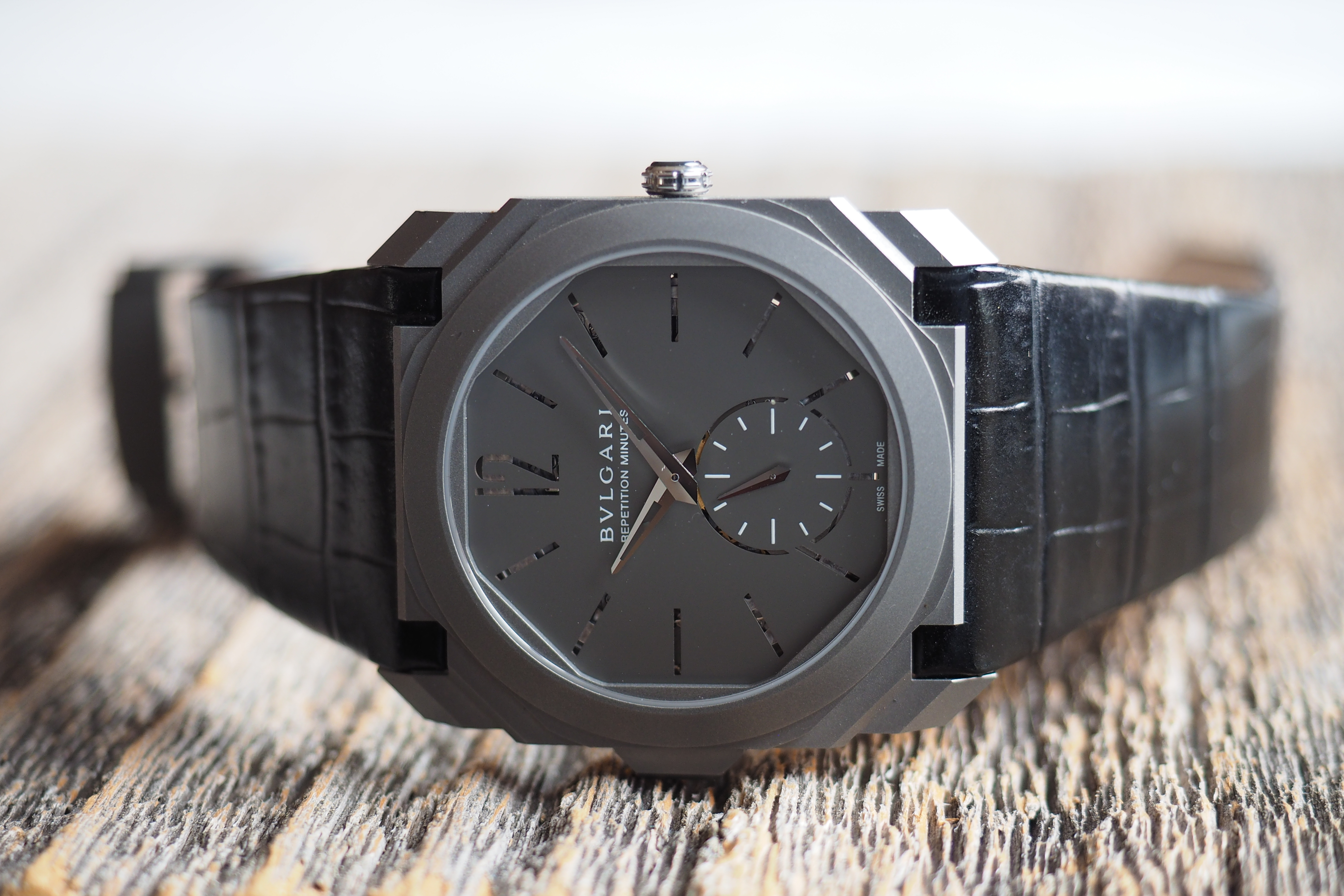 ブルガリ オクト フィニッシモ ミニッツリピーター:ムーブメント、ブルガリ Cal.BVL362、時・分表示、スモールセコンド、ミニッツリピーター。2万1600 振動/時 、3.12 mm×28.5 mm、42時間パワーリザーブ。 チタンケース、40mm×6.85mm、防水30m。価格、1816万円(税抜)