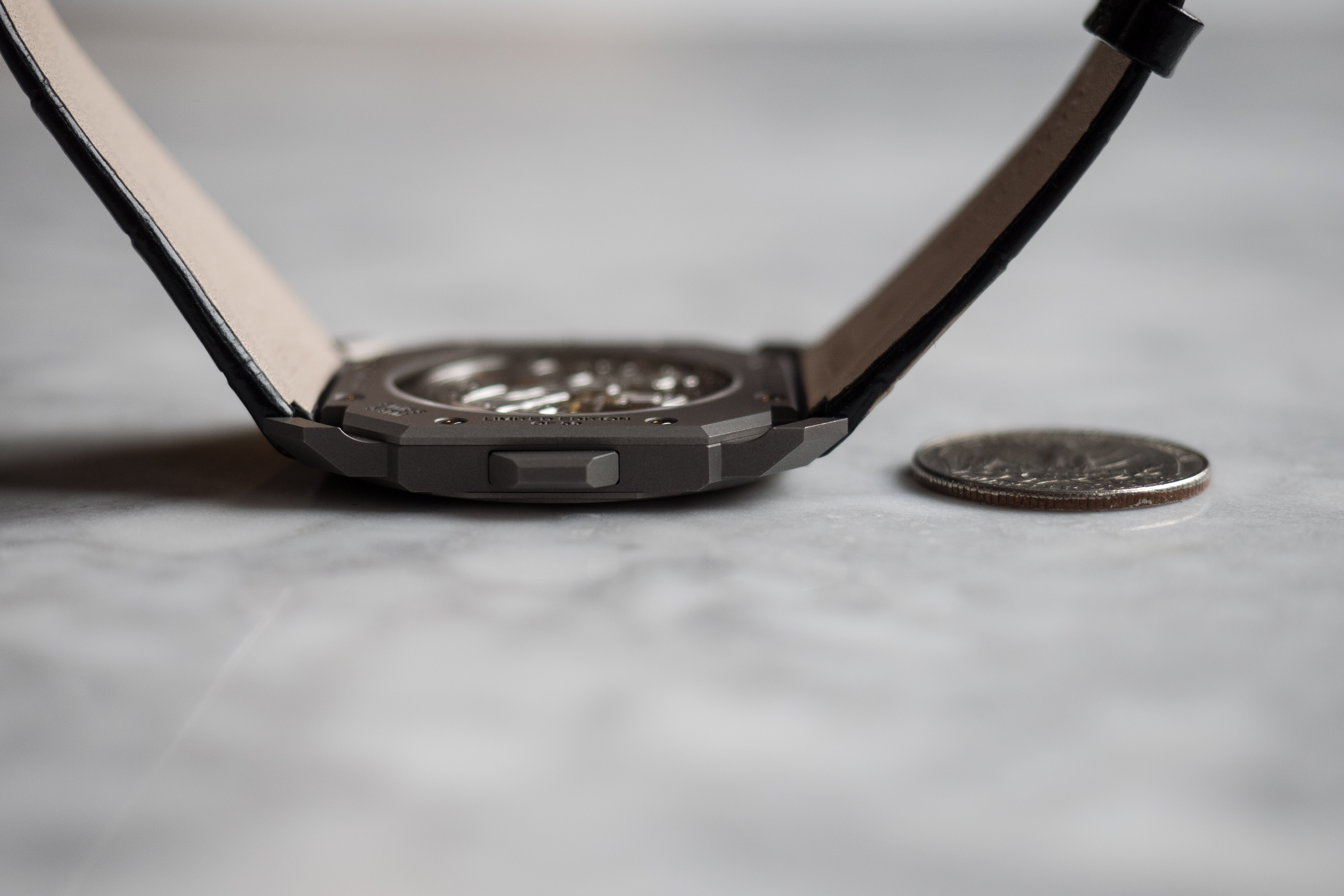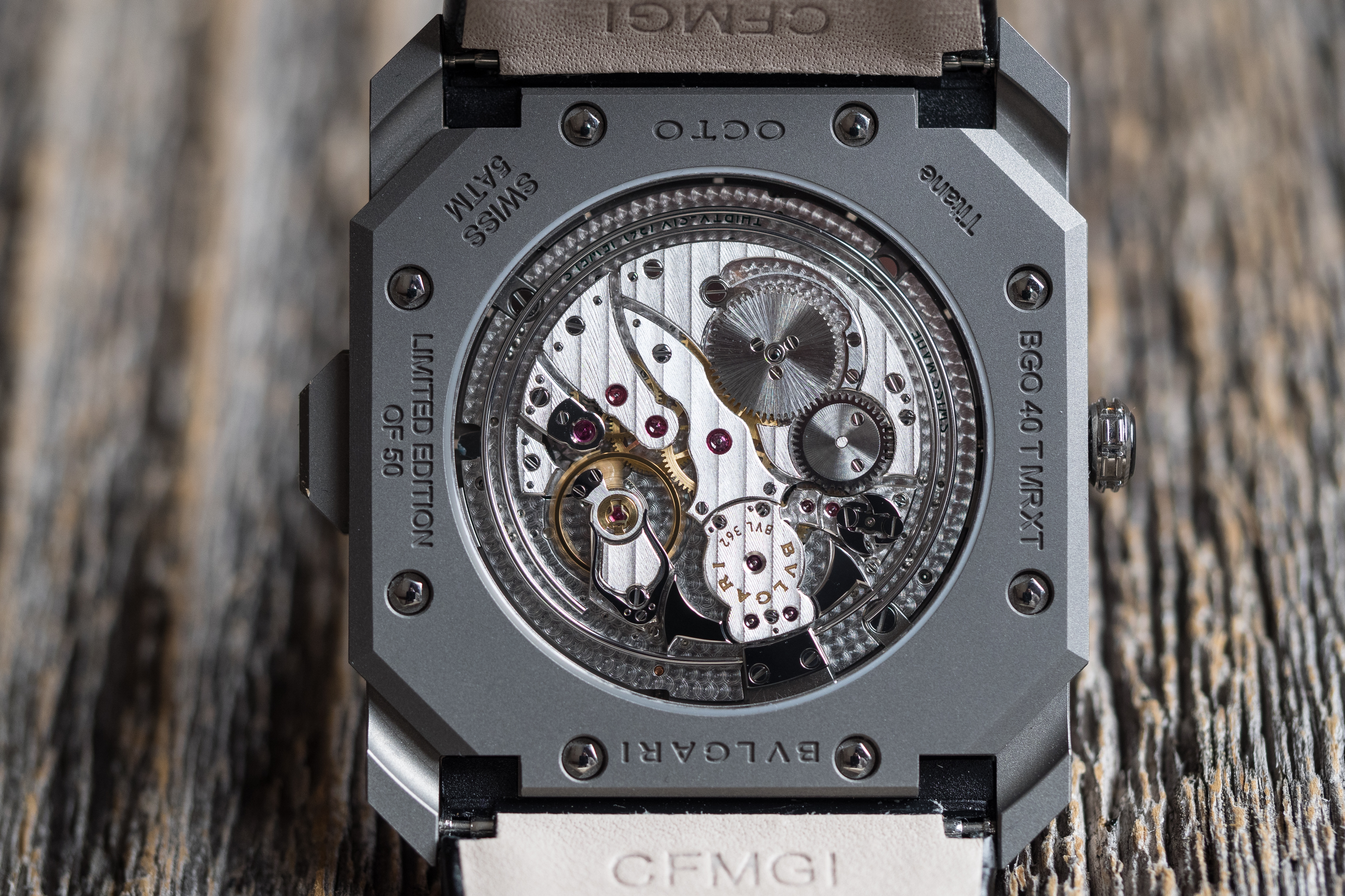 オクト フィニッシモ ミニッツリピーターのケースは非常にモダンな外観をしているが、ブルガリの長年のデザインワークの多くを特徴づける直線的で建築的な雰囲気ももち合わせている。力強く統一されたデザインを主張するクリーンでシンプルなラインは、常にブルガリの得意とするところであり、本機もその伝統を受け継いでいる。 ケースとダイヤルは共にチタン製で、サイズは40mm×6.85mm、防水性能は30mと、確かにヴィンテージリピーターにはない30mの防水性能を備えているのだ。