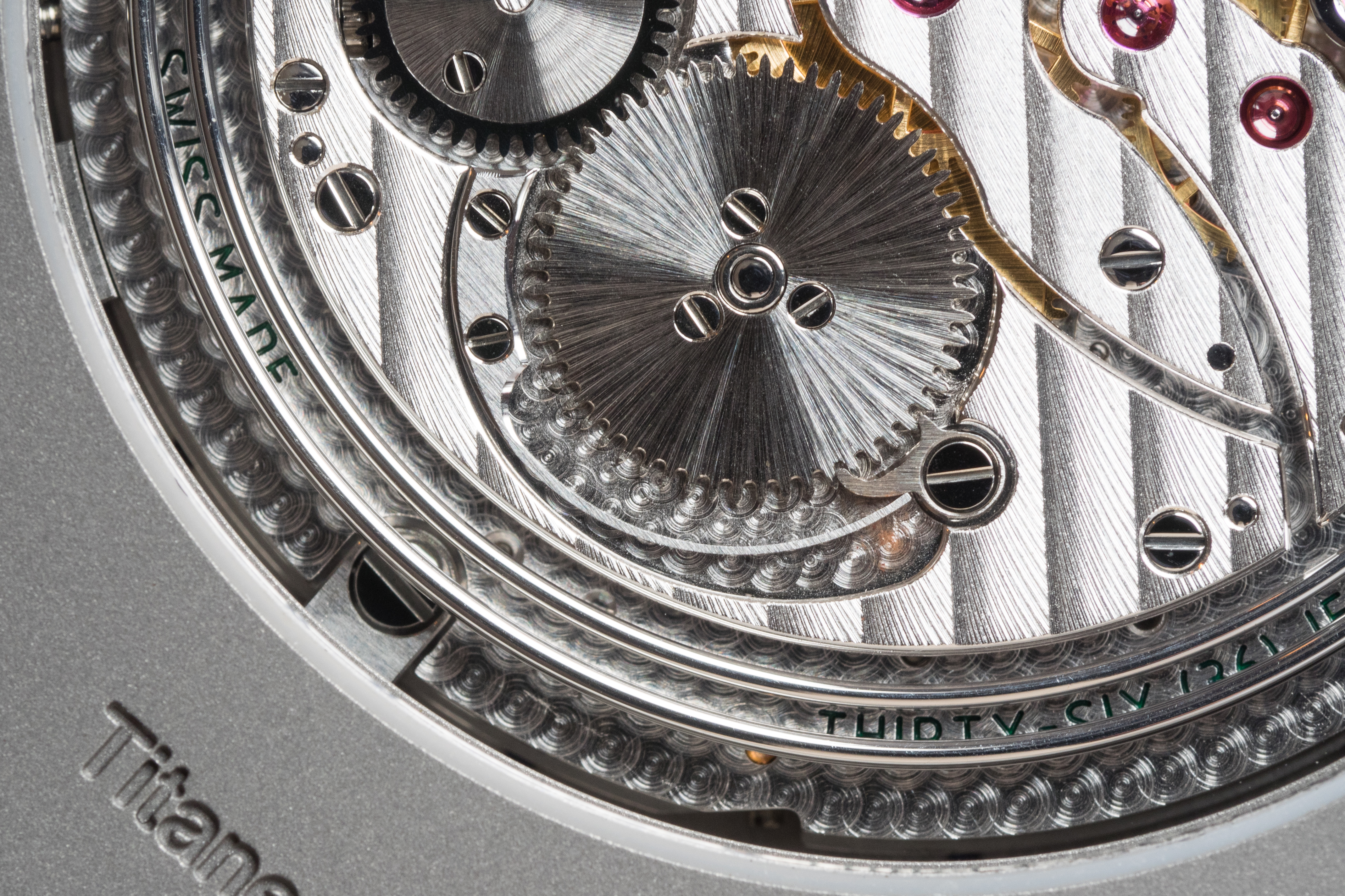 このような薄くて小さなムーブメントにしては、本機の音色は驚くべきものだ。これはケース素材によるところもあるが、ダイヤルのマーカーを物理的な開口部にし、音波が外に伝わりやすくするなど、ケースデザインに工夫を凝らしたことも影響している。撮影した動画とサウンドは、伝統的手法で構築されたリピーターの音の特性を最高の状態で再現している:クリアで非常に音楽的なクオリティで、そのバックグラウンドでは、伝統的なアンクル脱進機の繊細な作動音も聞くことができる。