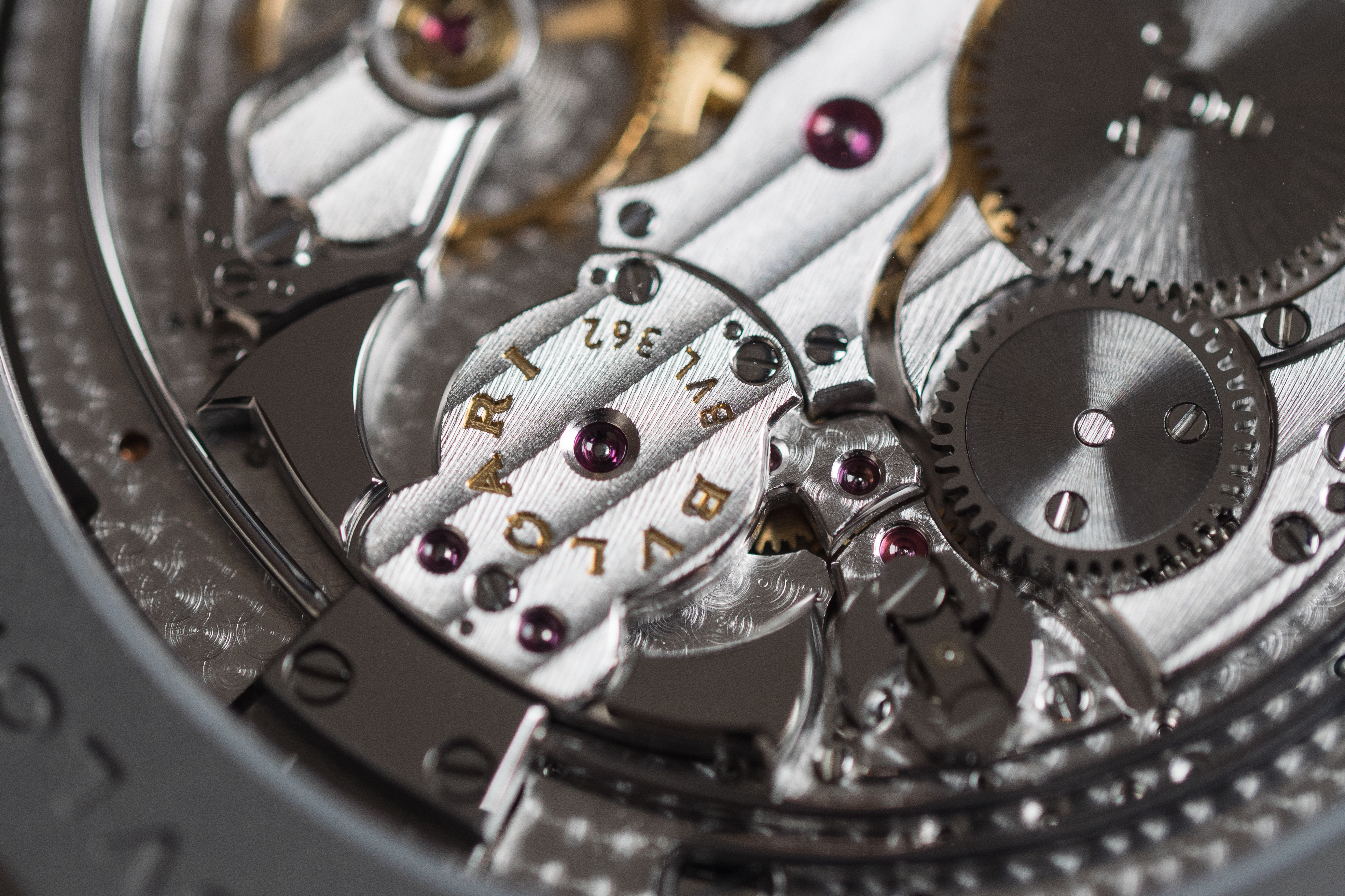 Cal.BVL362は、あらゆる面で非常に伝統的なムーブメントであり、非常に興味深い歴史をもっている。 その起源は1981年、ジェラルド・ジェンタが、厚さわずか2.72mmというユニークなミニッツリピーターを製作したことに遡る。それはムーブメントとケースを含めた厚さで、自動巻きでもあった。当時の極薄時計によくあることだが、この時計はあまりにも繊細すぎて生産に至らなかった。しかし、ムーブメントはより信頼性の高いものにするために再設計され(多少厚みがあるものの)、ブルガリがダニエル・ロートとジェラルド・ジェンタを買収した際には、そのデザインも取得し、生産を開始することにした。これは現在生産されている中で最も薄いリピータームーブメントであり、最も薄いリピーターウォッチでもある。また、他の多くの近年のリピーターとは異なり、この時計は純粋に伝統的な時計製造によって作られているのだ。私の知る限り、この薄さに勝る唯一の腕時計ムーブメントは、厚さ3.1mmといわれているヴァシュロン・コンスタンタンの4261に使用されているものだ。これは、時計学的にみても非常に美しい。