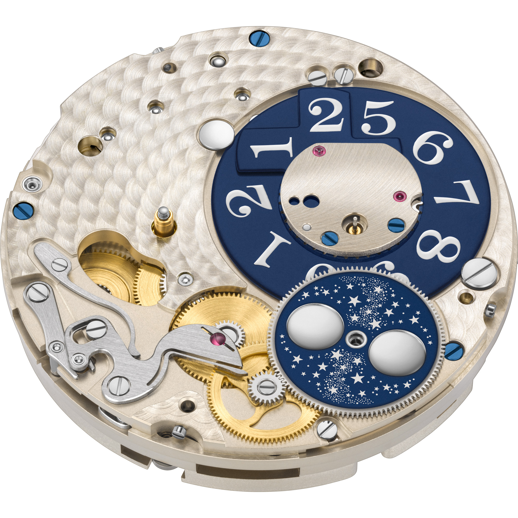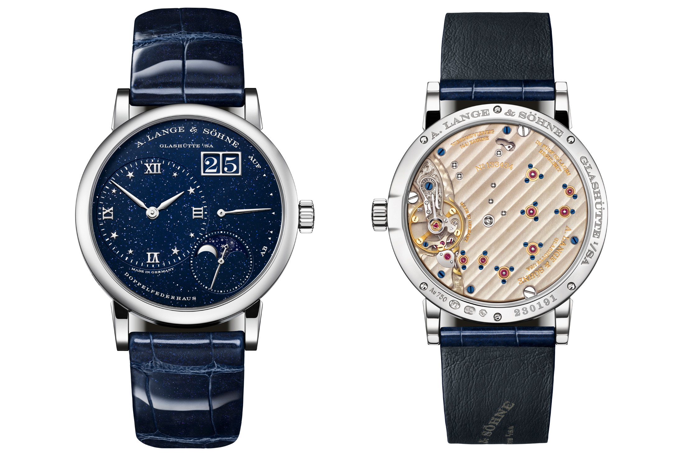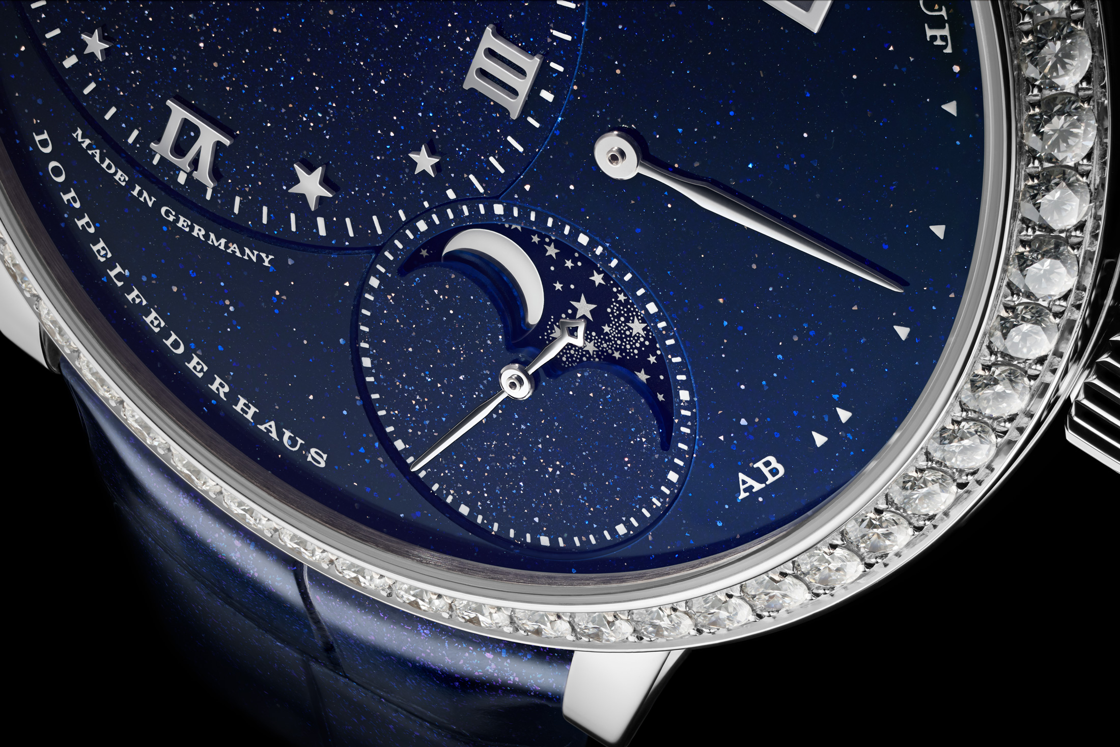 ムーンフェイズという複雑機構には本質的に詩的なものがありますが、最新のリトル・ランゲ1・ムーンフェイズは、そのアイデアをさらに進化させたものとなっています。本モデルは、夜空のような輝きを放つダークブルーの“ゴールドストーン(紫金石)”を素材に用いた新しいダイヤルが特徴です。