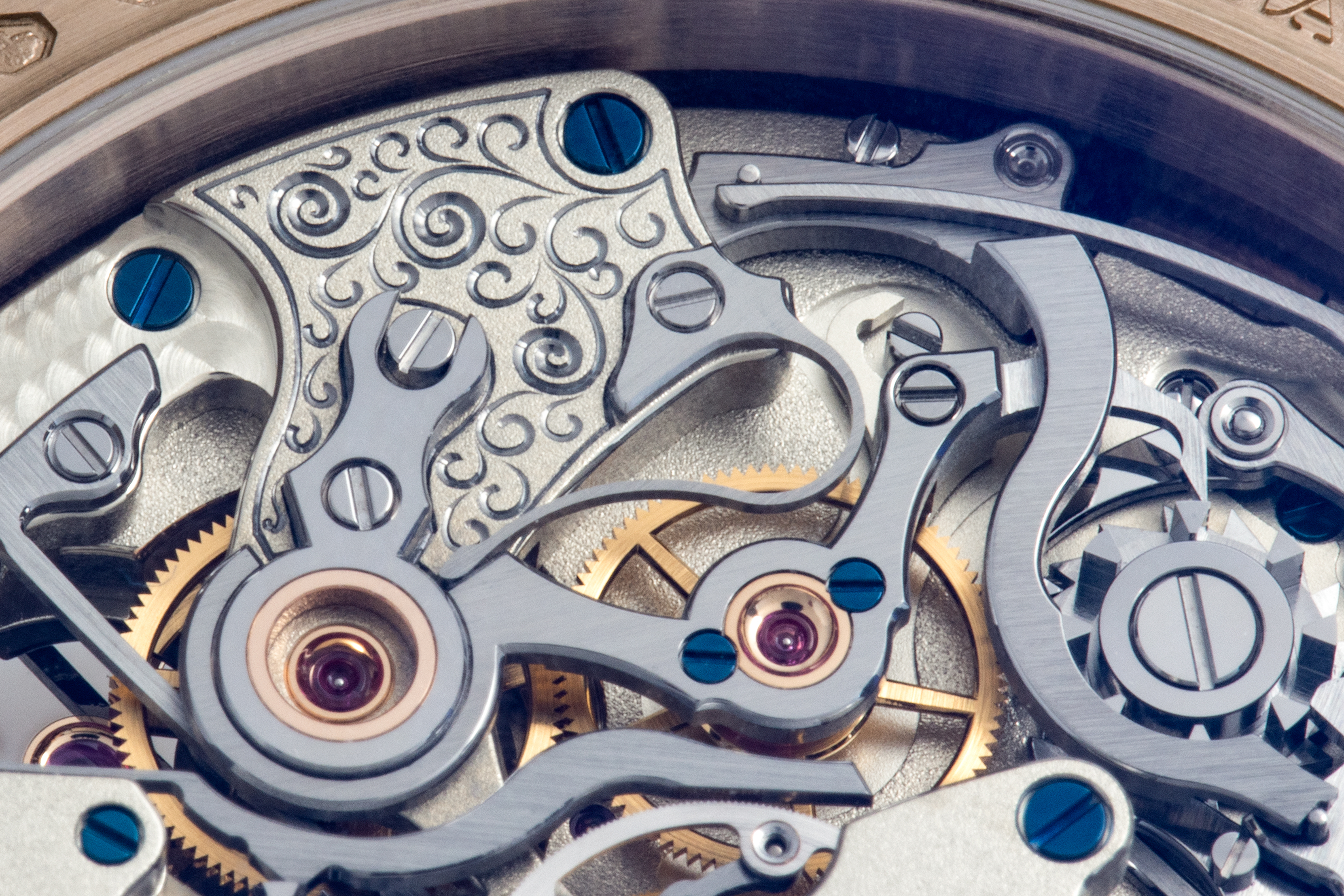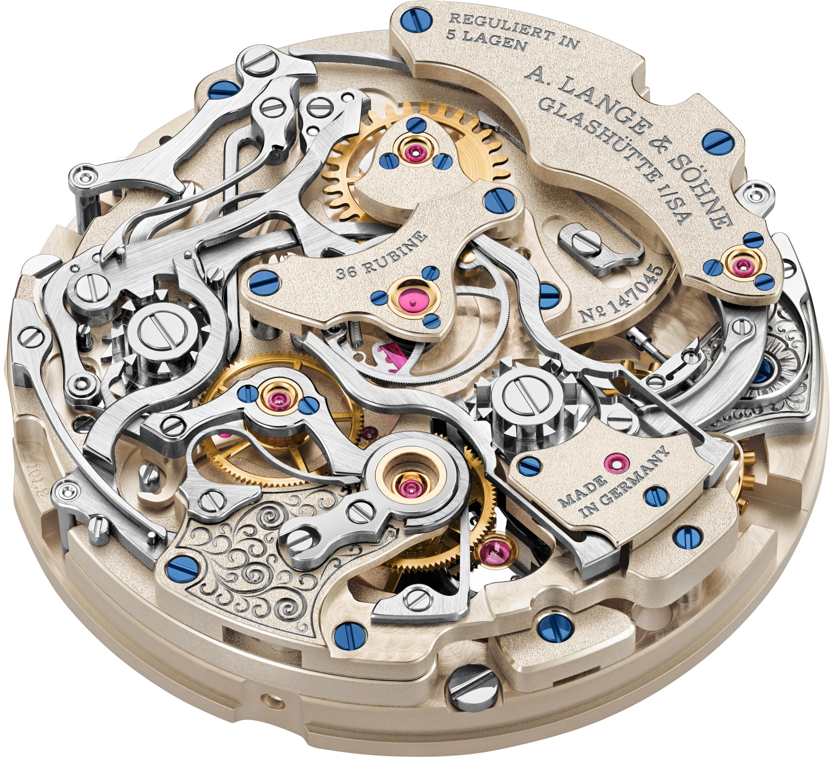 A. ランゲ&ゾーネでは、ラトラパンテ・クロノグラフに2つの異なるアプローチを採って実装した。ダブルスプリットやトリプルスプリットでは、スプリットセコンドの歯車を停止させた時に生じる摩擦を軽減するアイソレーション(分離)機構を採用している。トゥールボグラフや1815 ラトラパンテ(1815 ラトラパント・パーペチュアル・カレンダーおよび1815 ラトラパント・ハニーゴールド“F. A.ランゲへのオマージュ”)では、スプリットセコンド車の下にあるハート型のカムと、彼が“引き紐”と呼ぶ小さなスティール製コイルを使った、よりクラシカルな方式を採用している。