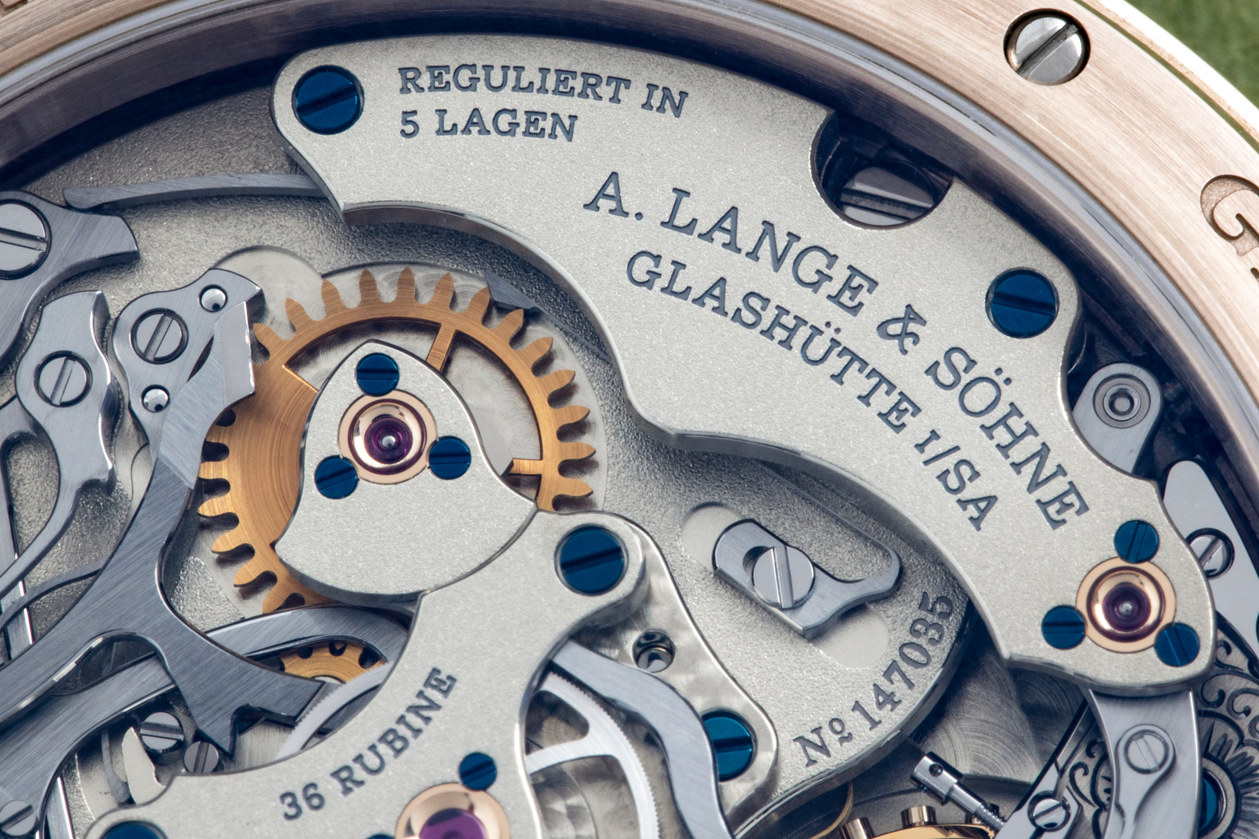 センターブリッジの36 RUBINEの“36”の真下を見ると、小さなバネがあるのがわかる。これが、1815 ラトラパント・ハニーゴールド“F. A.ランゲへのオマージュ”や1815 ラトラパント・パーペチュアル・カレンダー、トゥールボグラフなどのラトラパンテ機構を実装している。