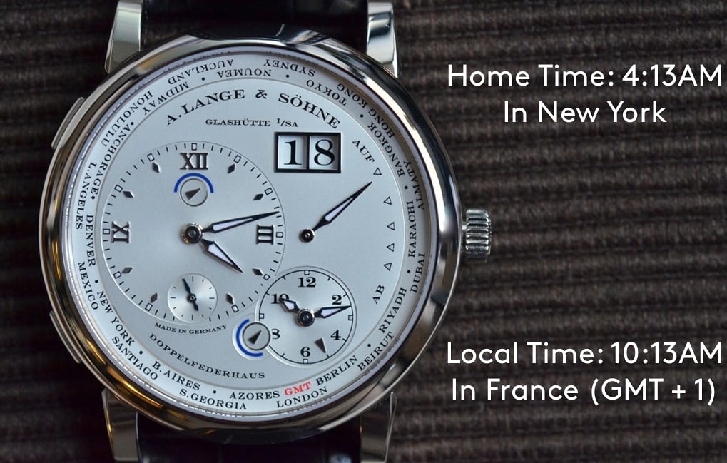 上述したように、第二時間帯は小さいダイヤルの方の5時位置にある小さな矢印で示されている。下の写真では、第二時間帯がGMT +1(ベルリン)であることが分かるだろう。
