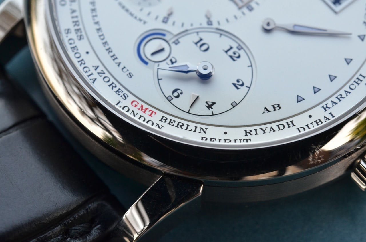 解説を続ける前に一つはっきりさせておこう。このランゲはランゲ1シリーズの中でも最も実用的な時計の一つだが、ワールドタイマーではない。多くの消費者は、この時計をひと目見ただけで、ダイヤルを取り囲むクールな都市リングを見て、この時計をそうだと思うかもしれない。これは何を意味するかというと、時計は一度に全てまたは“いくつかの”タイムゾーンを表示するのではなく(24ゾーンが、真の“ワールドタイマー”とみなされるためのしきい値だ)、2つのタイムゾーンのみ表示する。これは決して悪いことではないが、ヴァシュロン・コンスタンタン パトリモニー・トラディショナル・ワールドタイムやパテック フィリップ Ref.5130のように、一度に37タイムゾーン(前者)と24タイムゾーン(後者)を表示する時計と比較されないように注意が必要な点でもある。しかし、ランゲは日付表示機能を備えており、他の2つの時計よりも読みやすいダイヤルを備えている。まあ、話が脱線したのでここでやめておこう。