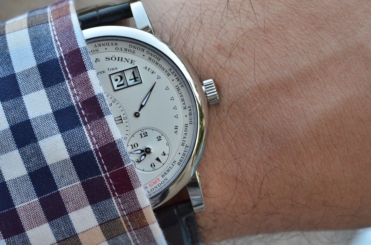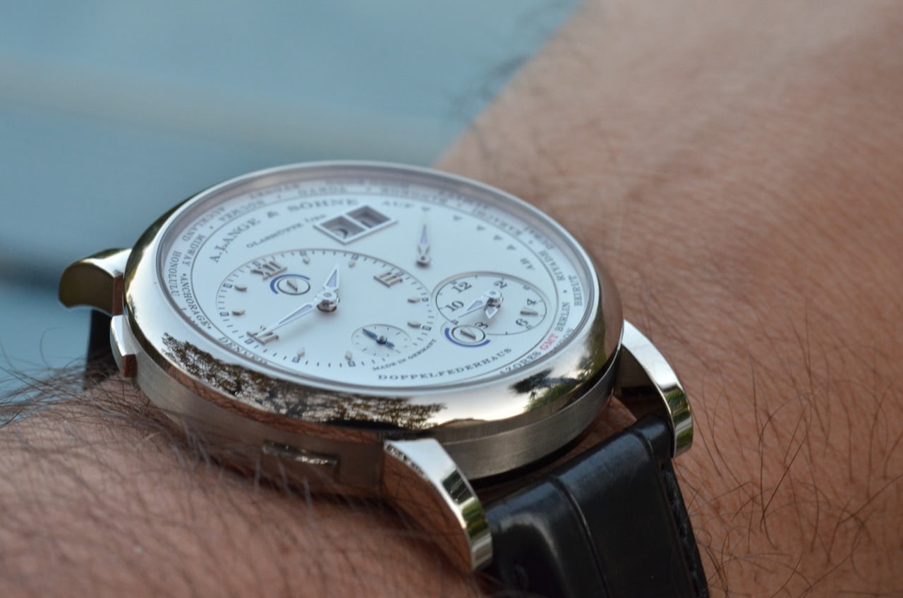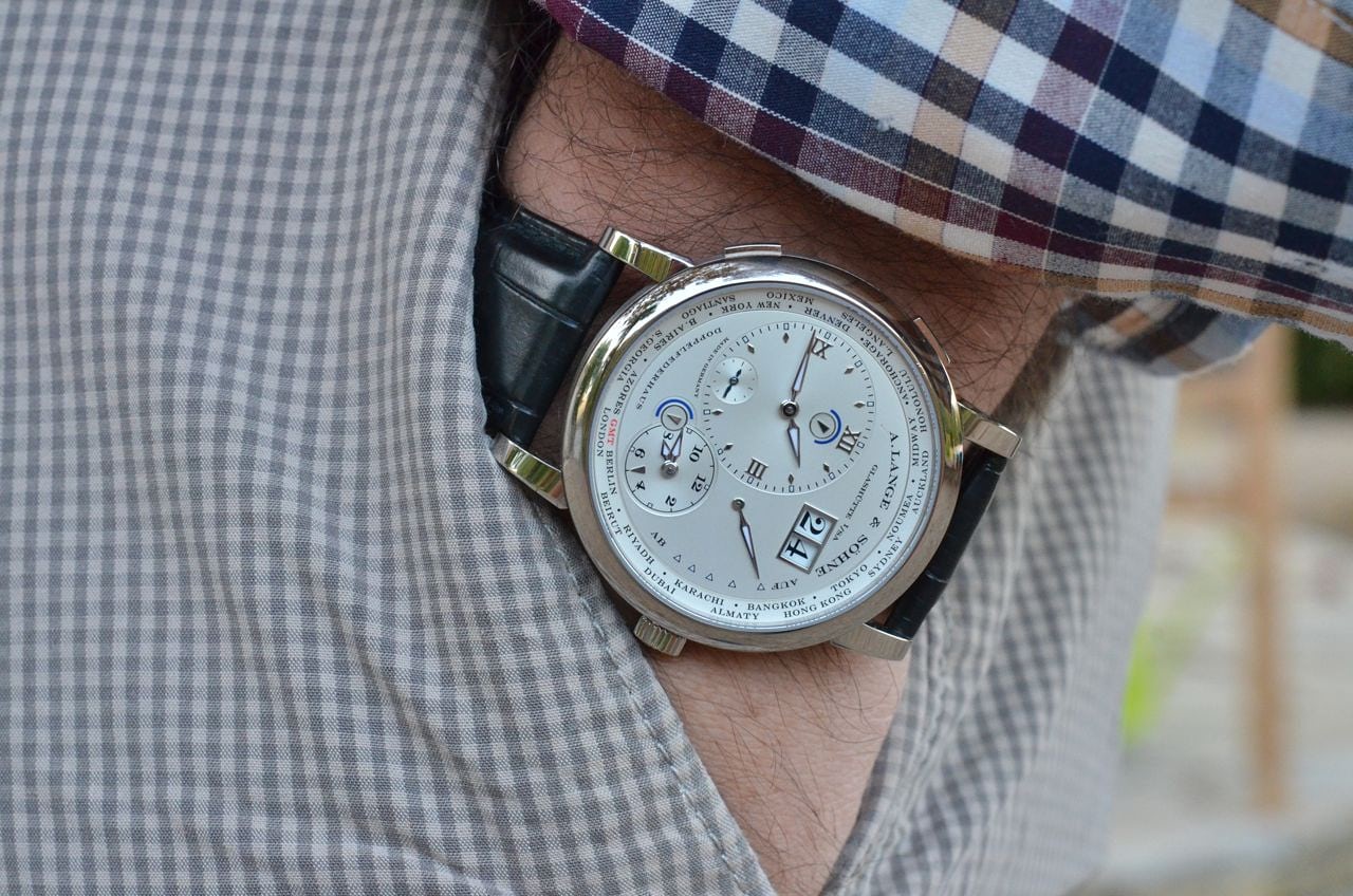 また、明るい陽光の下でのこのダイヤルは、ただただゴージャスであることにも付け加えたい。シルバーの表面、夜光塗料を塗布したホワイトゴールドの針、そして全てのアップリケ、そしてブルーのナイト表示までもが温かみを感じさせ、私は好感をもった。また、今では伝統的なランゲ1よりも、ランゲ1・タイムゾーンの情報量の多いダイヤルの方が本当に好きになったことも特筆すべき点だ。この時計を1週間着用した後、通常のランゲ1はそれに比べて鈍く見える。さて、見た目は素晴らしいが、使用感はどうだろうか?