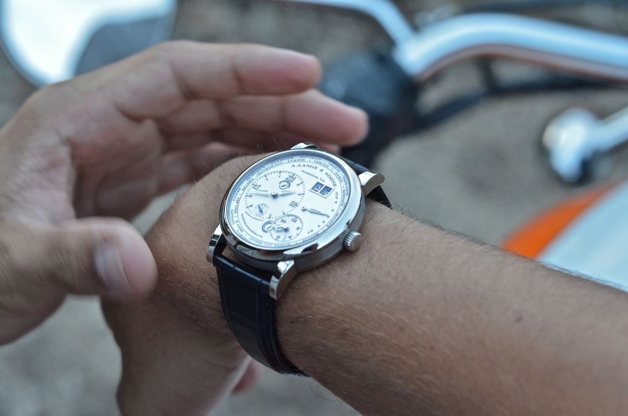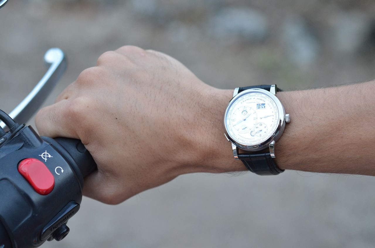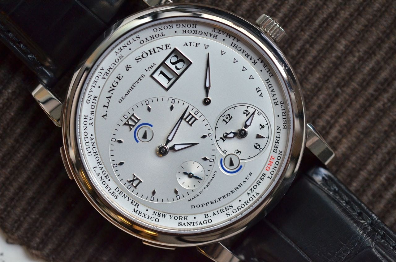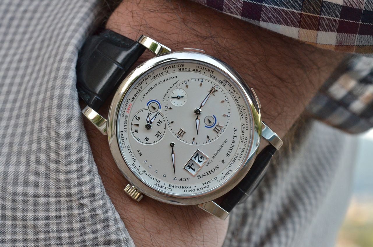 また、明るい陽光の下でのこのダイヤルは、ただただゴージャスであることにも付け加えたい。シルバーの表面、夜光塗料を塗布したホワイトゴールドの針、そして全てのアップリケ、そしてブルーのナイト表示までもが温かみを感じさせ、私は好感をもった。また、今では伝統的なランゲ1よりも、ランゲ1・タイムゾーンの情報量の多いダイヤルの方が本当に好きになったことも特筆すべき点だ。この時計を1週間着用した後、通常のランゲ1はそれに比べて鈍く見える。さて、見た目は素晴らしいが、使用感はどうだろうか?
