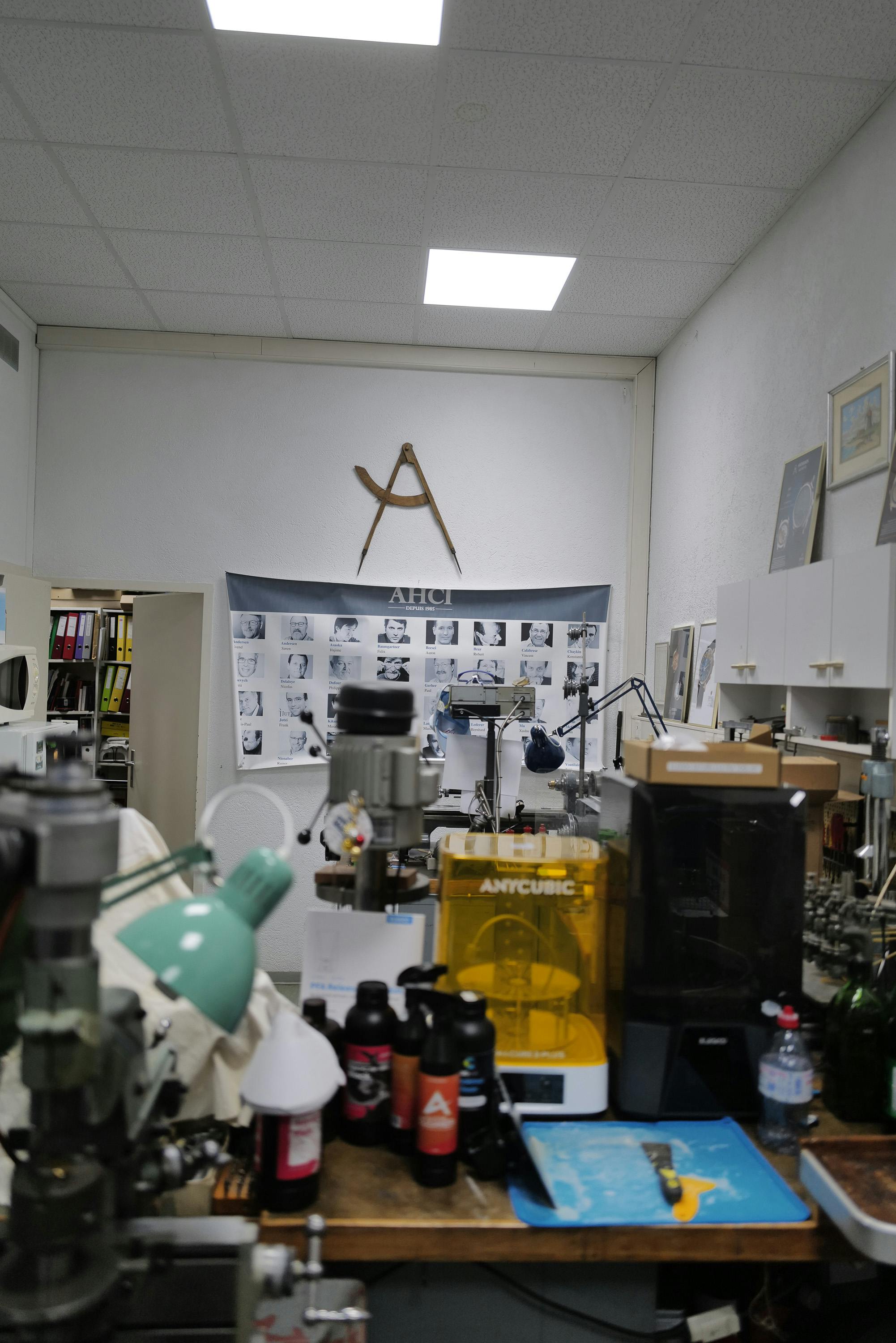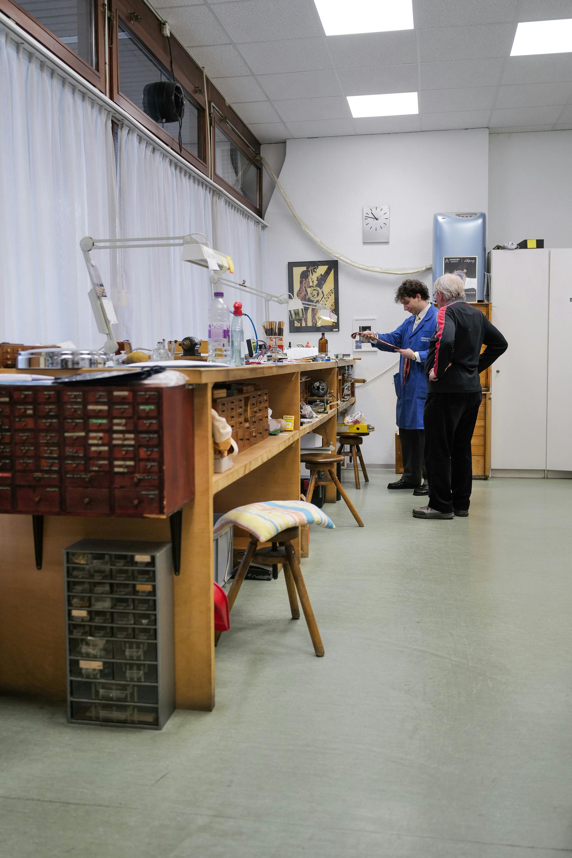私がアトリエを訪れていると、83歳のスヴェン・アンデルセン氏が現れ、若い時計師にいくつかアドバイスをしていた。