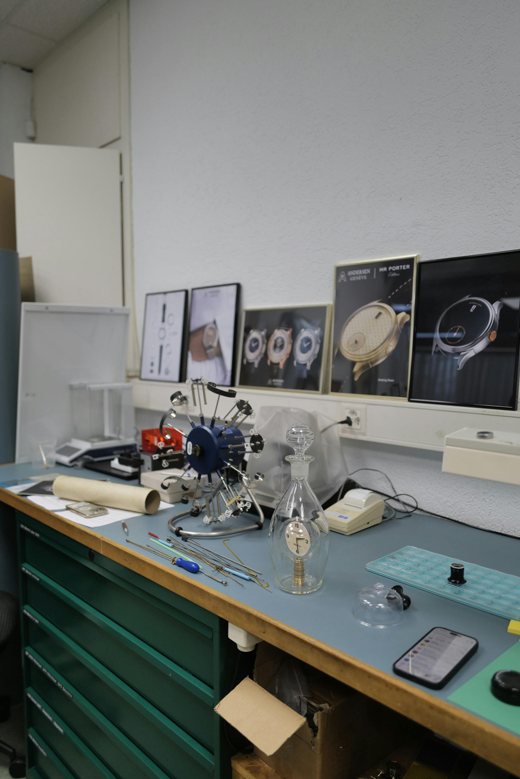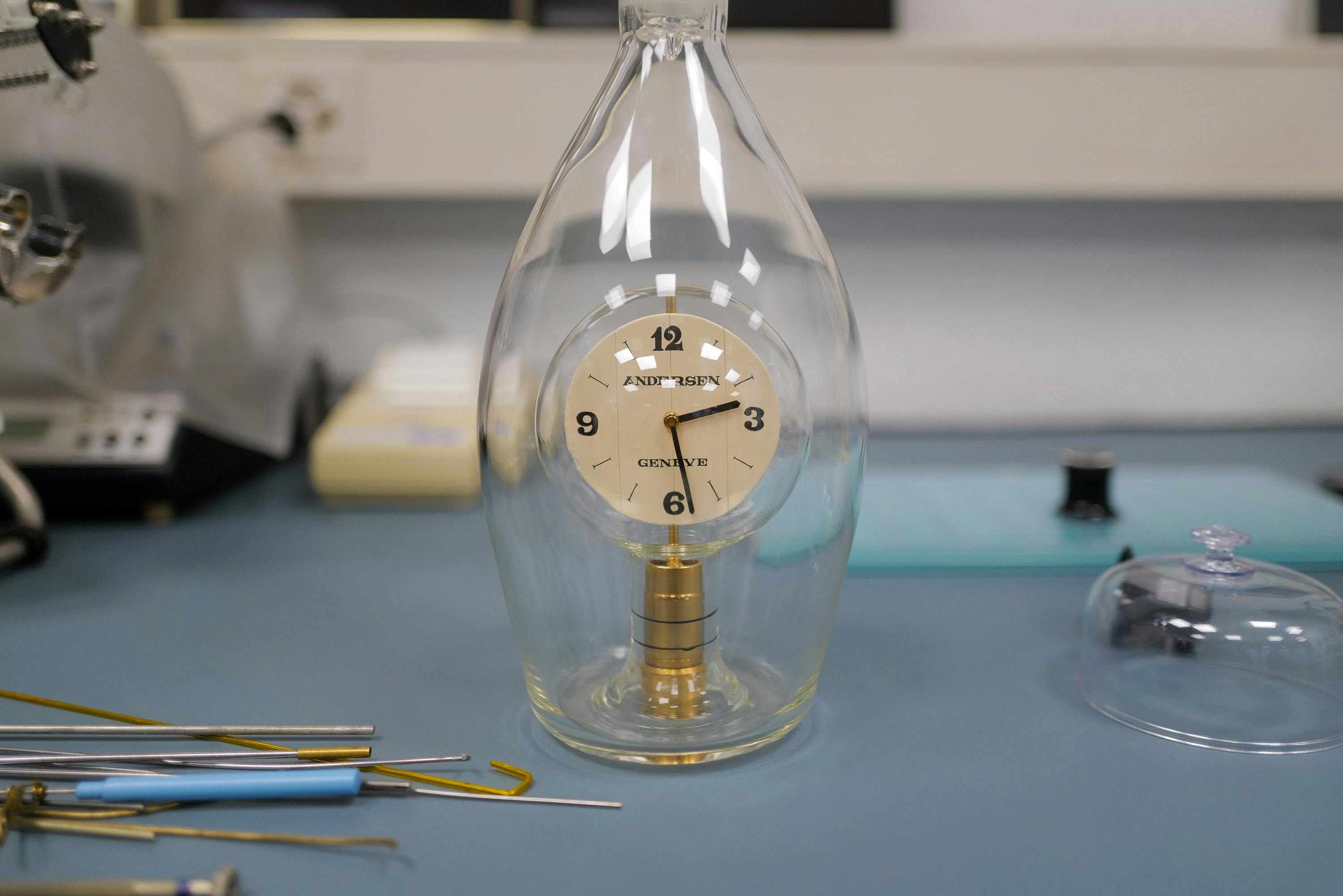 ガラス瓶のなかに小さな模型船を組み立てるのを想像してみて欲しい。ただし、それを時計として機能するように作るのだ。スヴェン・アンデルセン氏はこれをやってのけ、大絶賛を浴びた。彼のキャリアを通じて製作された29個のうち、半分以上が世界の主要な博物館に所蔵されている。そのうちのひとつが、幸運なことに、アンデルセン・ジュネーブの工房にあった。彼は瓶のなかで時計を組み立てるために必要な工具まで自作しなければならなかったと言う。なぜそんなことをしたのか? それは、ハイエンドなウォッチメイキングにおける多くの試みと同様、「やってはいけない理由がないから」だろう。