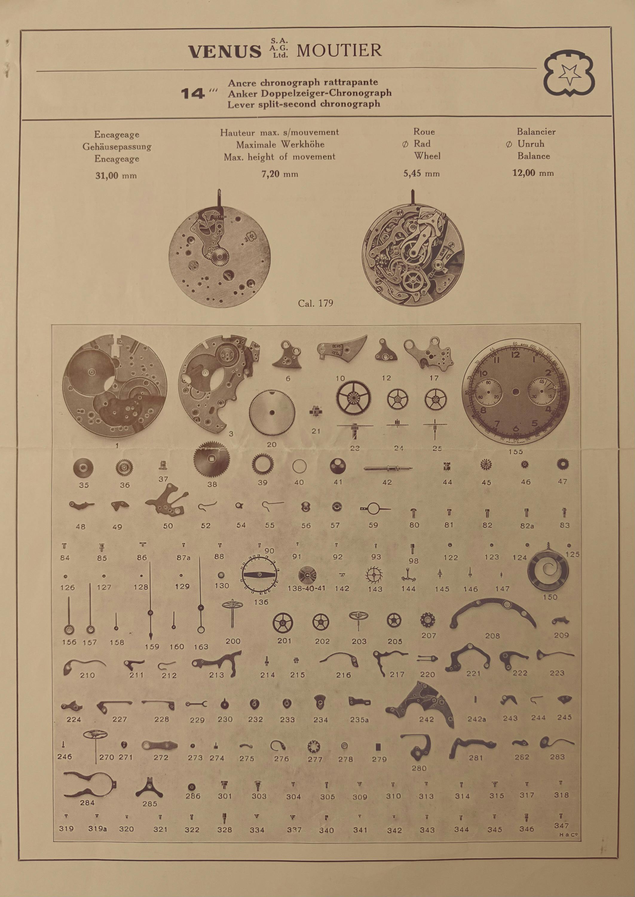 そう、この時計のベースとなるのはアンデルセン・ジュネーブが調達し、まったく新しい方法で仕上げた新古品のムーブメントだ。ヴィーナス179は1940年代から50年代にかけて製造されたラトラパンテムーブメントで、オリジナルのブライトリング デュオグラフやレコード(Record)、テルダ(Telda)などの同時代の時計に搭載され、その後、90年代にはジラール・ペルゴ、パネライ、パルミジャーニの一部モデルに再び採用されていた。