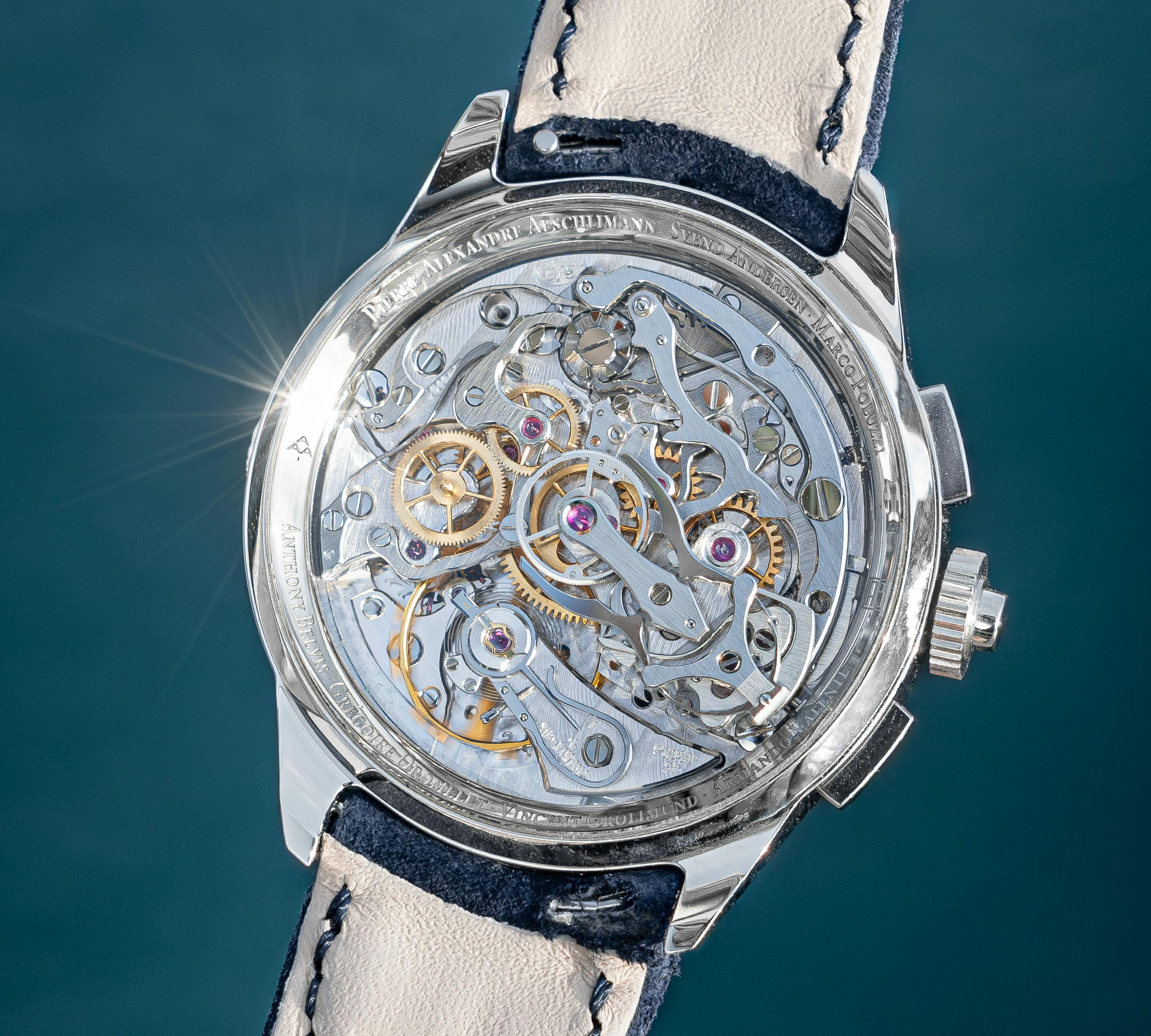 率直に言って、その出来栄えは素晴らしい。“自社製”ではないものの、その仕上げはパテック フィリップ Ref.1436のような歴史的リファレンスに搭載された、バルジューをベースにしたラトラパンテムーブメントの仕上げ技術をほうふつとさせる。その手作業の巧みさは、アンデルセン・ジュネーブの腕時計ではかつて見られなかったほどの精緻さと言えるだろう(歴史的なランゲのムーブメントをベースにした、特注のミニッツリピーターは例外かもしれないが)。ラトラパンテ モンディアルはアンデルセンの時計として初めて“AAA”品質の称号を授与され、裏蓋に時計職人の名前が刻まれたモデルとなる。この新しい刻印は今後、このレベルに達する手作業の技術が認められるごく少数のモデルにのみ与えられる予定だ。