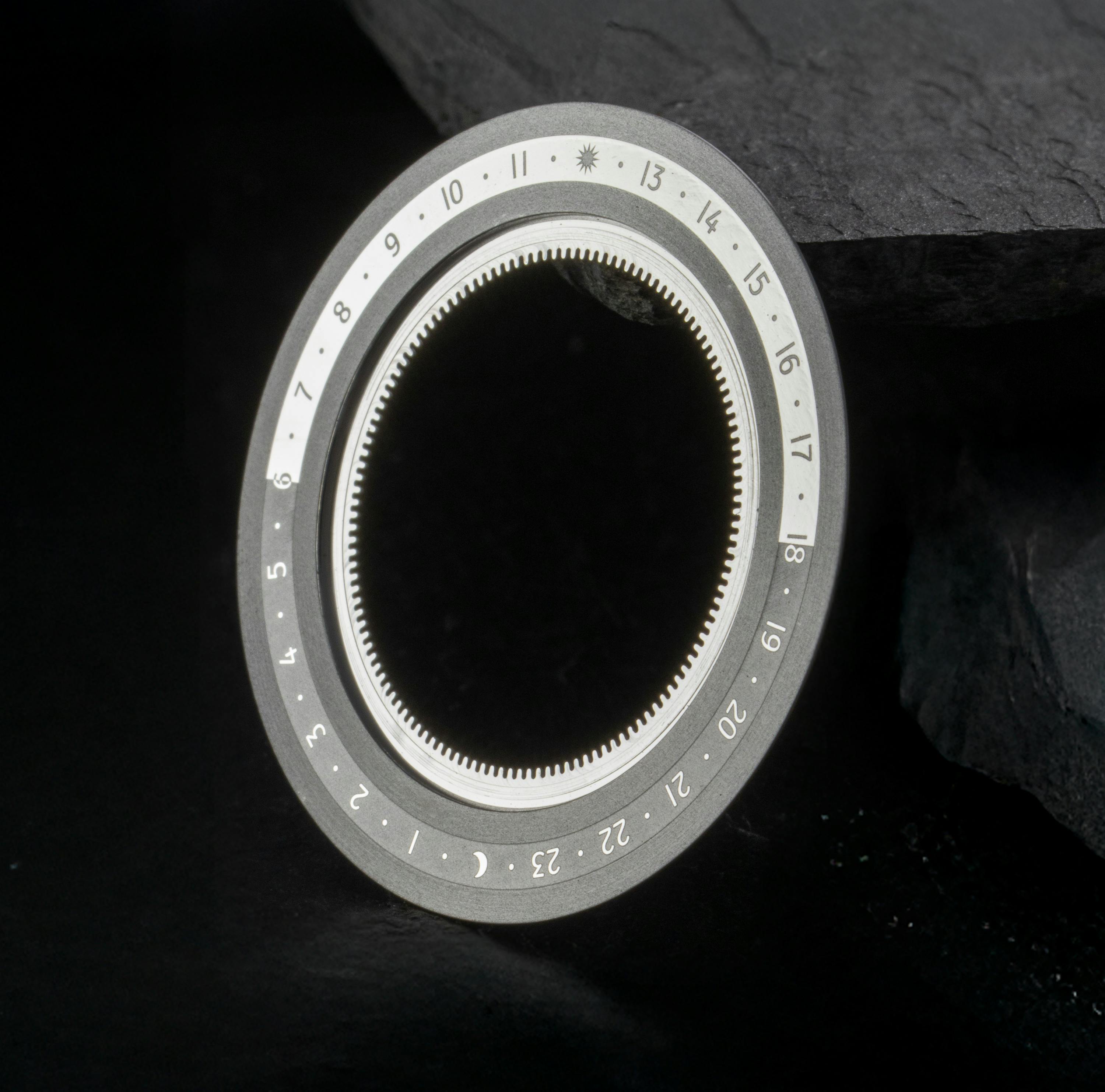 シルバー仕上げを施した真鍮で作られた24時間リングは、色ではなく繊細な質感の違いによって昼夜が分けられている。夜の時間帯はブラックポリッシュ仕上げにマットな数字がコントラストをなし、昼の時間帯はサテン仕上げとなっている。