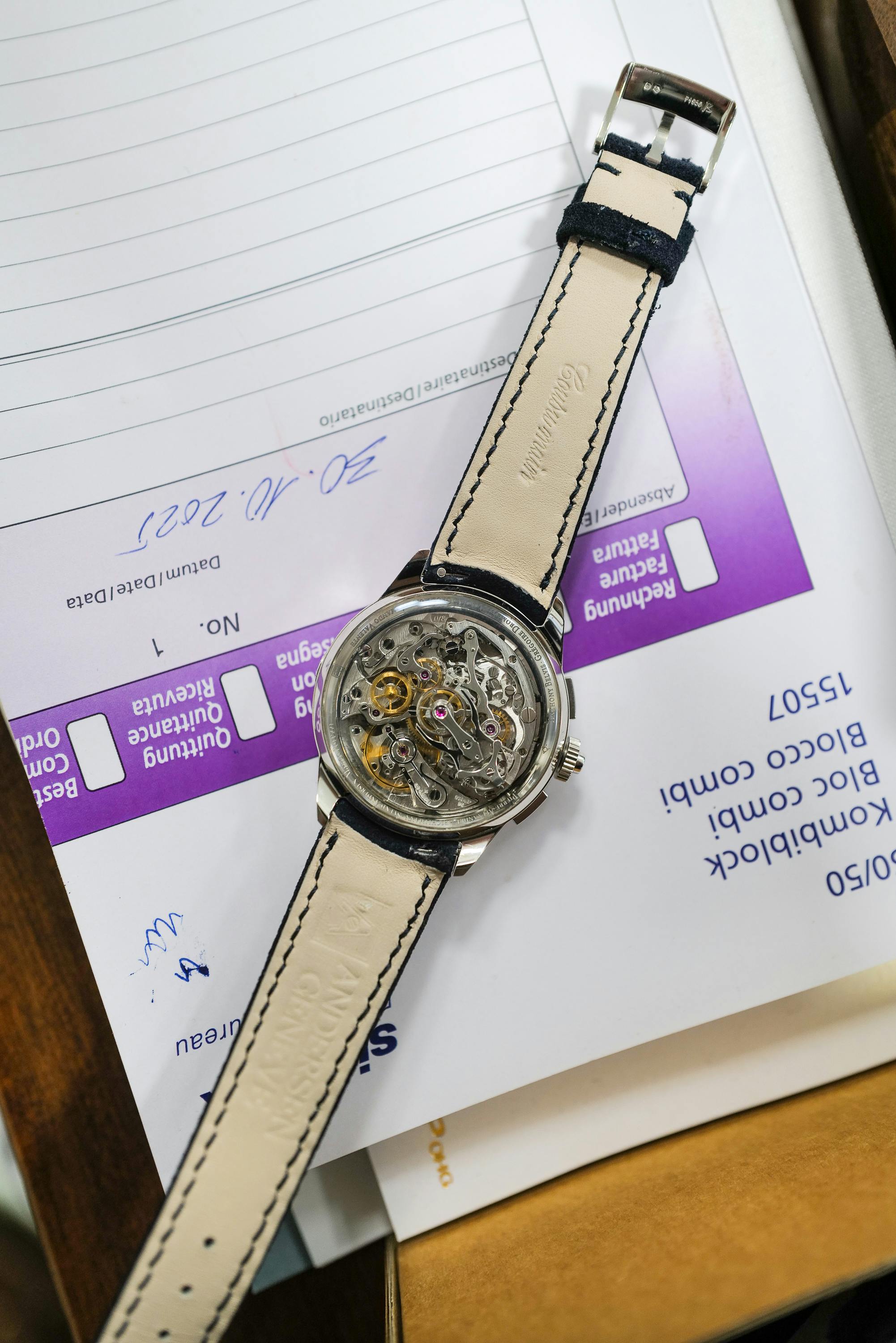 ダイヤルもまた見事だ。ソリッドホワイトゴールド(WG)製で、バーティカルサテン仕上げが施され、すべての目盛り、スケール、マーカーはグラン・フー エナメルが手作業で施されている。シルバー仕上げの真鍮で作られた24時間リングは、昼と夜のふたつの部分に分けられており、色ではなく繊細な質感が用いられている。夜の時間帯はブラックポリッシュ仕上げにマットな数字がコントラストをなし、一方で昼の時間帯はサテン仕上げとなっている。クロノグラフのカウンター針はステンレススティール(SS)製で、アンデルセンによって手作業でブルースティールに仕上げられている一方、時・分針は18KWG製で鏡面仕上げが施されている。この時計の至るところに、職人の手仕事の技が感じられる。
