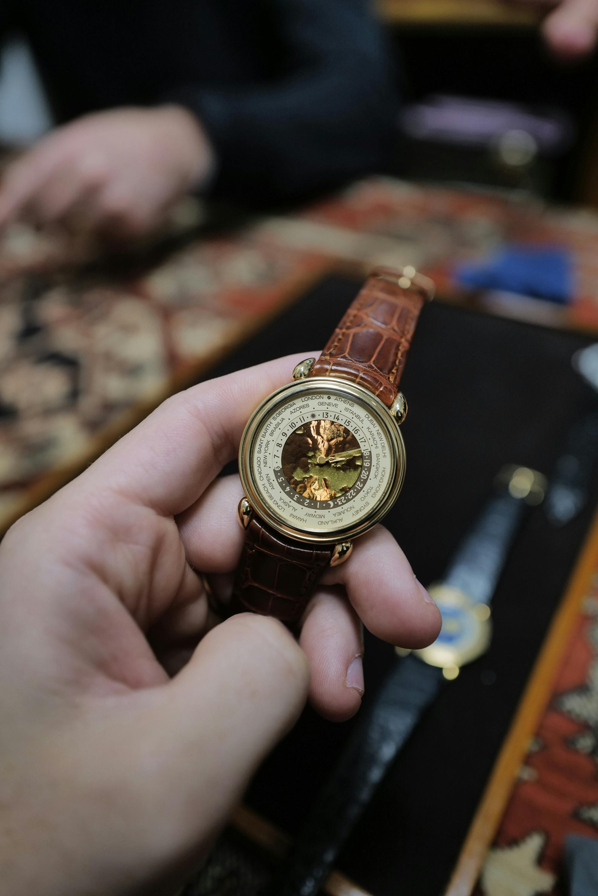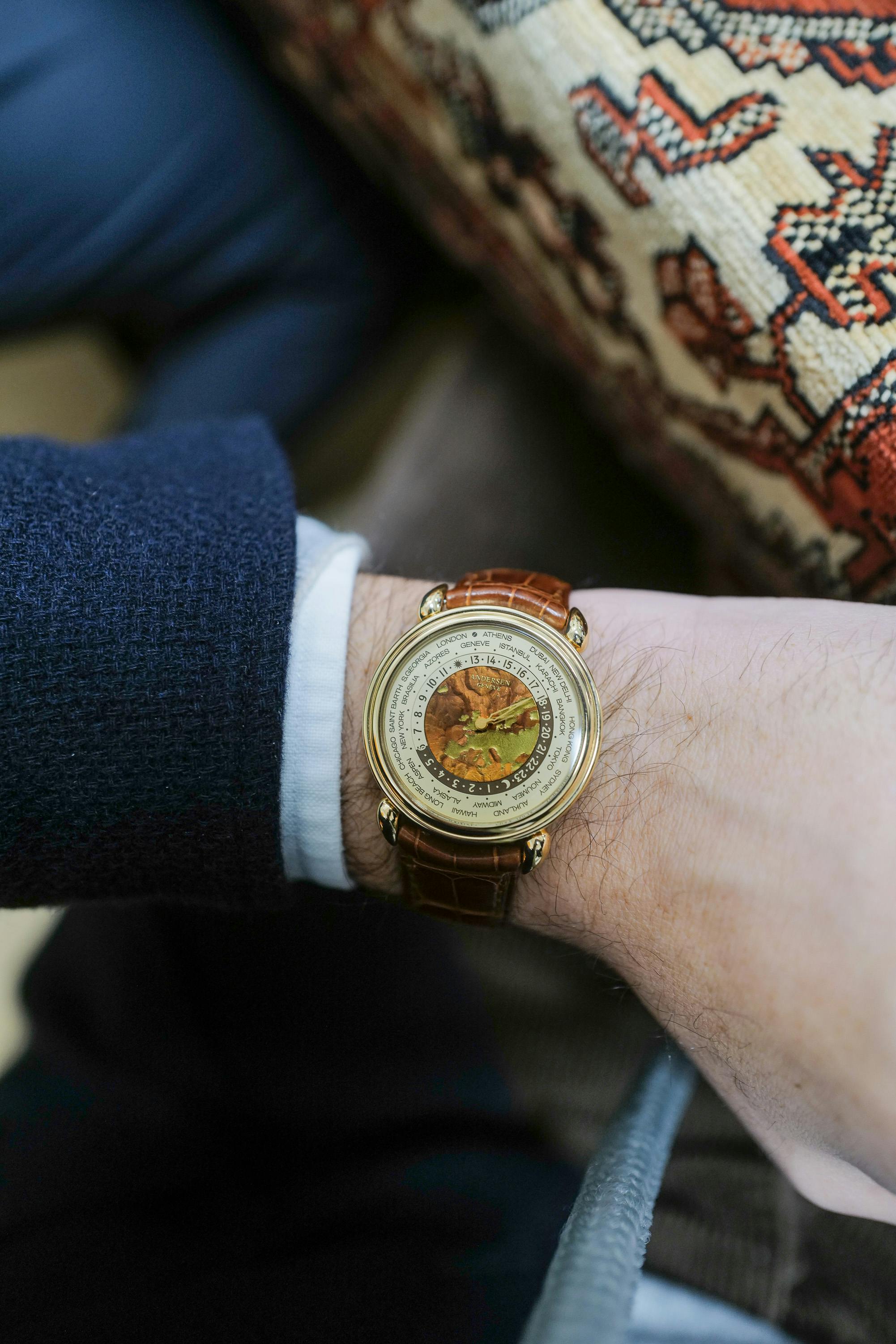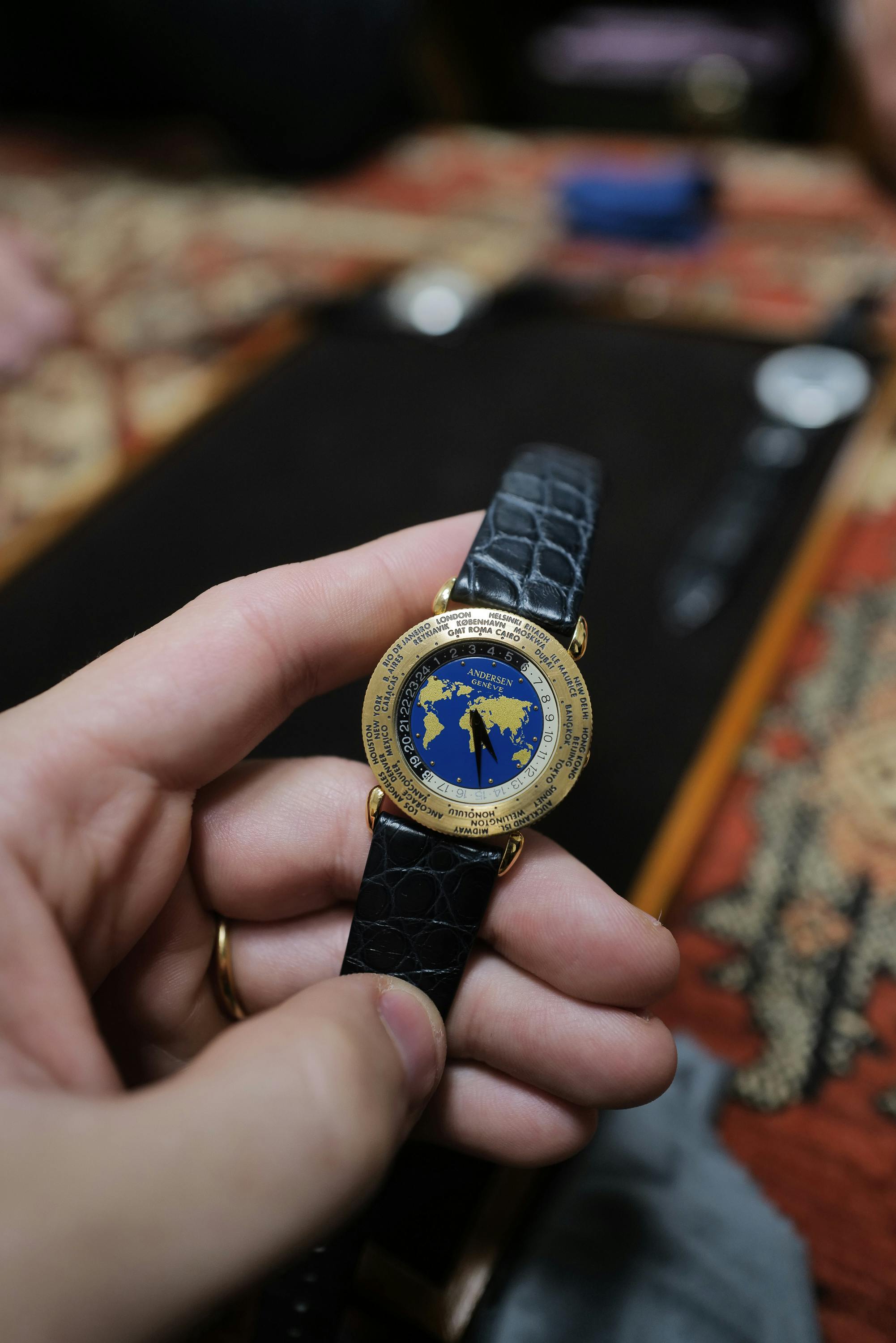 まず、アンデルセン・ジュネーブとは何か? その全貌については、同僚のマーク・カウズラリッチがHODINKEE Magazine最新号に寄せた素晴らしい記事をぜひおすすめしたい。この記事では、創業者スヴェン・アンデルセン(Svend Andersen)氏の若き日々から、パテック フィリップのグランドコンプリケーション工房で働く3人のうちのひとりとして頭角を現し(ほかのふたりはロジェ・デュブイ/Roger Dubuis氏とマックス・バーニー/Max Berney)、自身の名を冠したブランドを設立し、パテック フィリップに搭載されていたコティエが設計したムーブメントを研究したのちに、まったく新しいワールドタイム機構を創り出すまでの経緯が詳述されている。