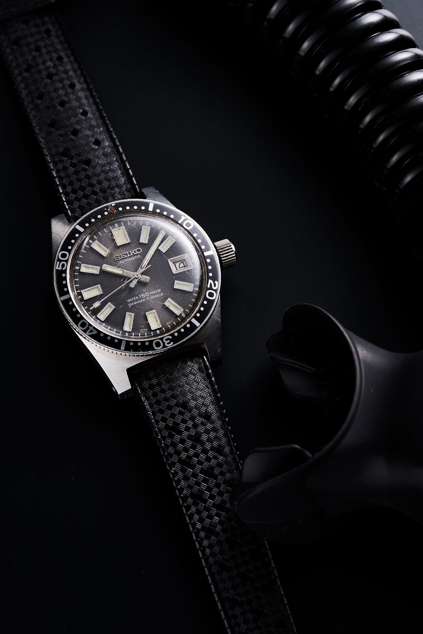 62MASでは初期型からスイス製のトロピックストラップが採用された。これは網目のような表側に対し、裏側は装着時に手首に密着する面積を減らすよう窪みをもたせつつ、強度を兼ねたダイヤモンドパターンが施され、排水を兼ねて穿たれた穴が特徴的だ。加えて、ZLM01のパーツ品番をもつ通称“ワッフルストラップ”にも組み合わせられたようだが、これは1967年の300m防水モデル、6215-7000にも受け継がれていた。