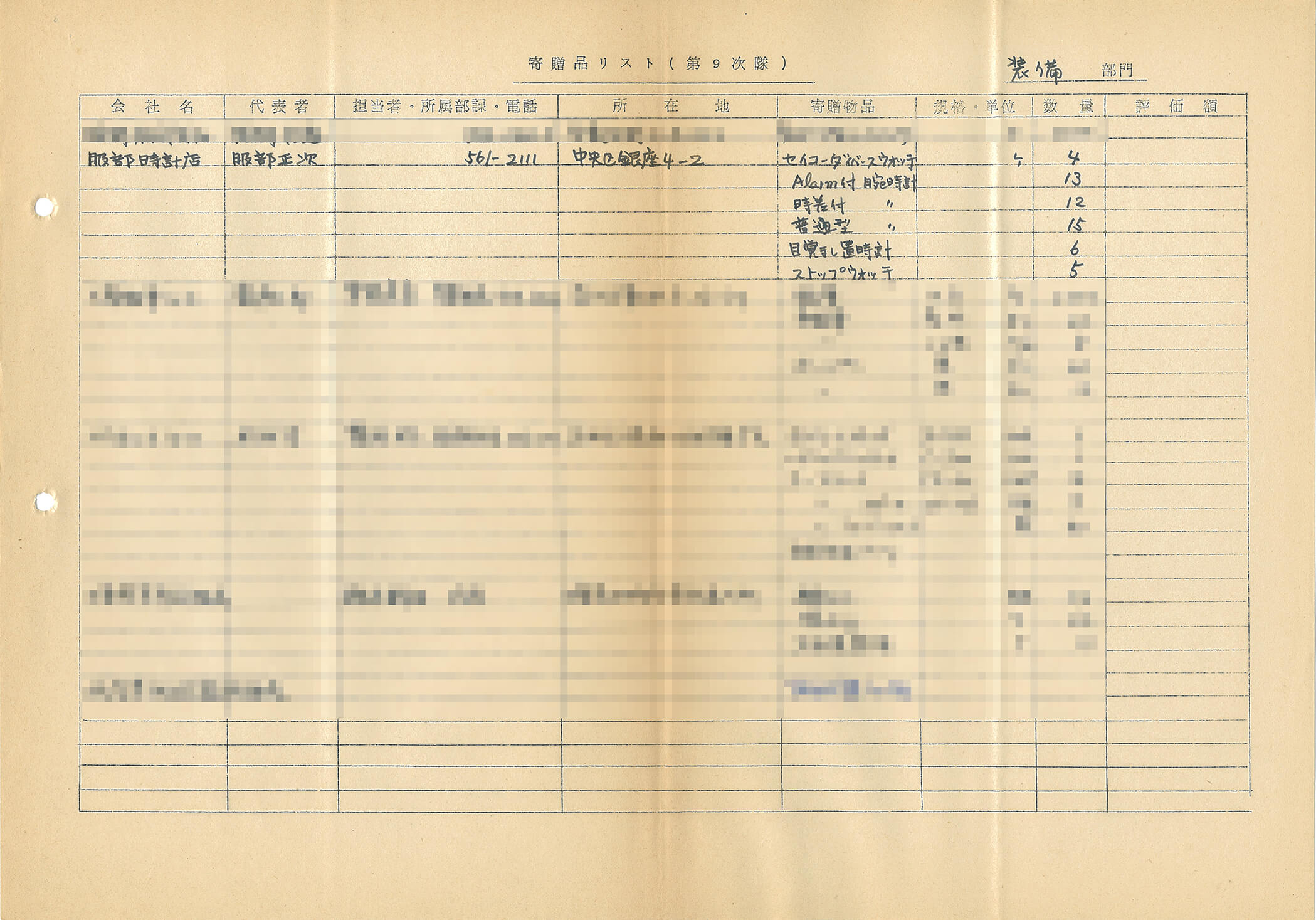 これはきわめて希少な第9次南極観測隊への寄贈品リスト。服部時計店(現:セイコーグループ)の名で、ダイバーズウォッチが4本寄贈されたことが記されている。ほかにもアラーム付腕時計が13本、時差付腕時計が12本、普通型腕時計が15本、目覚まし置き時計が6個、そしてストップウォッチが5個観測隊に寄贈されたようだ。画像:国立極地研究所