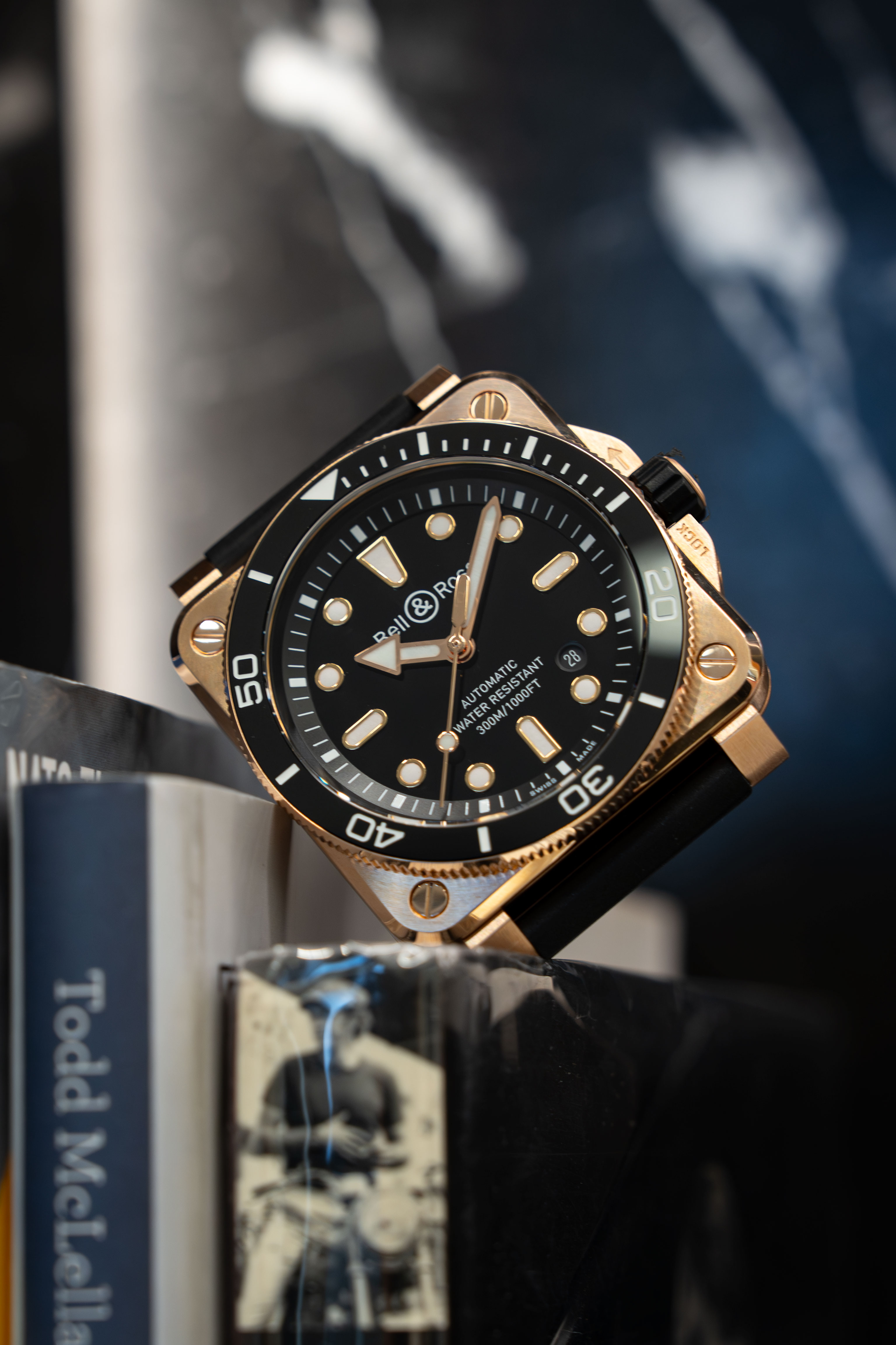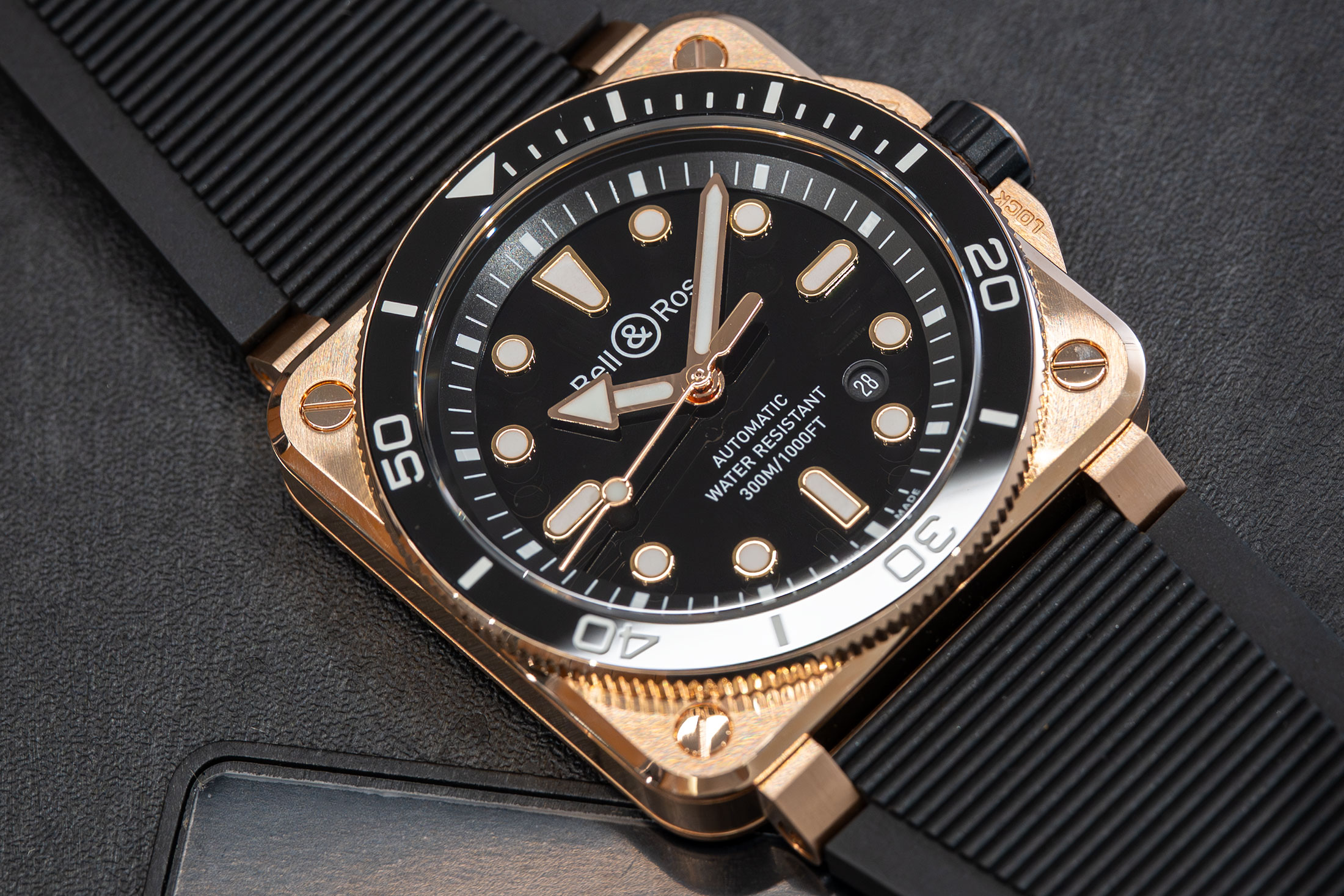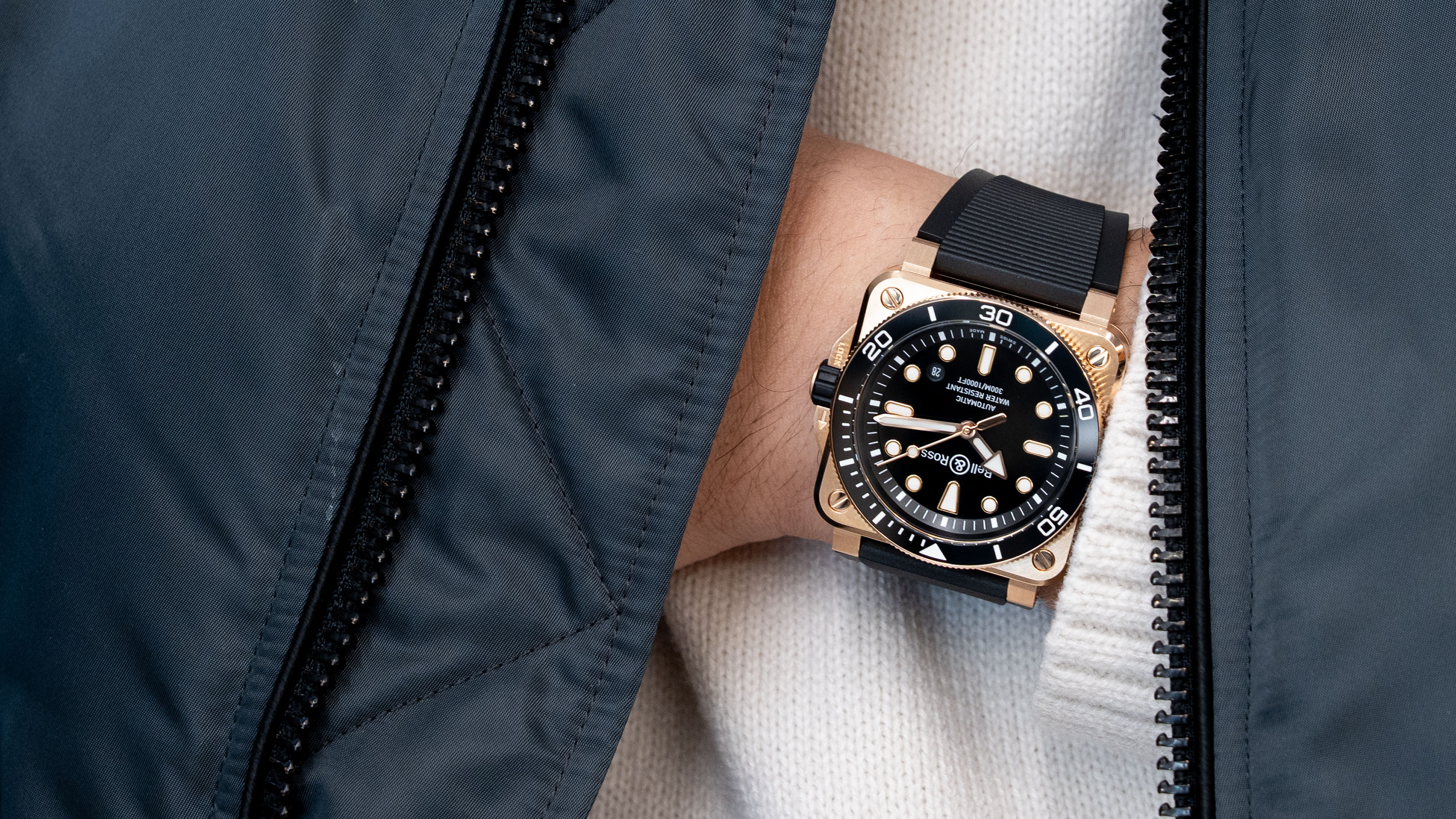 そのラグジュアリーさに目を奪われがちなBR-03 ダイバー ブラック ブロンズだが、それはあくまで“時を超えて耐えうる計器を作り出す”というベル&ロスの哲学のうえに成立している。今年、ゴールドカラーとブラックは他社でも多く目にするコンビであり、トレンド面においても需要が高い。しかしそこに、ツールとしての誠実さが加わることで、長く愛することができるタイムレスな魅力をも備えた1本に仕上がっているのである。