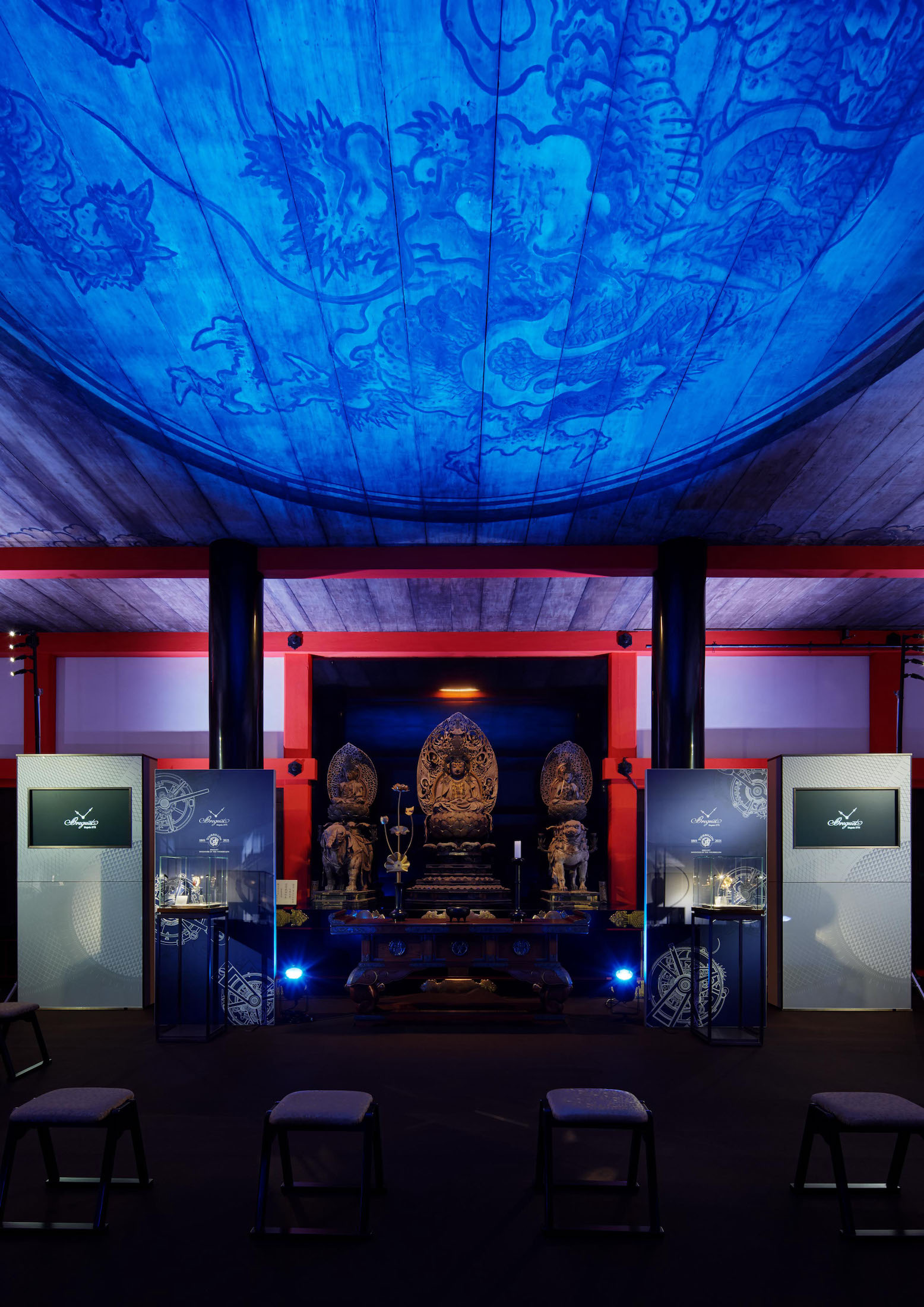 経堂内の釈迦三尊像と、並べられたブレゲの新旧トゥールビヨンピース(写真提供: Breguet)。