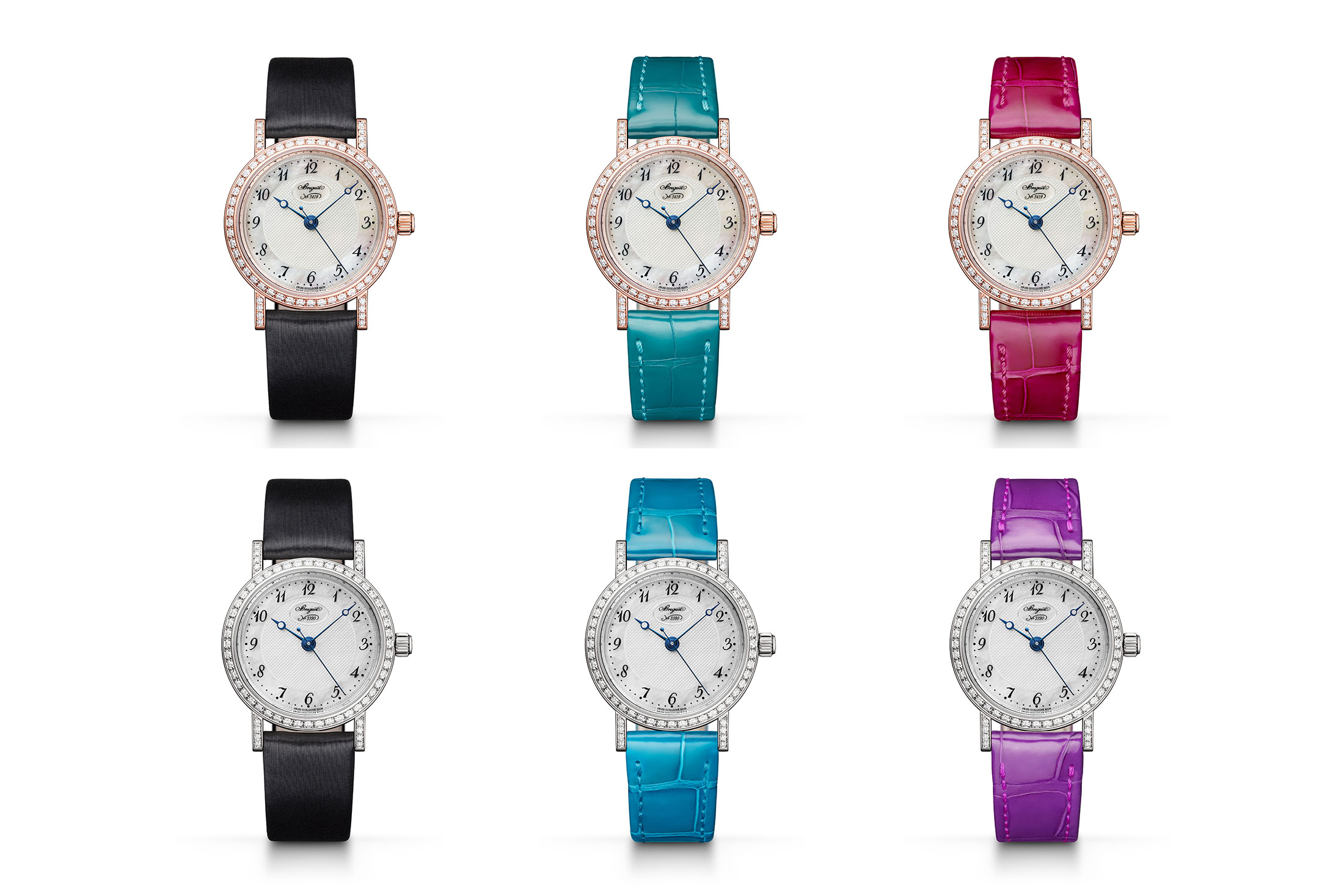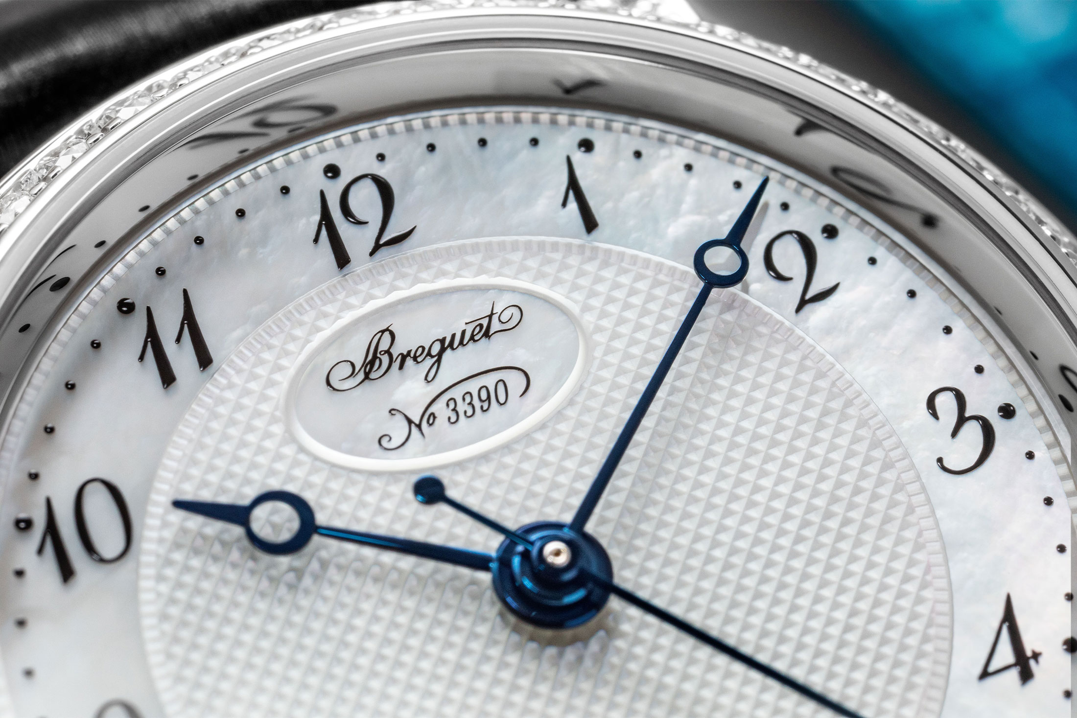 この時計自体についても少し触れておきましょう。クラシック 8068は18Kローズゴールドとホワイトゴールドの2色展開で、同社のシグネチャーであるフルート装飾がサイドに施されたケースは直径30mm。ケースとラグには64個のブリリアントカットダイヤモンドがあしらわれており、リューズにはブルーサファイヤではなくカボションダイヤモンドがセッティングされています。これによってどんなカラーのストラップにも合わせやすくなっています。ブレゲ針、MOPダイヤルにはもちろんギヨシェ装飾とブレゲ数字のインデックスを採用。内部には、バーリーコーン模様のギヨシェ彫りが手作業が施されたプラチナ製ローターを備え、45時間のパワーリザーブを有するCal.537/3を搭載。現代のブレゲのクラシックモデルに求めるものはすべて備わっています。