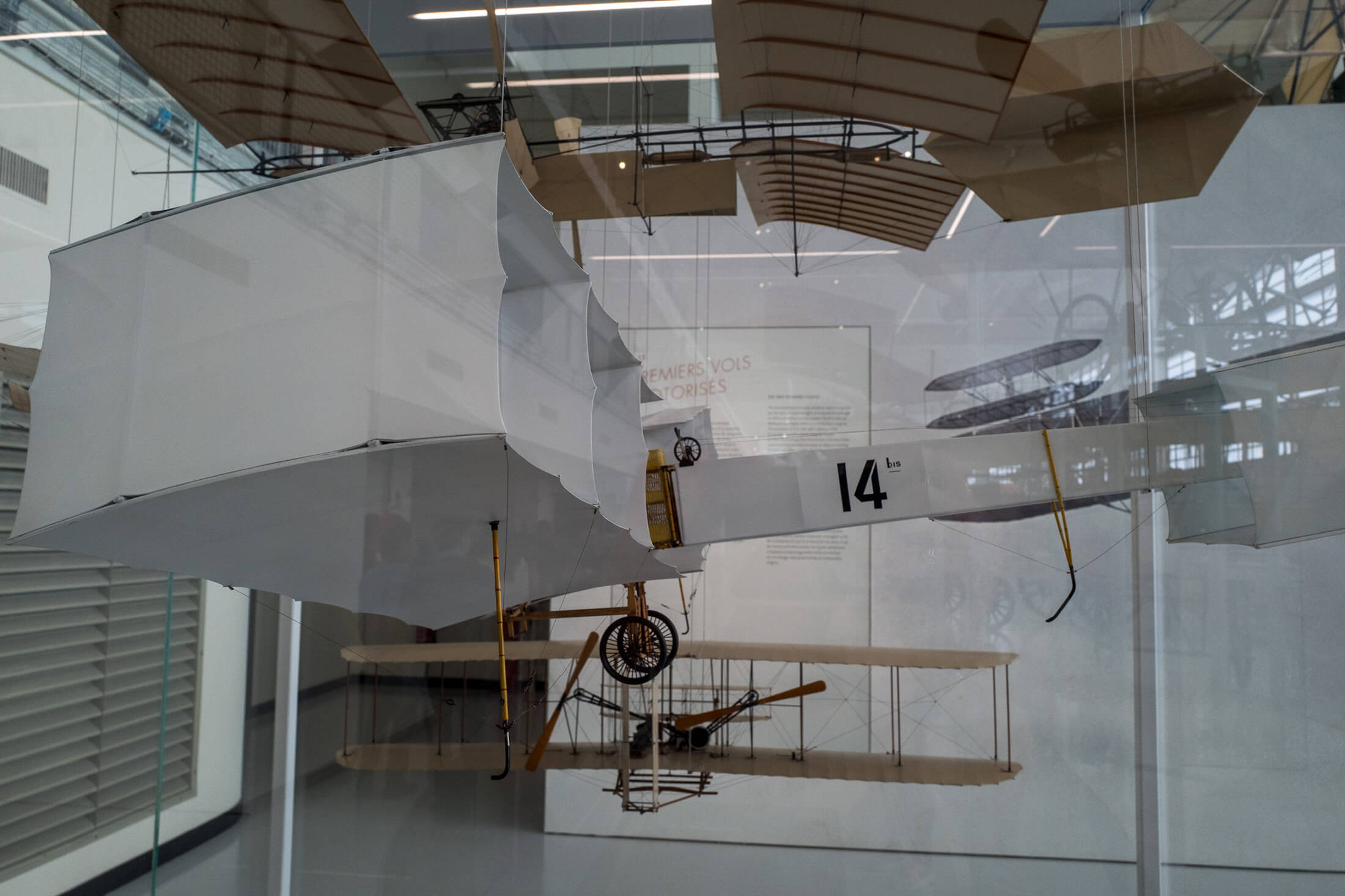 サントス=デュモンの飛行機、No.14-bis。アメリカのライト兄弟による初飛行ののち、1906年に欧州で最初に飛んだ飛行機。最長、21秒空中にとどまることができ、100m以上の飛行を達成した。