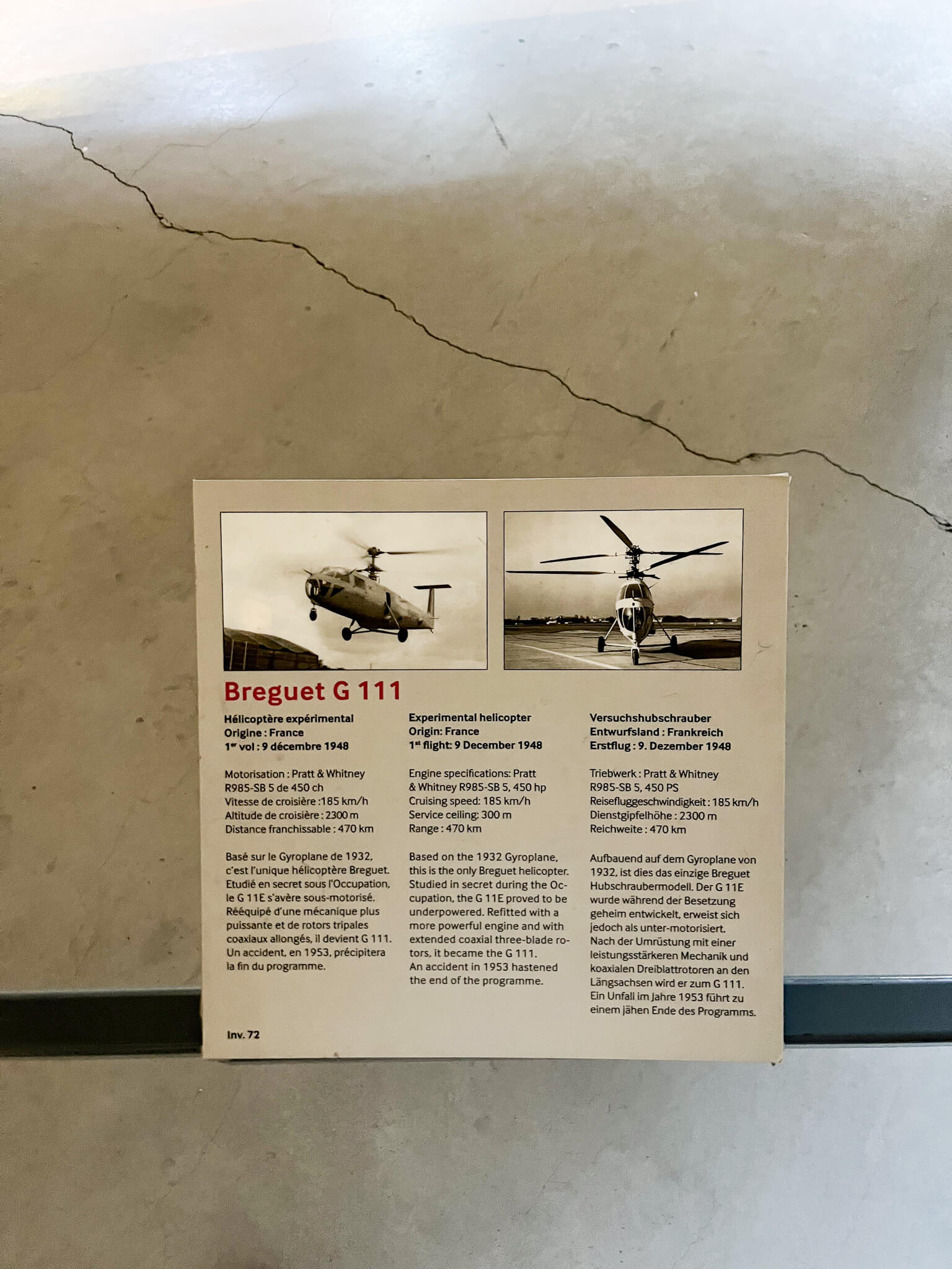 ブレゲ・アビエーションによるヘリコプター G.11E(のちに改良され、G.111と改称)。第二次大戦後まもなく製造され、二重反転式ローターを備えた実験機で、この機体のみ製造され、その後計画は中止された。