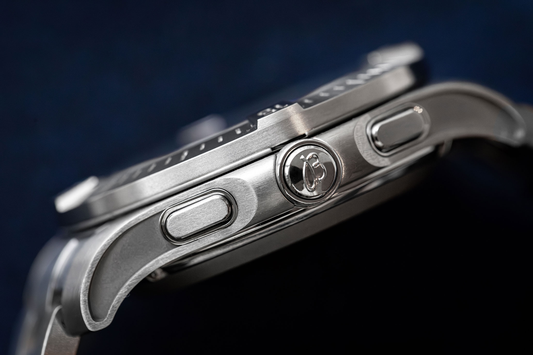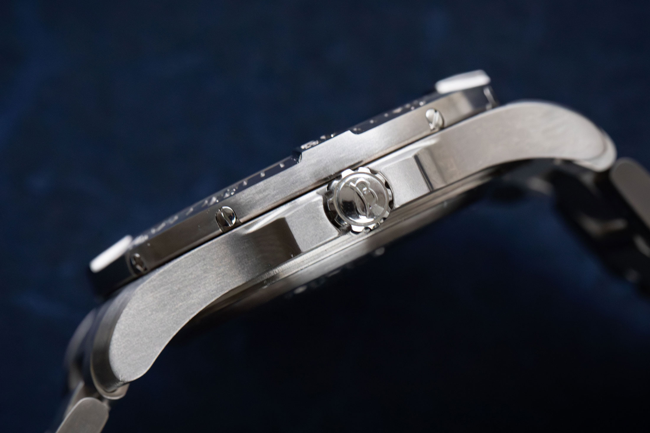また、ケースサイドのあしらいもプッシャーの追加によりアレンジが加えられた。下の写真を見てみると、淵を残しながら一段掘り込まれているのがわかる。これは装飾的なものというよりは、プッシャーが取り付けられたことによって正面から見た時のフォルムに影響が出てしまうことを防ぐ意味合いが強い。