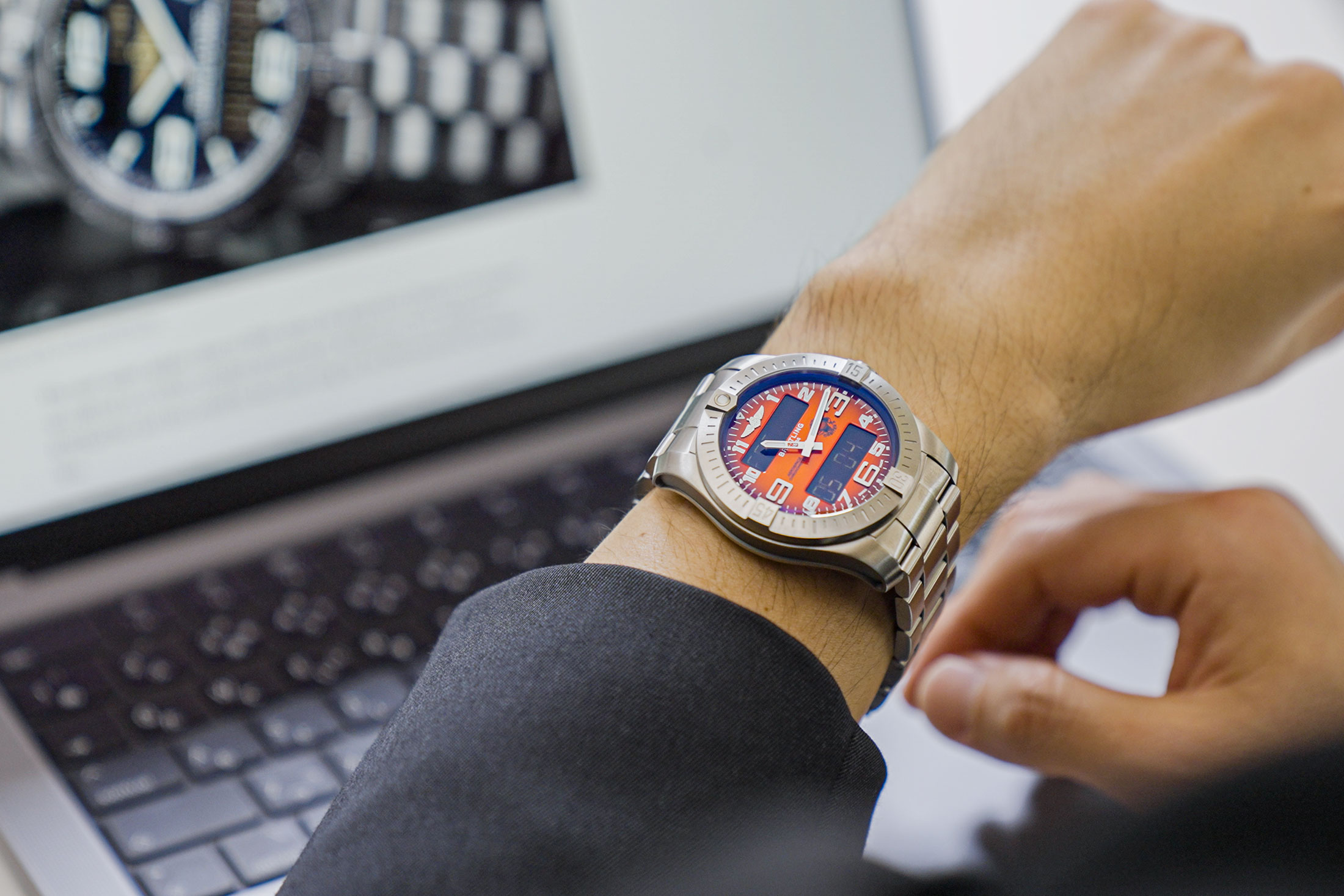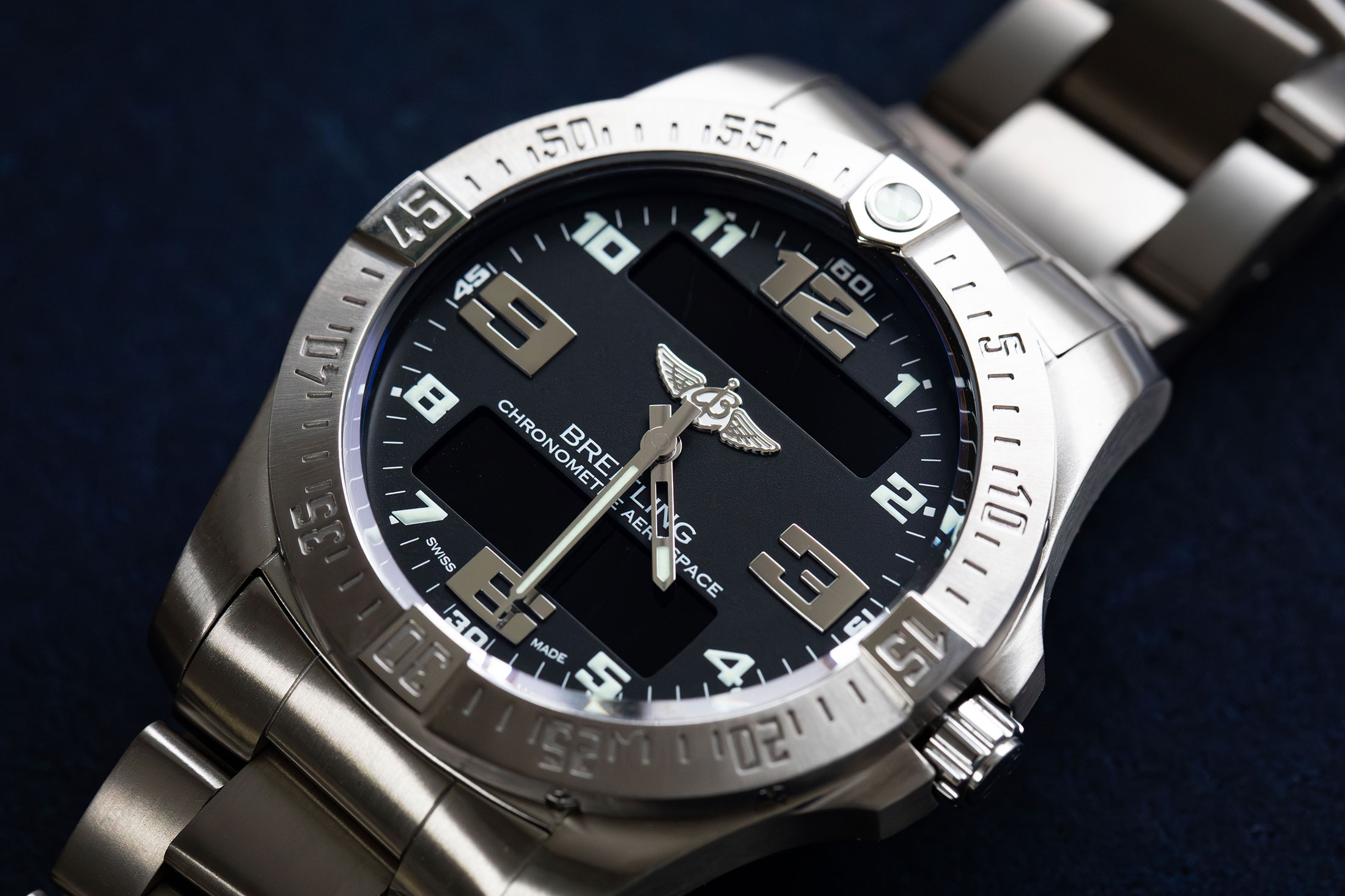 実際に手首に巻いてみるとその効果は一目瞭然だ。直径43mmとやや大ぶりながらすっきりと見えている要因としては、ふたつのプッシャーを内側に隠したことが大きい。ちなみに、プッシャー部分だけでなくその周囲も一段掘り下げたことで、プッシュ時の操作感にも難はない。3時位置のリューズがプッシュボタンになったことも含め、手首に乗せたままでさまざまな機能をストレスなく楽しめる1本に仕上がっている。ちなみにエアロスペース エヴォからは約30gほど重量が増しているものの、軽量なチタンケース&ブレスレットのパッケージは手首のうえでの馴染みもいい。