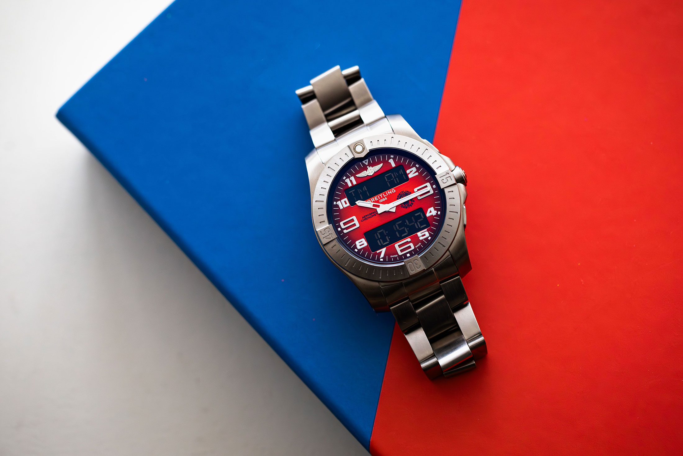 ブランドのプロフェッショナルシリーズの一翼を担う多機能なアナ・デジモデルとして、1985年の登場よりエアロスペースは時代にあったアップデートを繰り返してきた。初代であるRef.80360からしてすでに永久カレンダーにクロノグラフ、第二時間帯表示などパイロットに必要とされる機能を備えており、軽くて錆びにくいチタン外装を採用することで高い着用感も実現していた。以降、他ブランドのアナ・デジウォッチ人気が衰えていったのちもエアロスペースは独自の進化を続け、ブライトリング B-1、クロノスペース、そしてエマージェンシーといった派生モデルを数多く生み出していく。特に1995年登場のエマージェンシーは救難信号発信機(ロケーター ビーコン)を搭載した画期的なモデルで、アンテナのコイルをほどくと国際航空遭難信号周波数で独自のSOS信号が発信され、墜落した救助者の場所を追跡することができた。その特殊性から同モデルはプロパイロットを中心に人気を博し、スイスの冒険家であり飛行家であるベルトラン・ピカール(Bertrand Piccard)氏もまた、エマージェンシー、ひいてはエアロスペースを愛用するひとりだった。