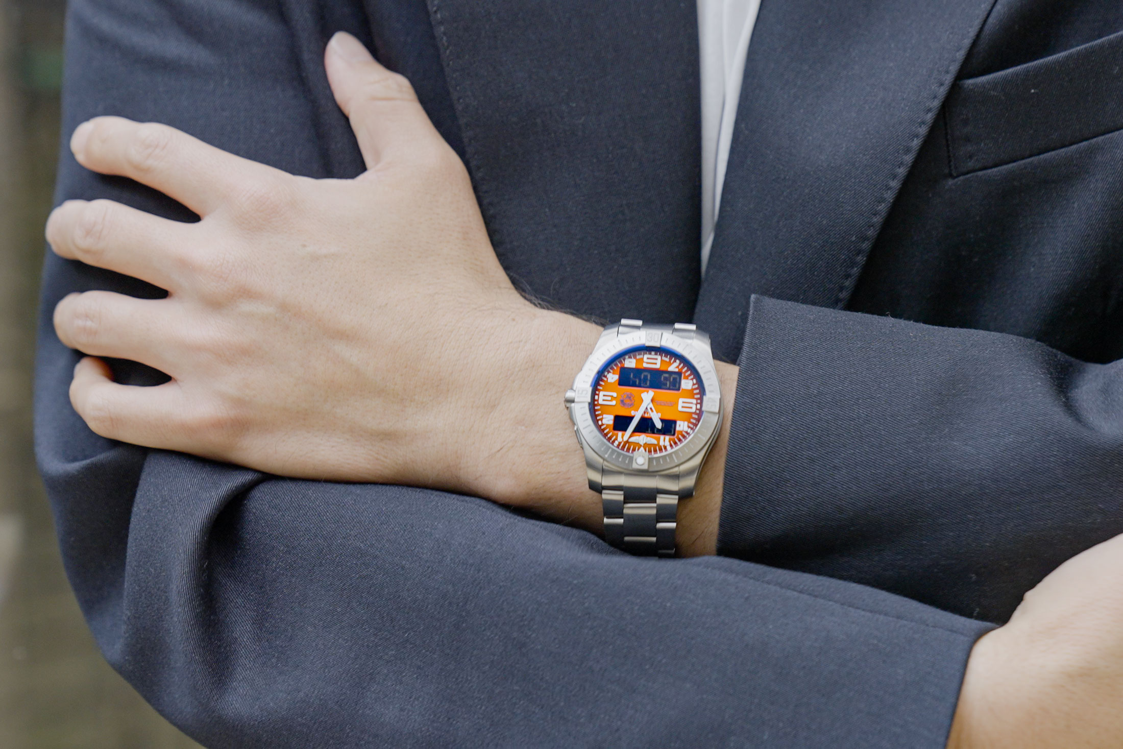 ピカール氏の手首に、オレンジダイヤルのブライトリング エマージェンシーの姿がある。
