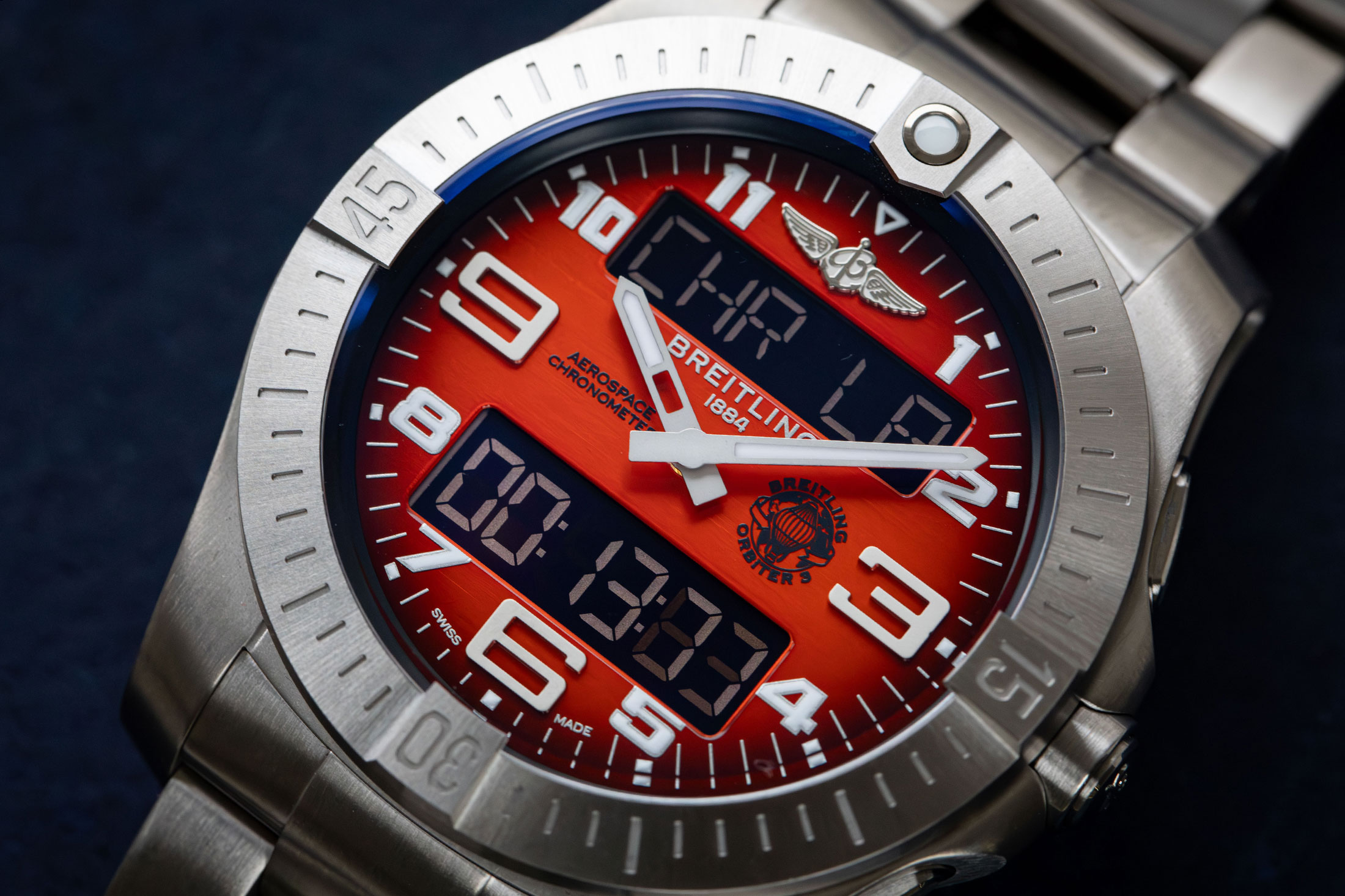 ただ、細部には各所に調整が加えられている。まず、ふたつのデジタル窓は視認性を高めるべく拡大。それに合わせるように針はやや太めになり、逆に印象的な3・6・9時のインデックスは少し細身にすることで文字盤上でのバランスが取られた。4ヵ所のライダータブはポリッシュからサテン仕上げに変更され、5分刻みで配置されていたベゼル上の数字はバーに置き換えられた。このほかミッションロゴがあしらわれたことによるウィングロゴの移動などもあるが、全体的にシャープでモダンな印象に寄せられている。