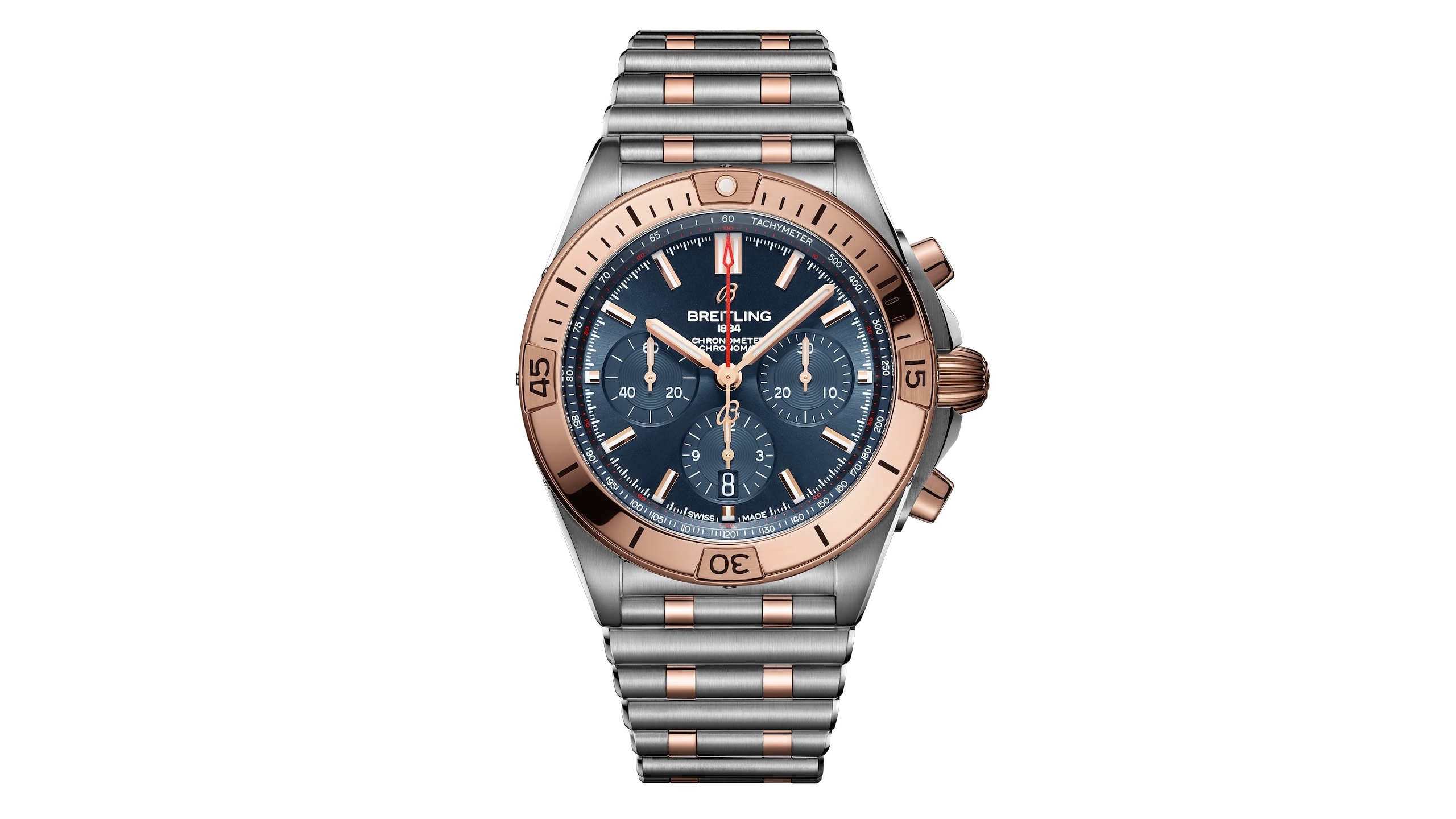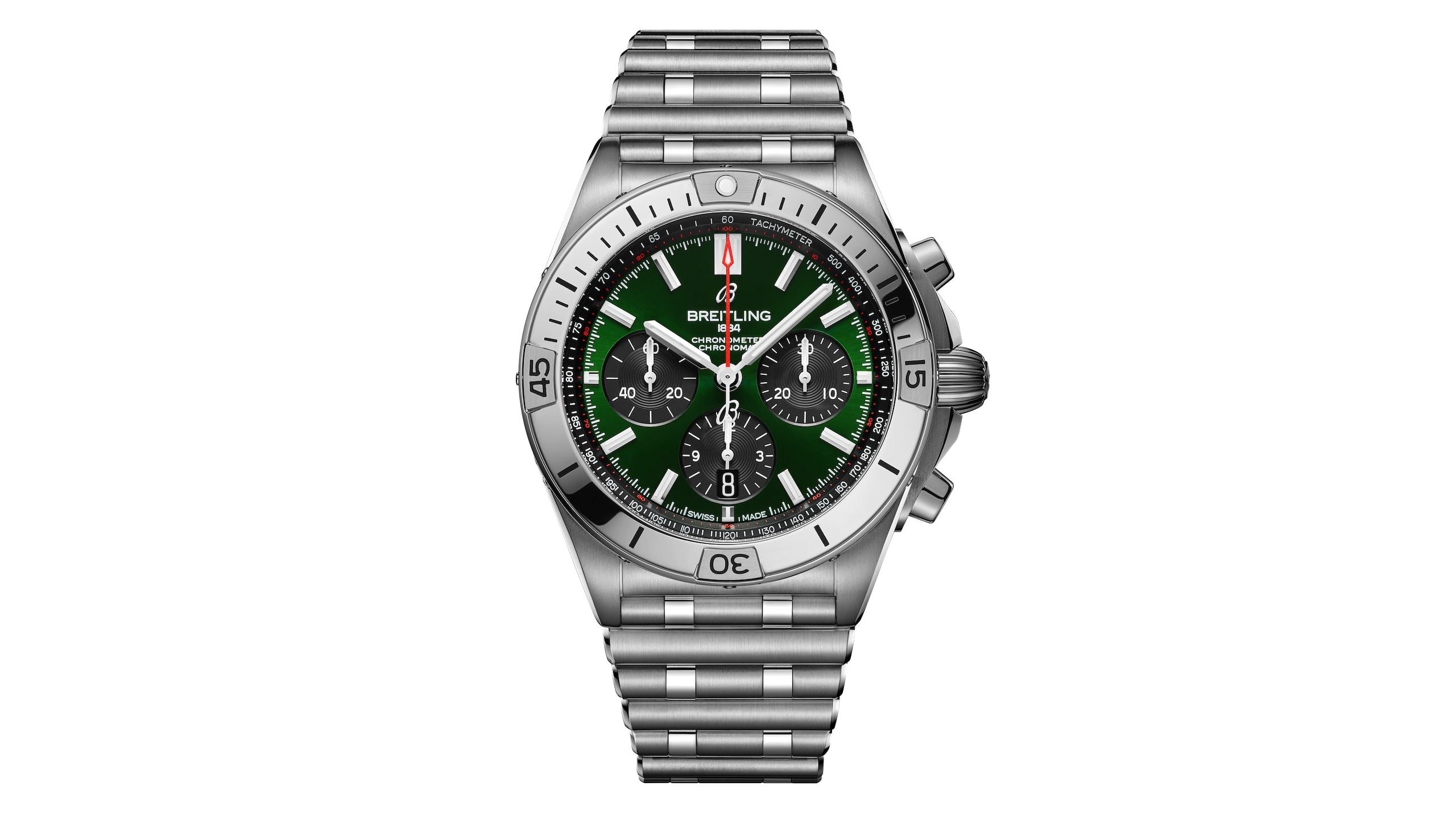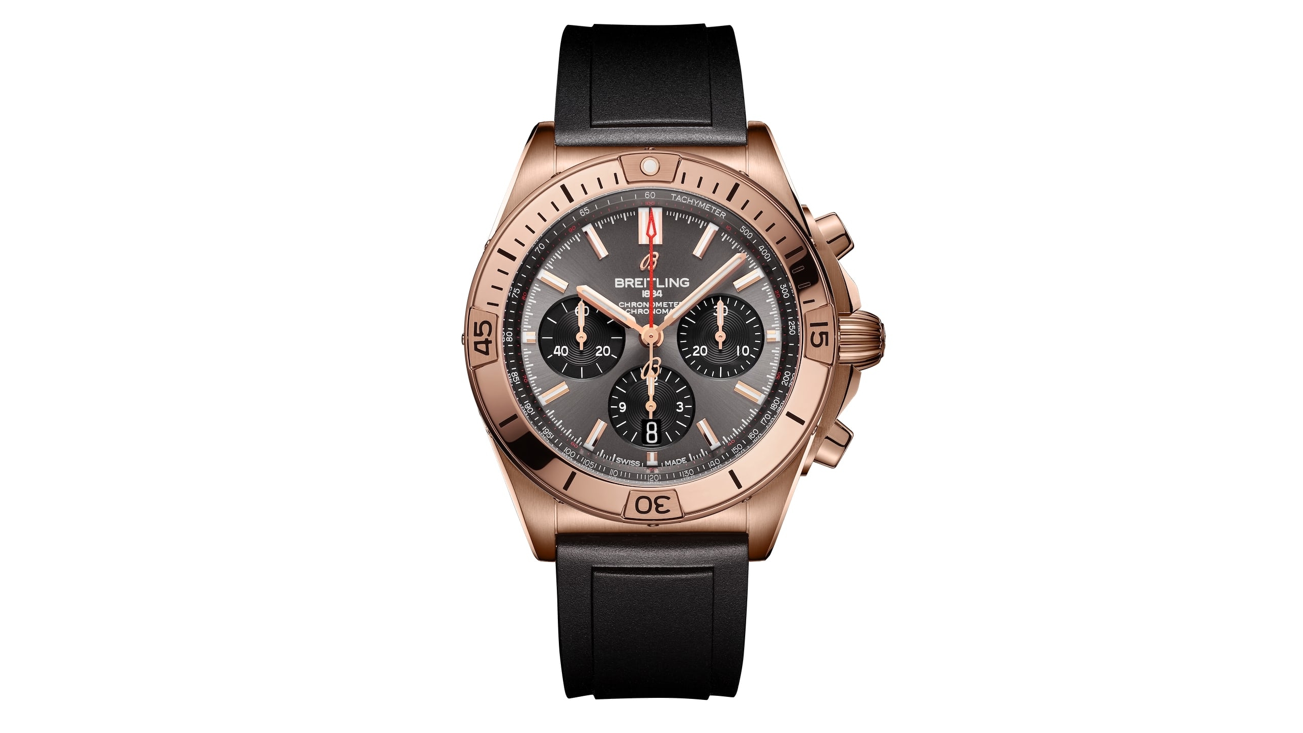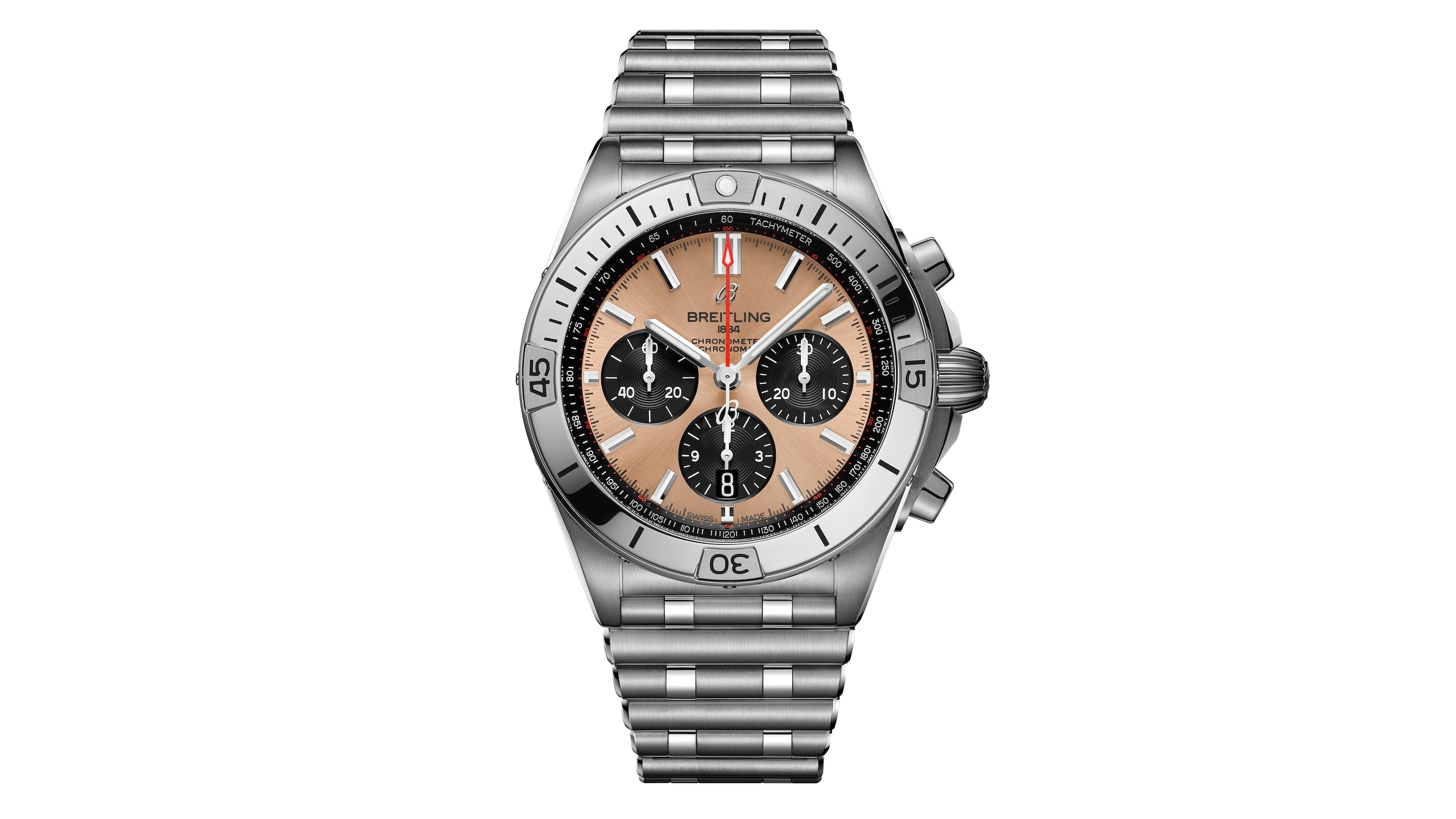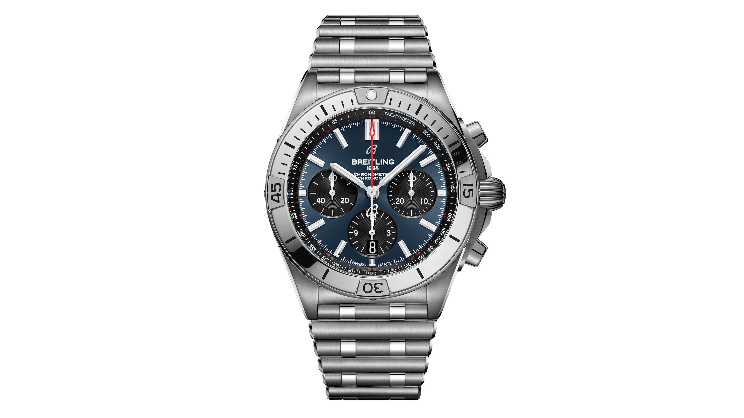搭載するのはブライトリングの自社製造ムーブメントで、2009年の発表以来、厚い信頼を得ているキャリバー01。各種フラッグシップモデルに採用されている自動巻きクロノグラフで、毎時2万8800振動で駆動する。元より頑強な作りで信頼性が高いが、自動巻きとクロノグラフ機構がモジュール化されており、それぞれにメンテナンスを行うことも可能だ。100%クロノメーター宣言を遵守するブライトリングなので、もちろん精度も折り紙付きである。