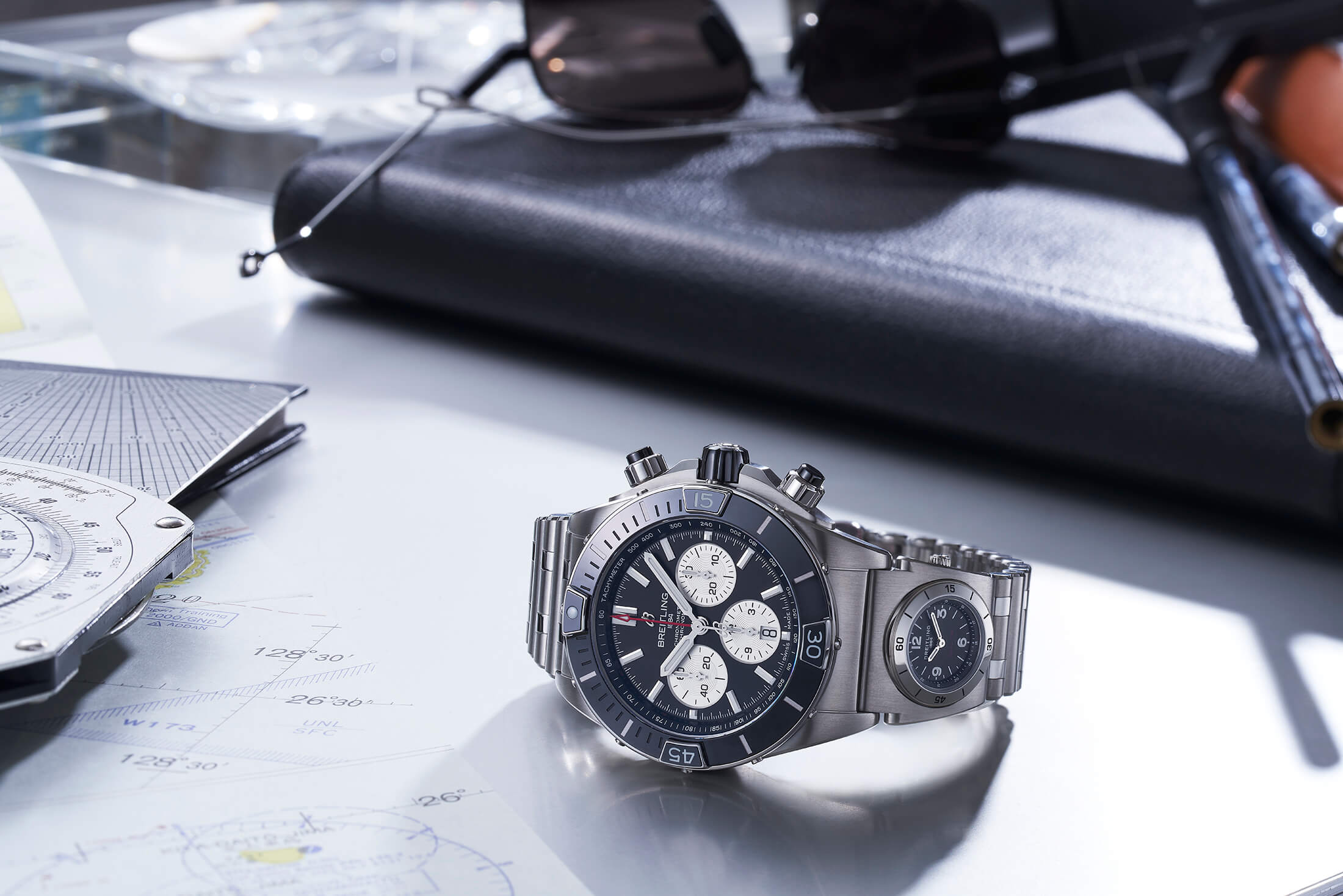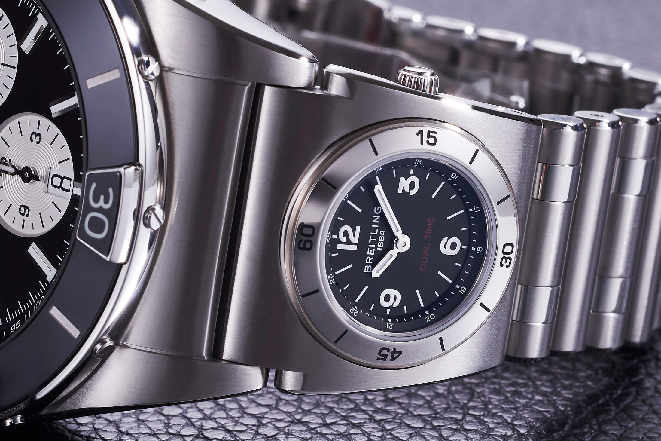 ルーロー・ブレスレットとライダータブを復活させた新生クロノマットに続き、スーパー クロノマットもまた、ブライトリングの象徴であった機能を再び表舞台に登場させた。ブレスレットに組み込んだもう一つの時計で第2時間帯を確認できるようにしたUTCモジュールである。この画期的な機能がクロノマットに搭載されたのは1990年頃のこと。メインウォッチの動作状態に影響を受けず、ダイヤルが煩雑にならないため二つの時刻を瞬時に読み取れるメリットをもったUTCモジュールは、以後クロノマットをはじめとするブライトリングの主要コレクションに取り入れられてきた。実用的で見た目のインパクトも強い機能ゆえに長らくファンの支持を獲得していたが、2006年を最後にアナログのUTCモジュールはその姿を消してしまう。