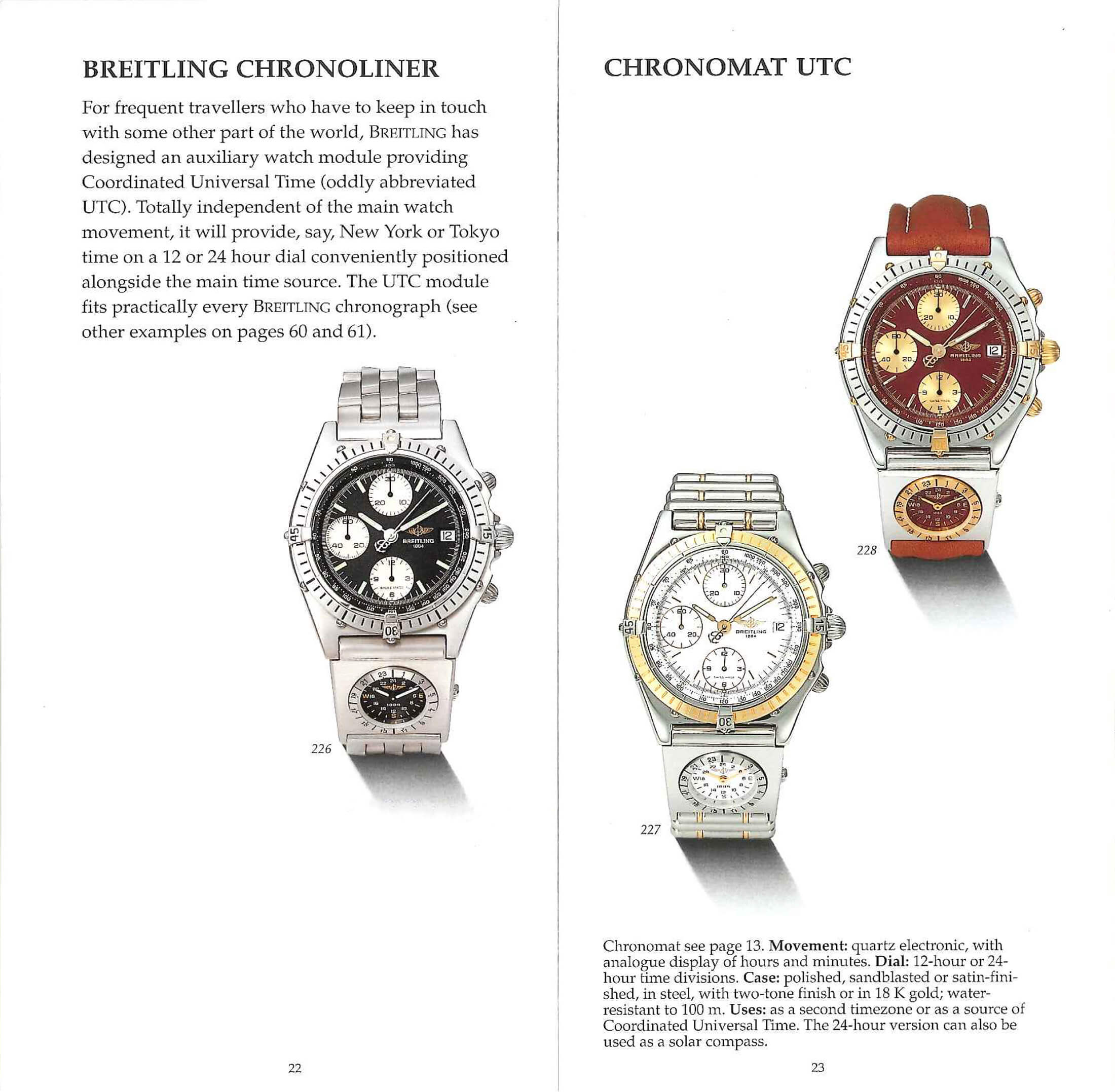 UTCモジュールを備えたモデルは1980年代から存在したが、クロノマットに搭載されたのは1990年代から。こちらは1992年発行の総合カタログだ。SSモデルだけでなく、18KゴールドツートンUTCモジュールも確認できる。