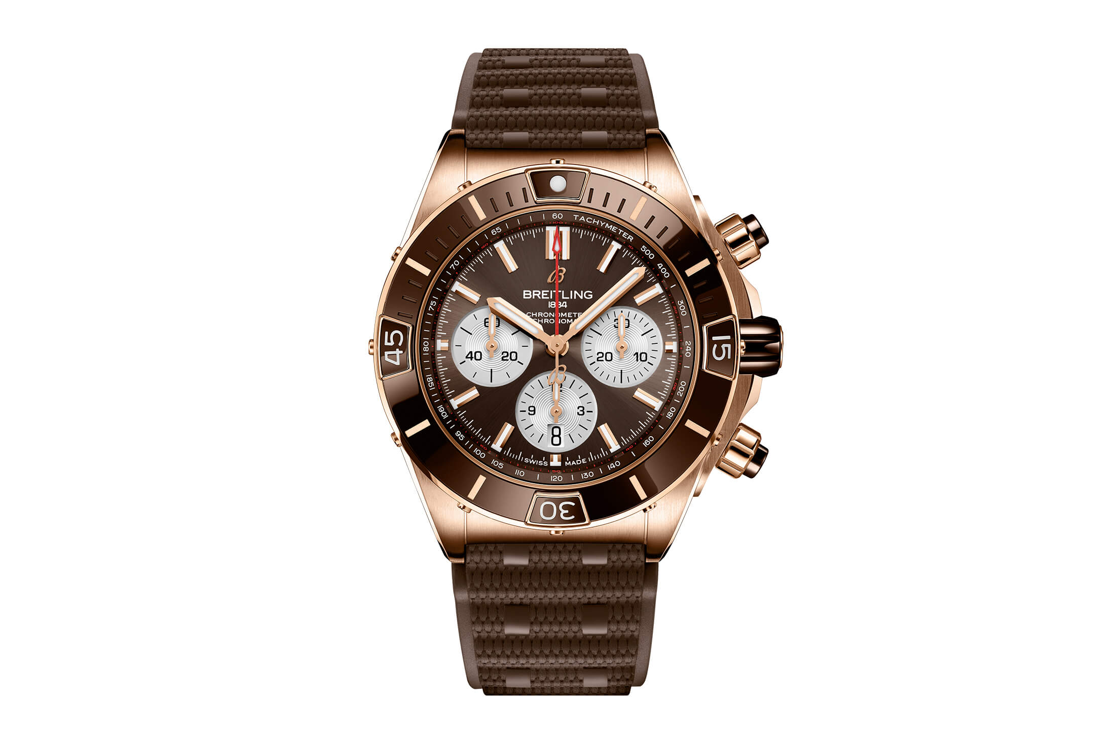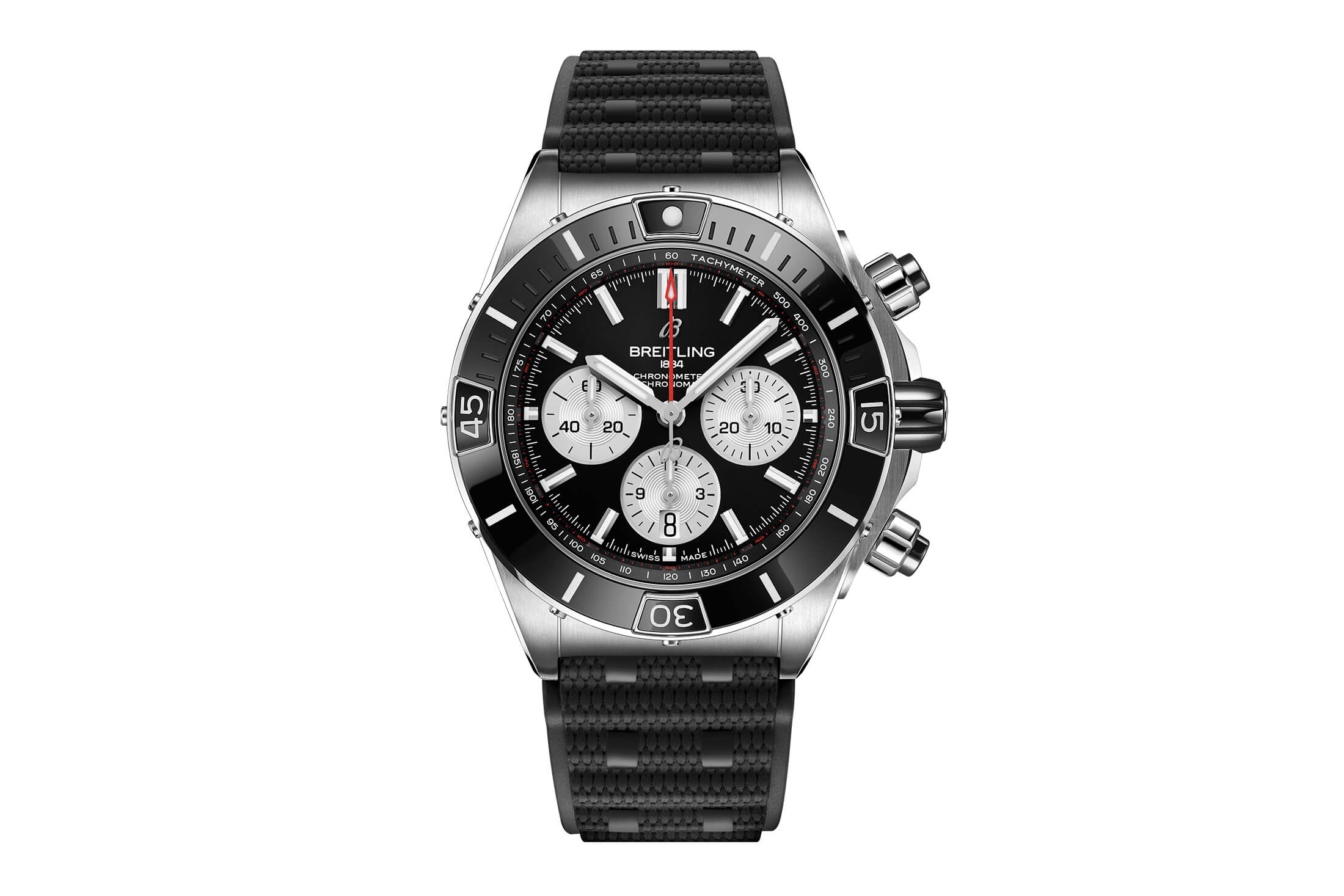 アイコニックなルーロー・ブレスレットにインスパイアされたラバーストラップモデル。スーパー クロノマットでは、昨年登場したクロノマットB01 42では設定がなかった、ラバーストラップモデルを選択することができる。