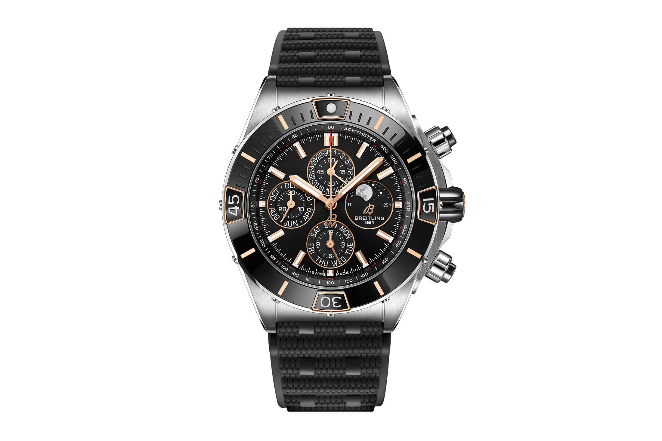 スーパー クロノマット 44の機能バリエーションとして登場したセミパーペチュアルカレンダーモデル。スタンダードなスーパー クロノマット B01 44と同様、ベゼル、クロノグラフのプッシュボタン、リューズにセラミックインサートを採用。SSケース、ラバーストラップ。ケース径44mm。100m防水。自動巻き Cal.ブライトリング 19。