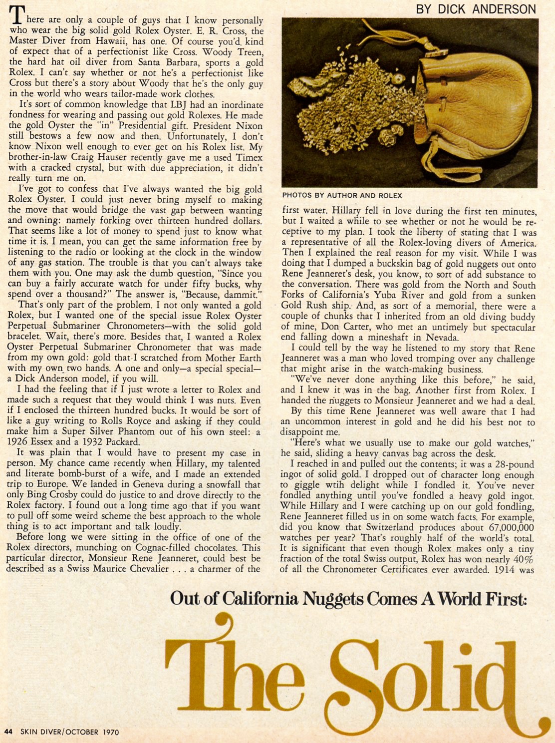 しかし1970年に、スキンダイバー誌がギリアム氏の記憶に残る記事を掲載した。それはスキューバダイビング初期の先駆者であり、真に伝説的なダイバーであるディック・アンダーソン(Dick Anderson)のあるミッションを記録したものだった。アンダーソンは自前の金塊をロレックスに提供し、それを使って時計を作るように依頼した。突飛な思い付きだが、結局ロレックスはそれに従い、アンダーソンに彼が求める時計を作った。金無垢のロレックスだ。当時ロレックスの営業部長であったレネ・ジャンヌレ(René Jeanneret)はアンダーソンにその時計を寄贈した際、彼にこう言った「どうかためらわずにダイビングに着けて行って欲しい」。