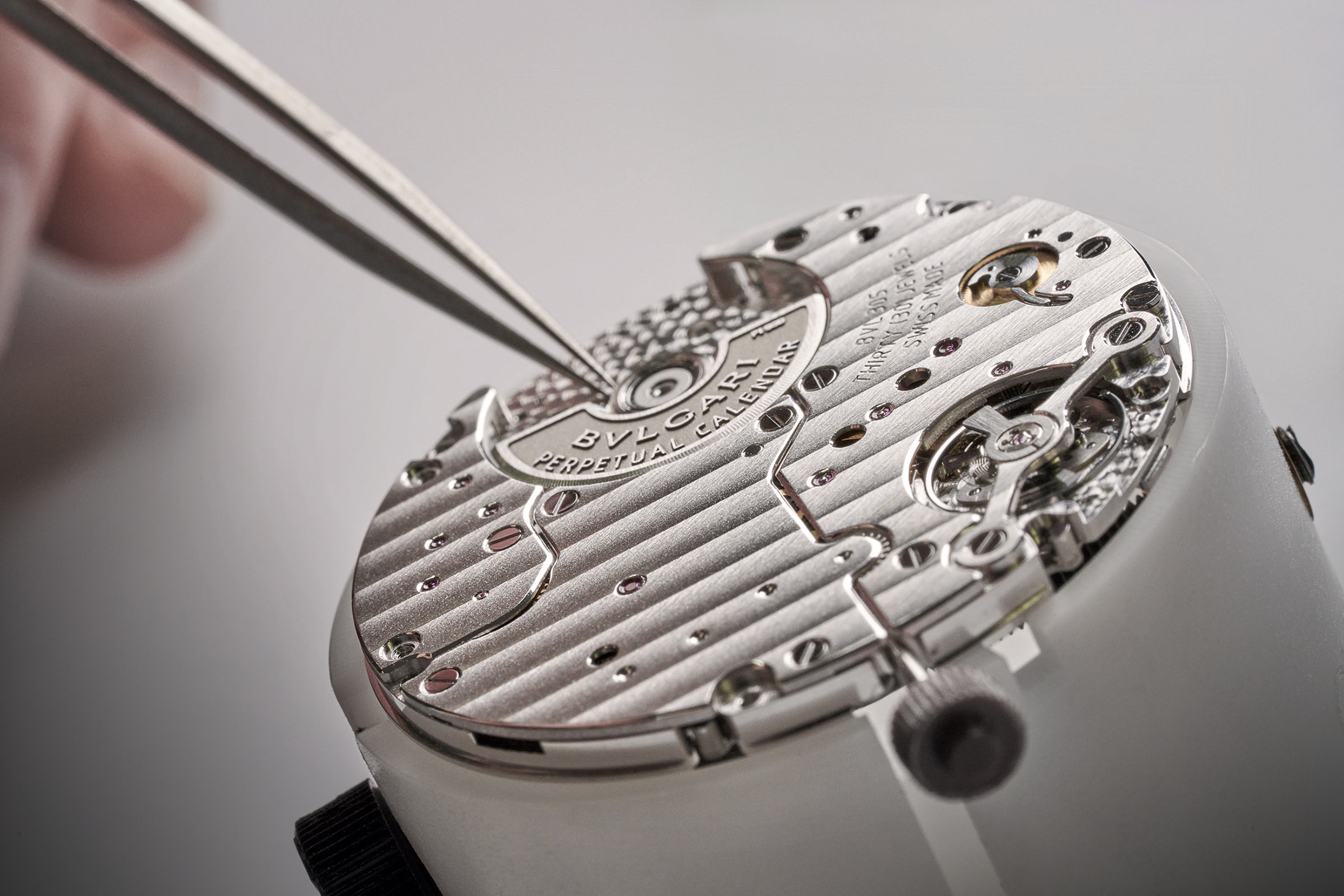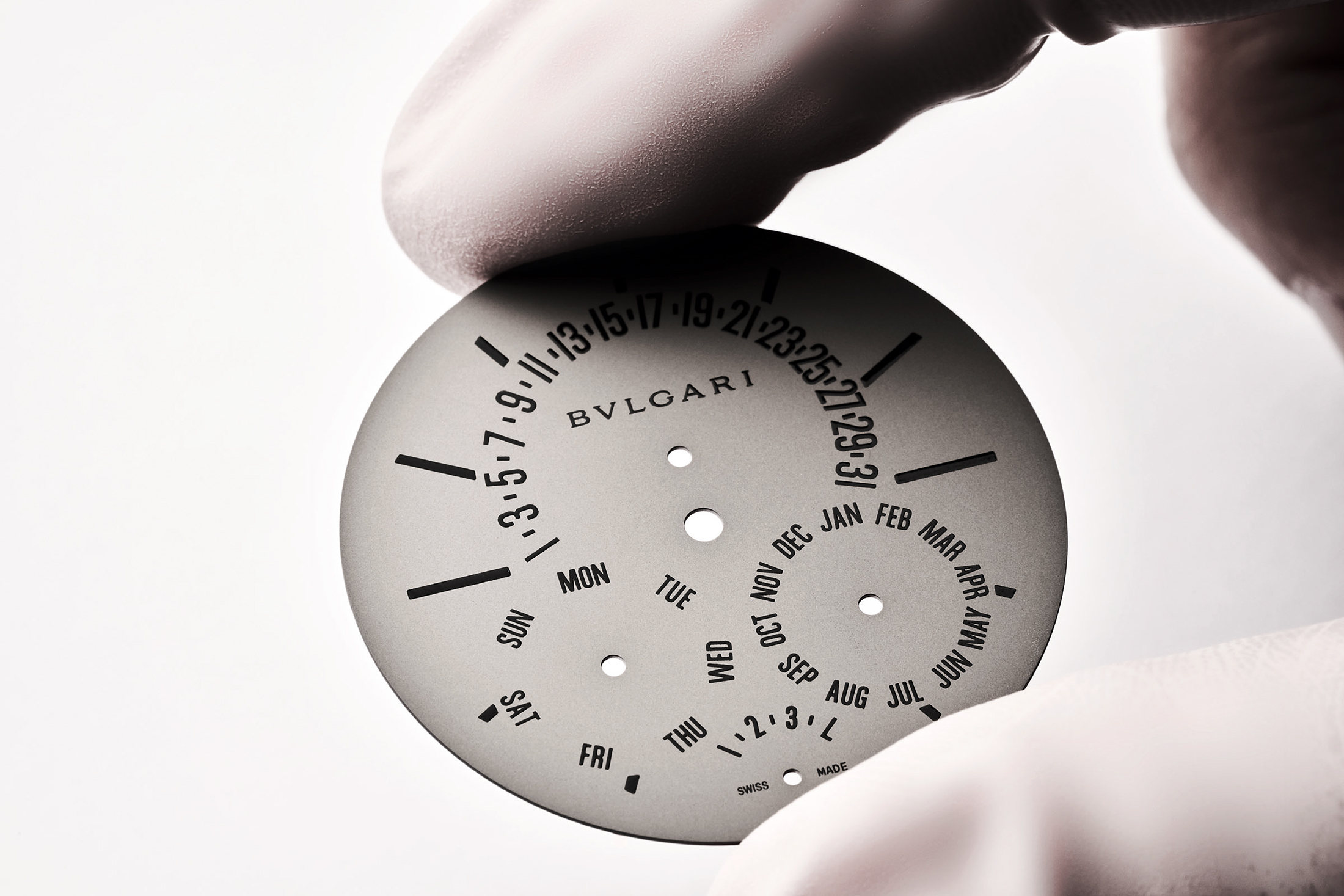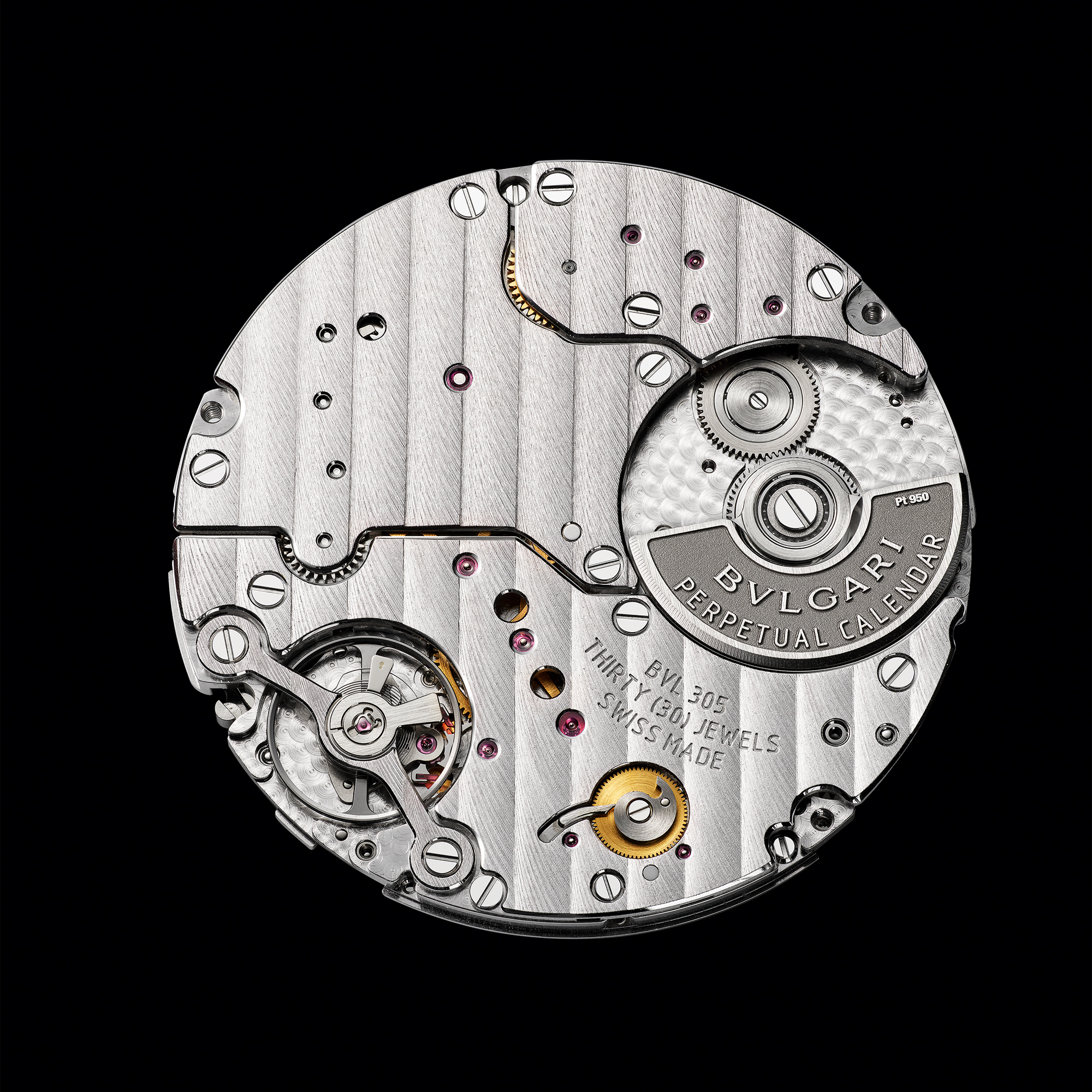 パーペチュアルカレンダーと同様に、この時計の複雑さの多くはダイヤルの下に隠されている。これはパーペチュアルカレンダーだけでなく、リピーターウォッチにとっても伝統的なキャドラチュール(ダイヤル下の機構)の位置だ。キャリバーBVL 305は、オクト フィニッシモ オートマティックに搭載されている時刻表示のみバージョンと比べて、少なくともケースバック越しに大きな違いはない(オクト フィニッシモ オートマティックはキャリバーBVL 138を使用している)。