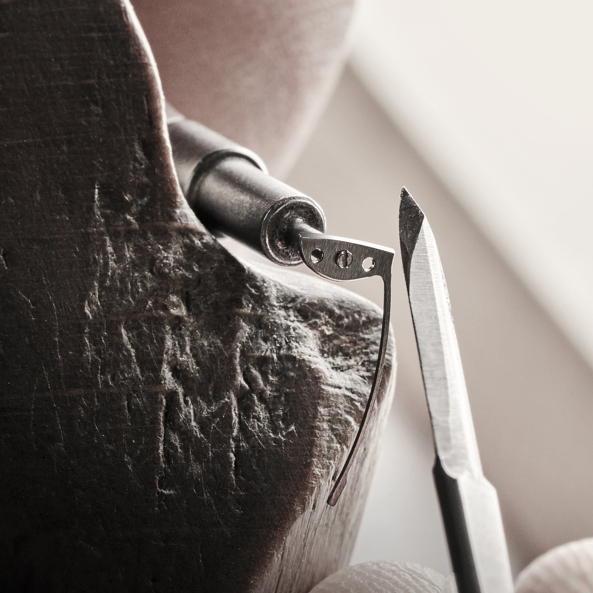 組み立てられた時計のダイヤルと比較するだけで、各針の軸を簡単に見つけることができる。中央には時分針の軸がある。そのすぐ上には、レトログラード式の日付表示用の針がある。この2つの間を6時の方向に直線で結ぶと、うるう年用の針(小さい)が見えてくる。時針と分針の軸の下、およそ4時と8時の左右には、右に月表示用の軸、左には曜日表示用の軸がある。曜日針の軸のすぐ下には、7枚の歯をもつ歯車があり、1日に1回、この歯車が割り出し曜日表示が進む。右側の3時位置には、巻き上げと設定のための巻き真カバー(リューズの位置)があり、その上下には、日付(2時位置)、月(4時位置)、8時位置には曜日の修正コレクターがある。