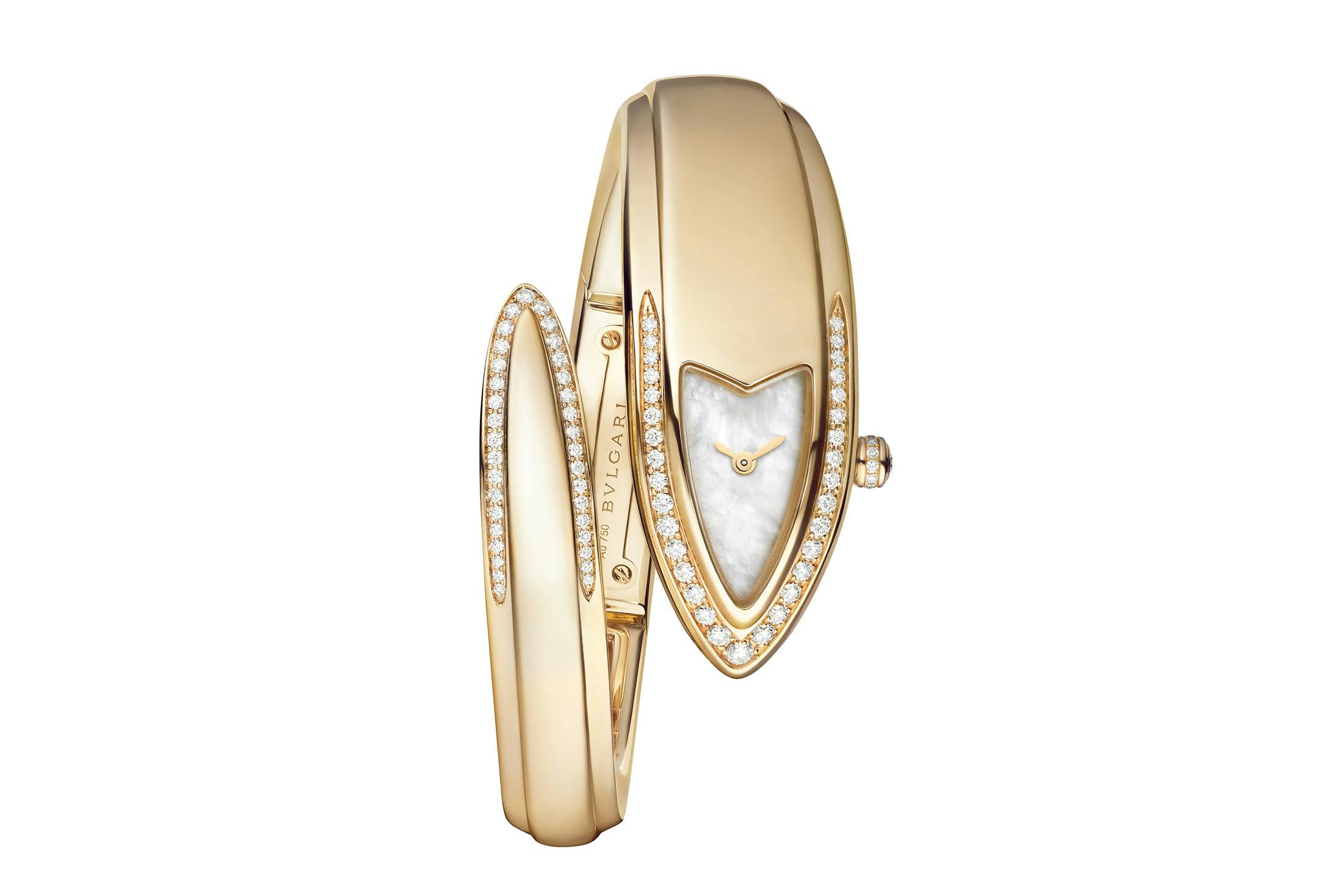 ブルガリはまた、セルペンティ エテルナにふたつの新しいバリエーションを追加した。こちらはトゥボガスブレスレットの代わりに、頭部と尾部で一周するシンプルなバングルを採用し、オリジナルへのオマージュを表現している。このシリーズでは、今回のWatches & Wondersにおけるラインナップのなかで唯一、全面に宝飾をあしらったモデルも登場する。
