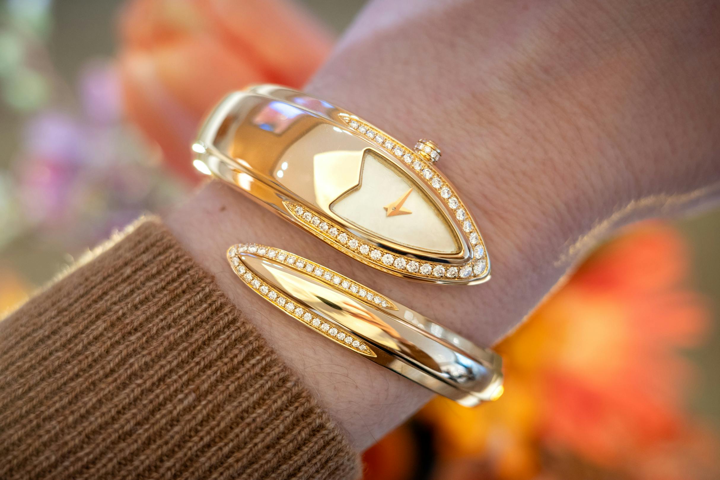 モデルの細部にまで適度にエレガンスが行き渡っており、クラシックなマザー・オブ・パールのダイヤルに加え、バングルブレスレットの両端、すなわち蛇の頭部と尾部にほどよく配されたダイヤモンドがその魅力を引き立てている。ラインナップ全体のなかで、Watches & Wondersに先立って実機をプレビューし、手に取ることができたのはこの1本のみだったが、控えめでありながらも、実にタイムレスで美しく、気負いがなく、そして着け心地も快適だった。非の打ち所がない。