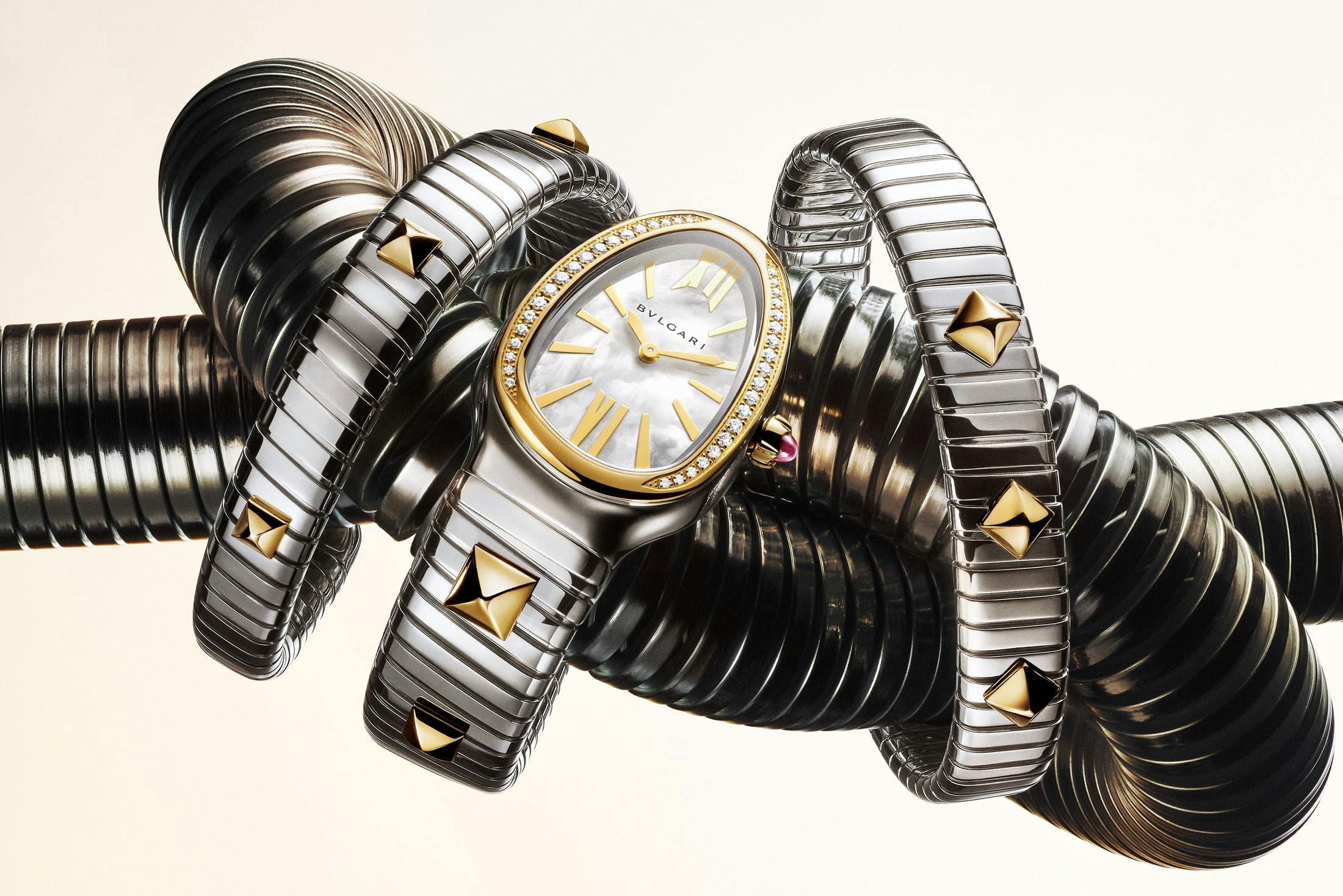 最新のセルペンティ トゥボガスは、異素材の組み合わせに焦点が当てられており、ツートン仕様が3つラインナップ。そのうちふたつはステンレススティール(SS)とイエローゴールド(YG)の組み合わせ、もうひとつはSSとローズゴールド(RG)の組み合わせだ。さらに、フルイエローゴールドのモデルも加わる。今回注目したいのは、“クルー(clou)”と呼ばれるスタッズ装飾が新たにブレスレットにあしらわれたことだ。これはフランス語由来のイタリア語で、“ハイライト”や“主役”、“要点”といった意味を持つ。