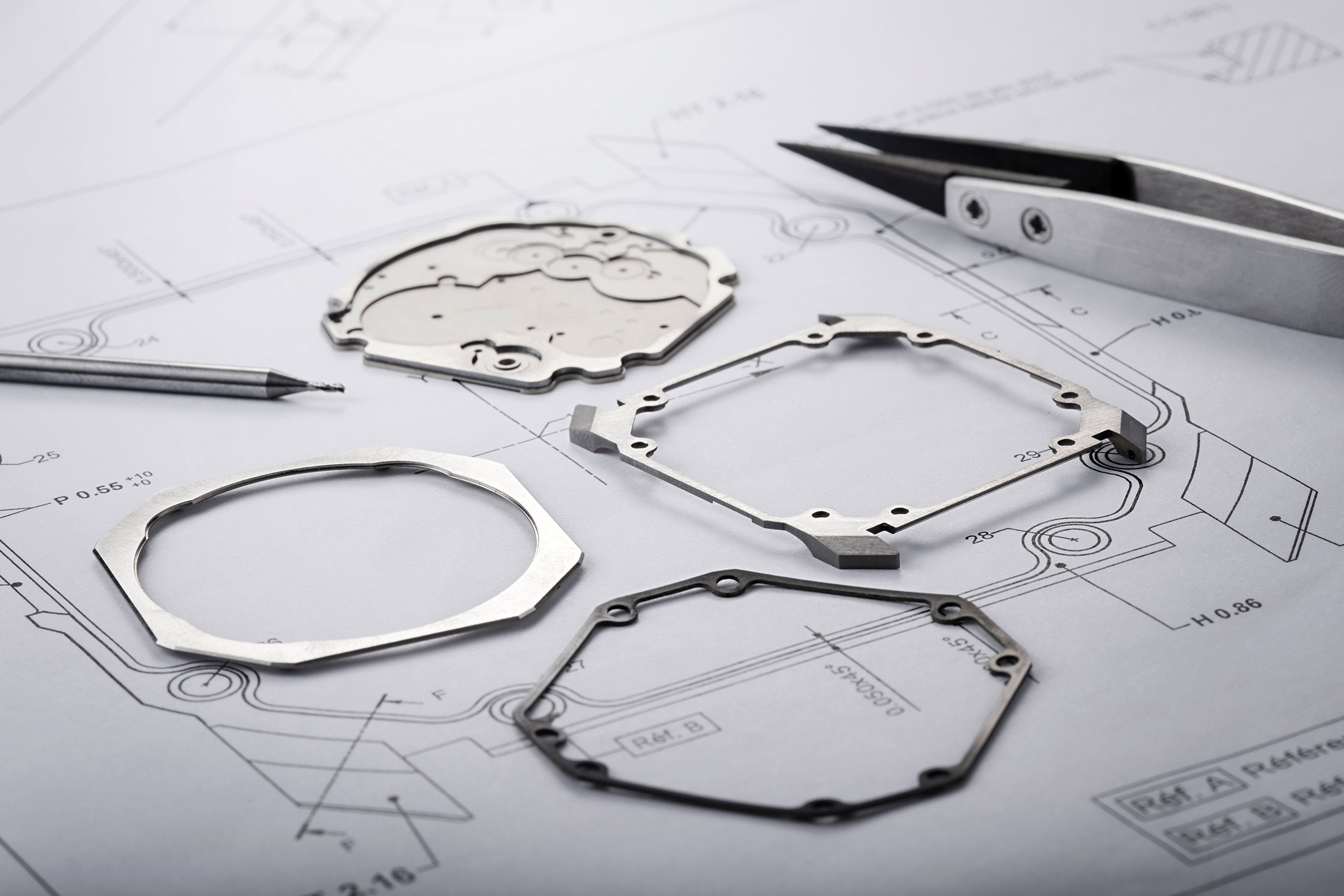 ケース素材。右から時計回りに、ベゼルとクリスタル風防、ムーブメントプレート/ケースバック、ケースボトム、ガスケット。
