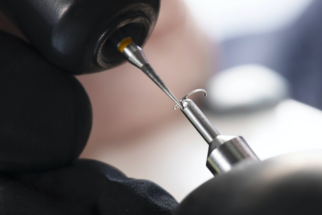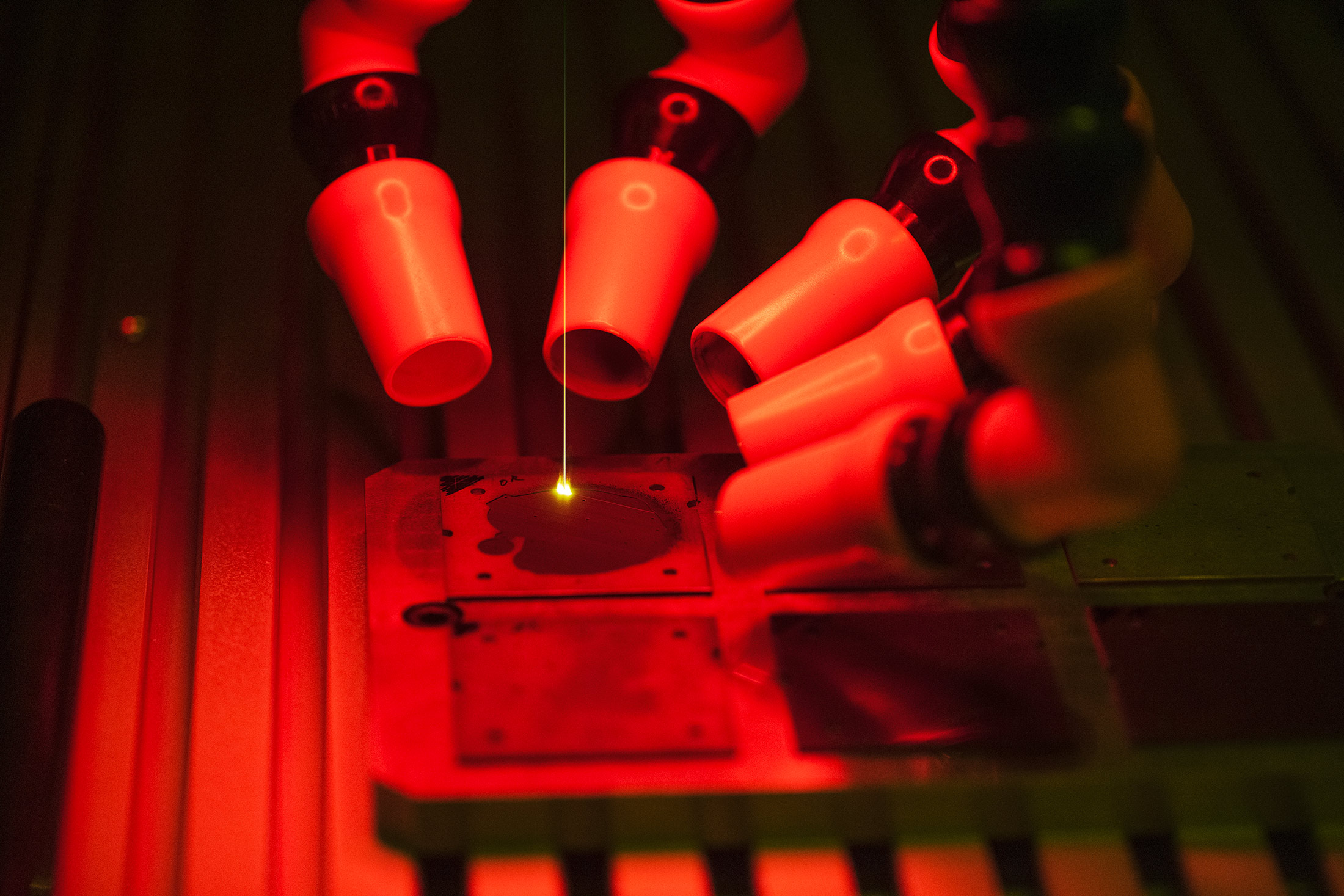タングステンカーバイドケースバック/メインプレートをレーザ加工する様子。