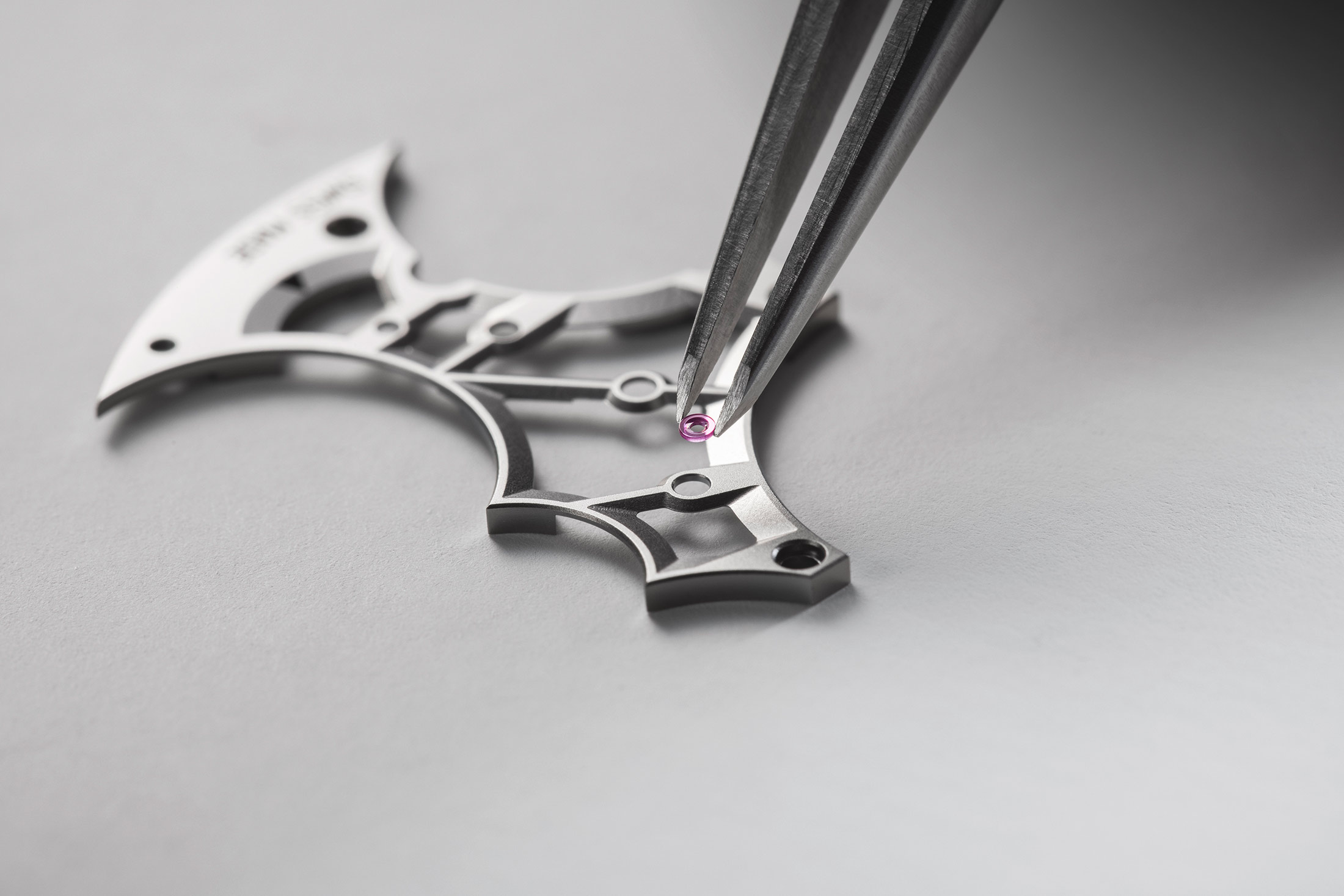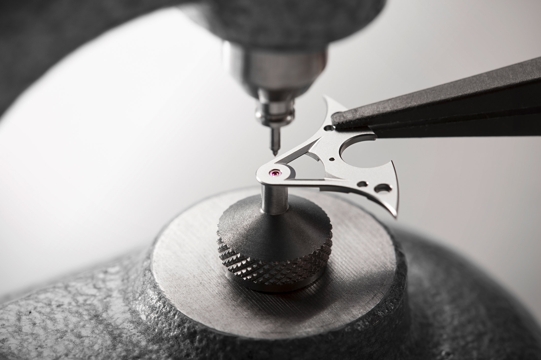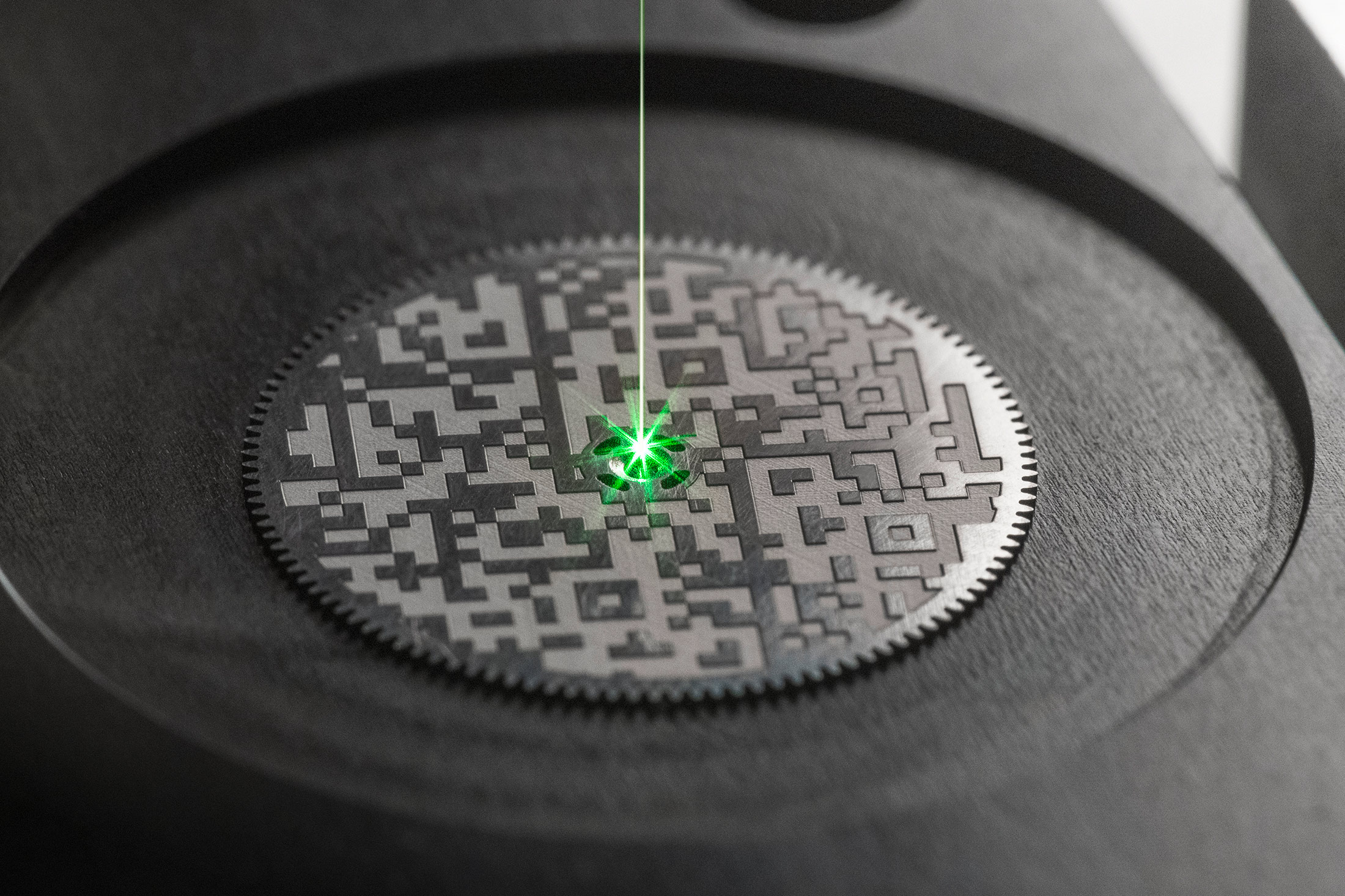 QRコードは、ゼンマイバレルのラチェットホイールにレーザー刻印されている。