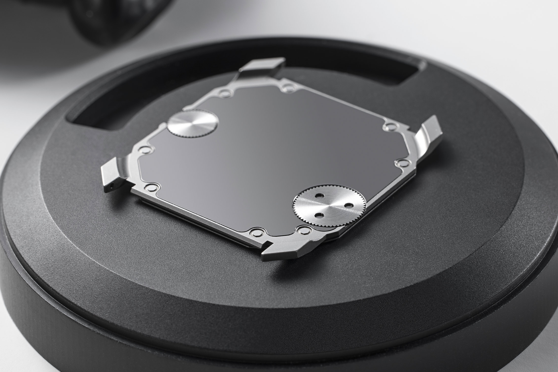 従来型のリューズはなく、ゼンマイの巻き上げや針合わせを行う輪列やクラッチ機構が不要なため、ムーブメントの省スペース化を実現。その代わりに、ローレット加工が施されたふたつの独立した水平の歯車(平らなツマミのようなものだ)がケース側面にセットされている。右側の歯車で時刻を調整し、8時位置にある左側の歯車でゼンマイを巻き上げる。設定ツマミにはニュートラルポジションと第2リューズポジションがないため、針の駆動輪は輪列からディファレンシャルギアで分離されており、針を設定する際に輪列の回転を妨げることが無いように設計されている。