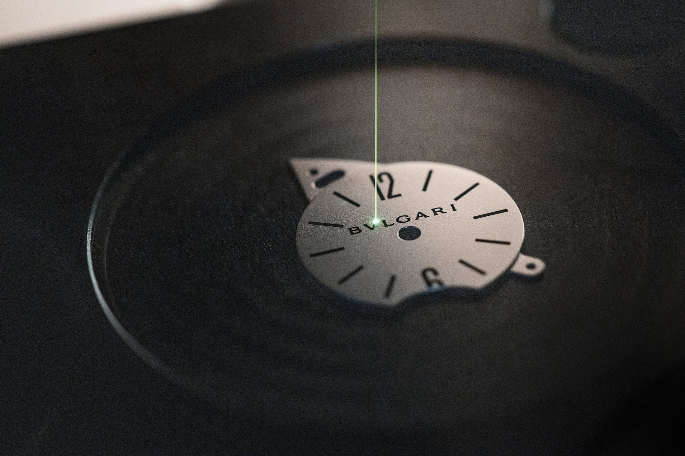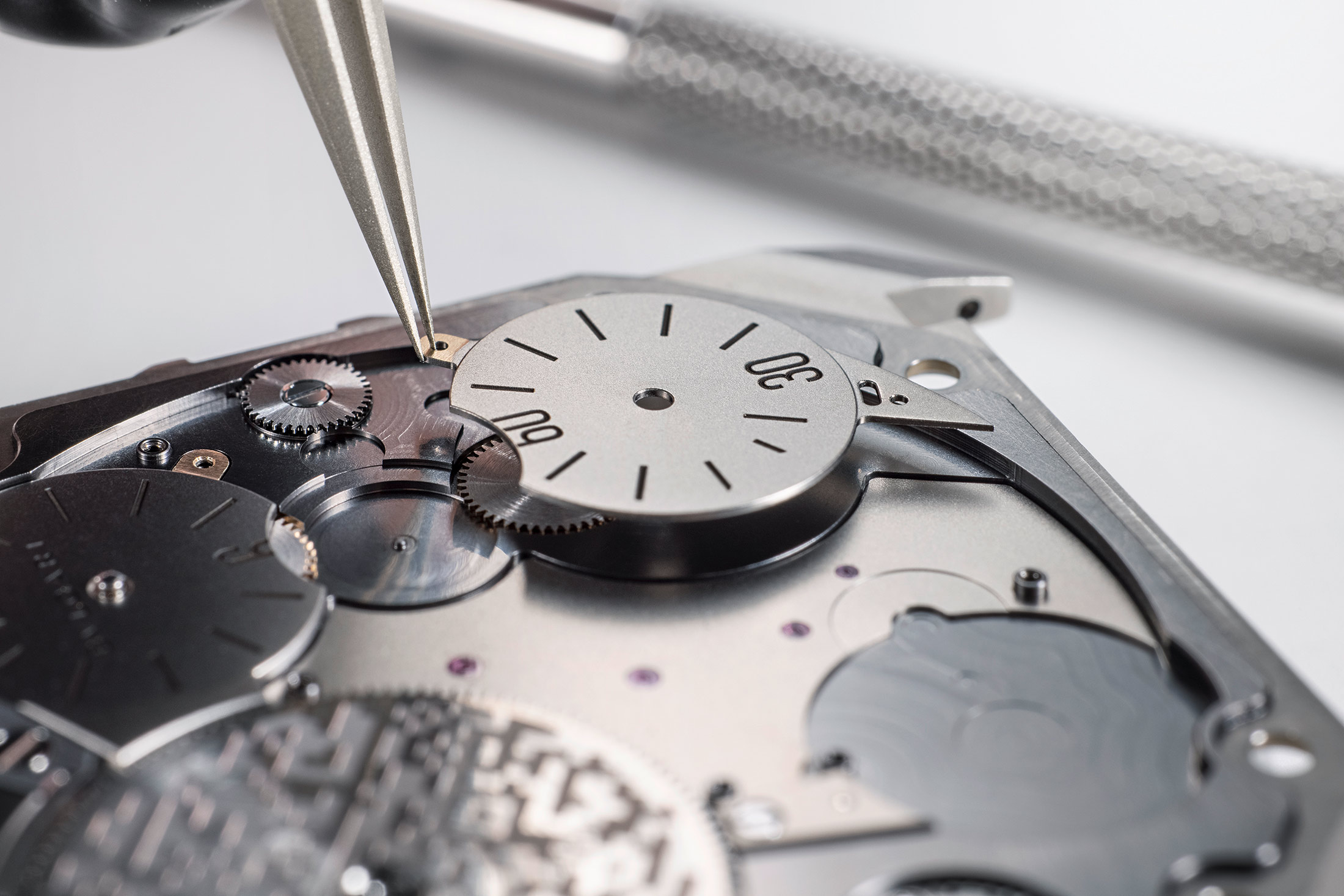 アルティプラノ アルティメート・コンセプトでは、時針と分針は通常のダイヤルのように配置されているが、(これも輪列レベルにまで下げられている)、ブルガリでは時分針にふたつの個別のサブダイヤルを用いている。ランニング・セコンドも表示されるが、これは輪列の動力の流れに直接連動している。